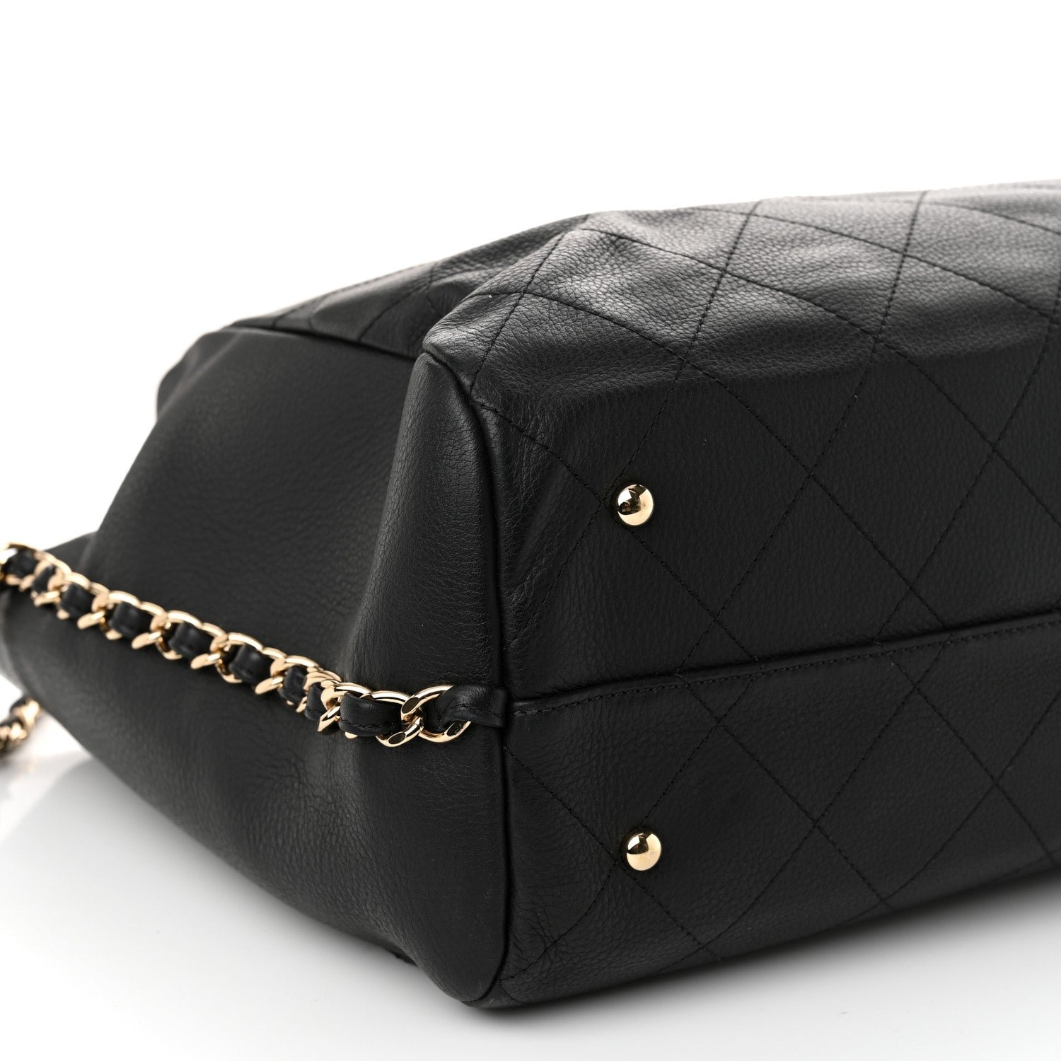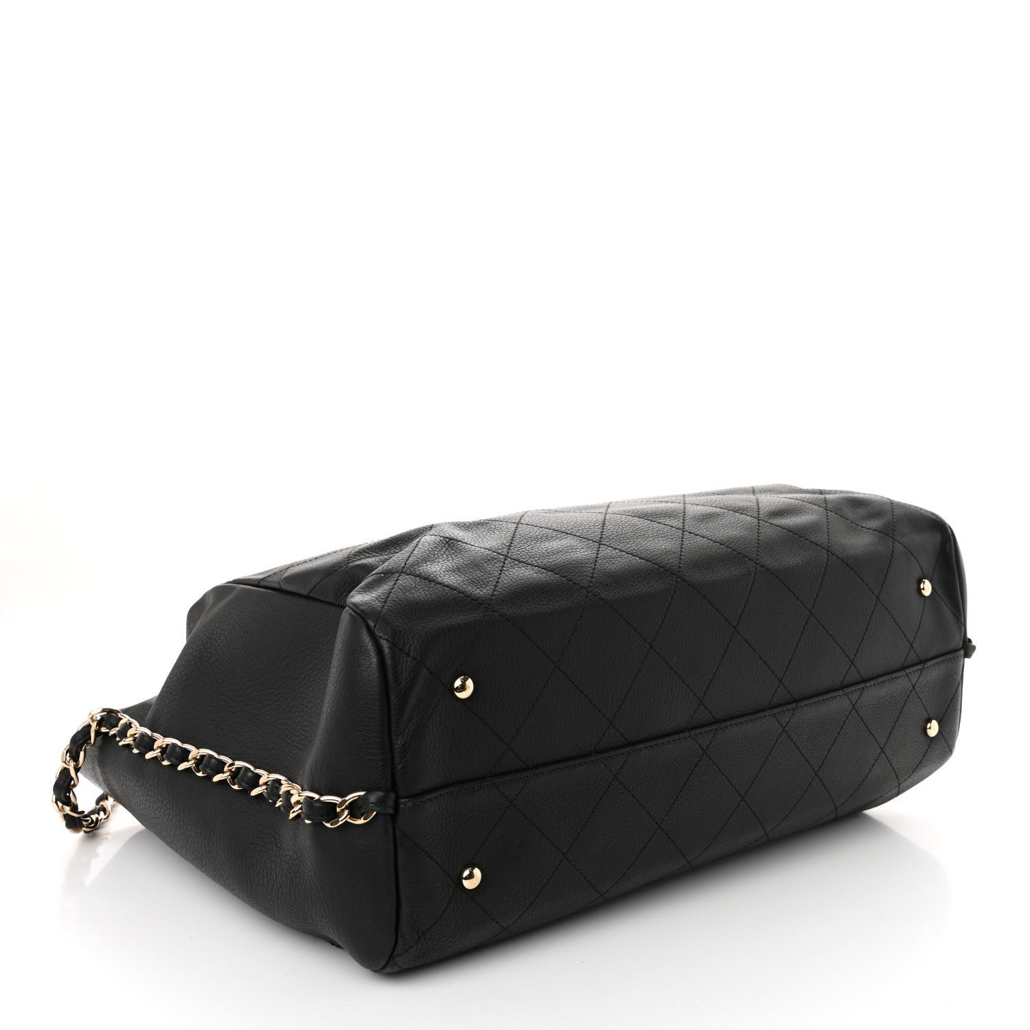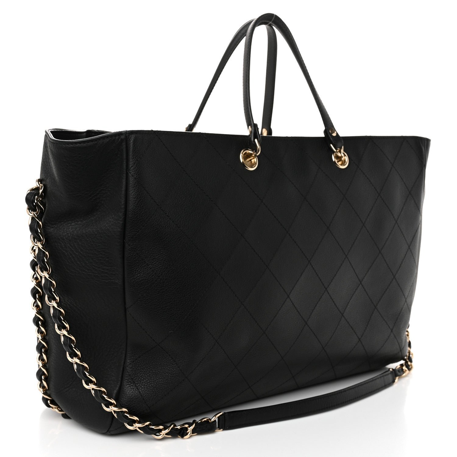 This is an authentic CHANEL Bullskin Stitched Large Shopping Bag in Black. This tote is beautifully crafted of diamond quilted calfskin leather in black. The bag features sturdy leather top handles. and a leather-threaded gold chain along the side panels of the bag that extends into a matching shoulder strap. The tote opens to a spacious black fabric interior with zipper and patch pockets.