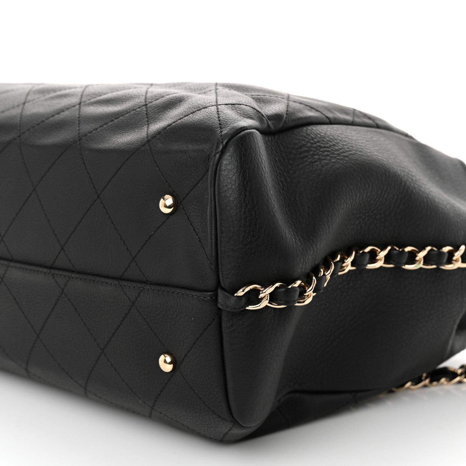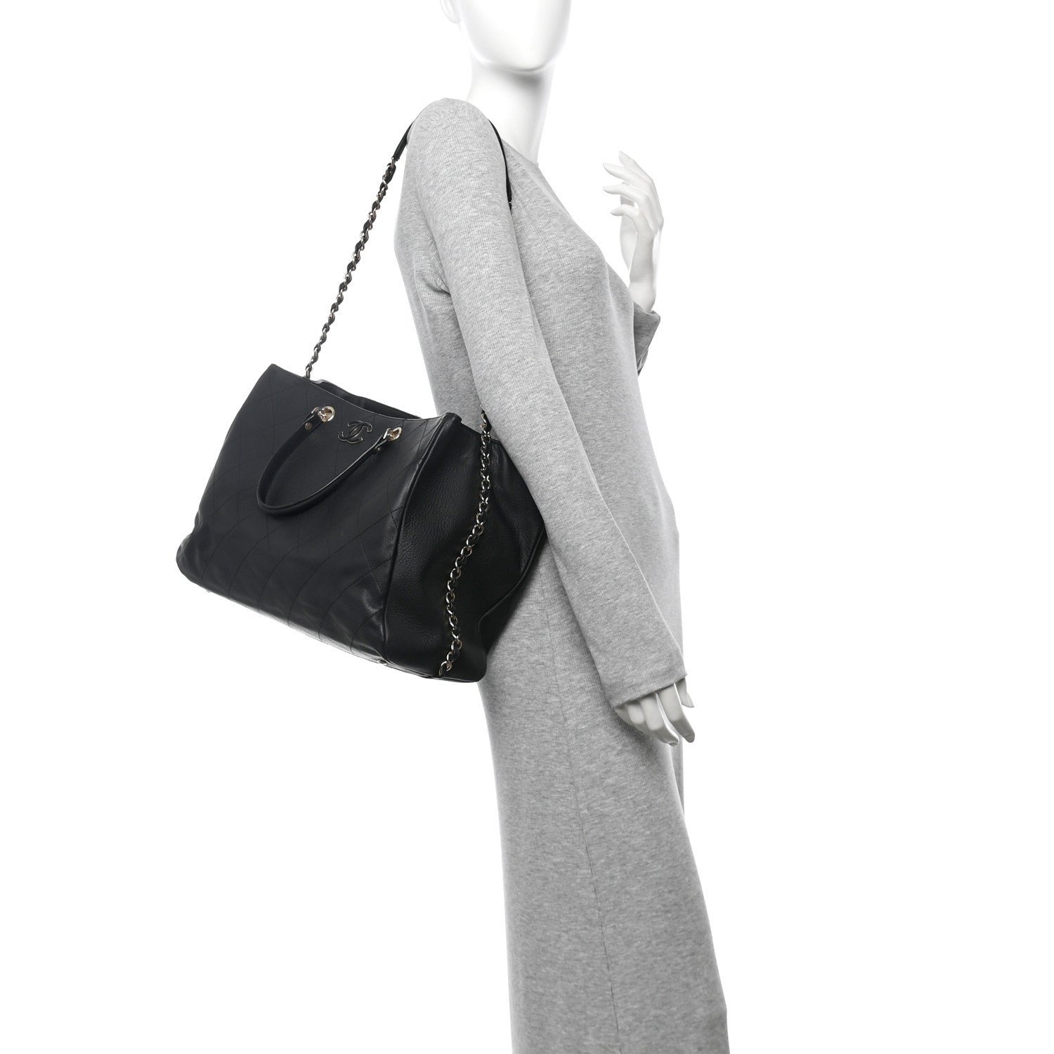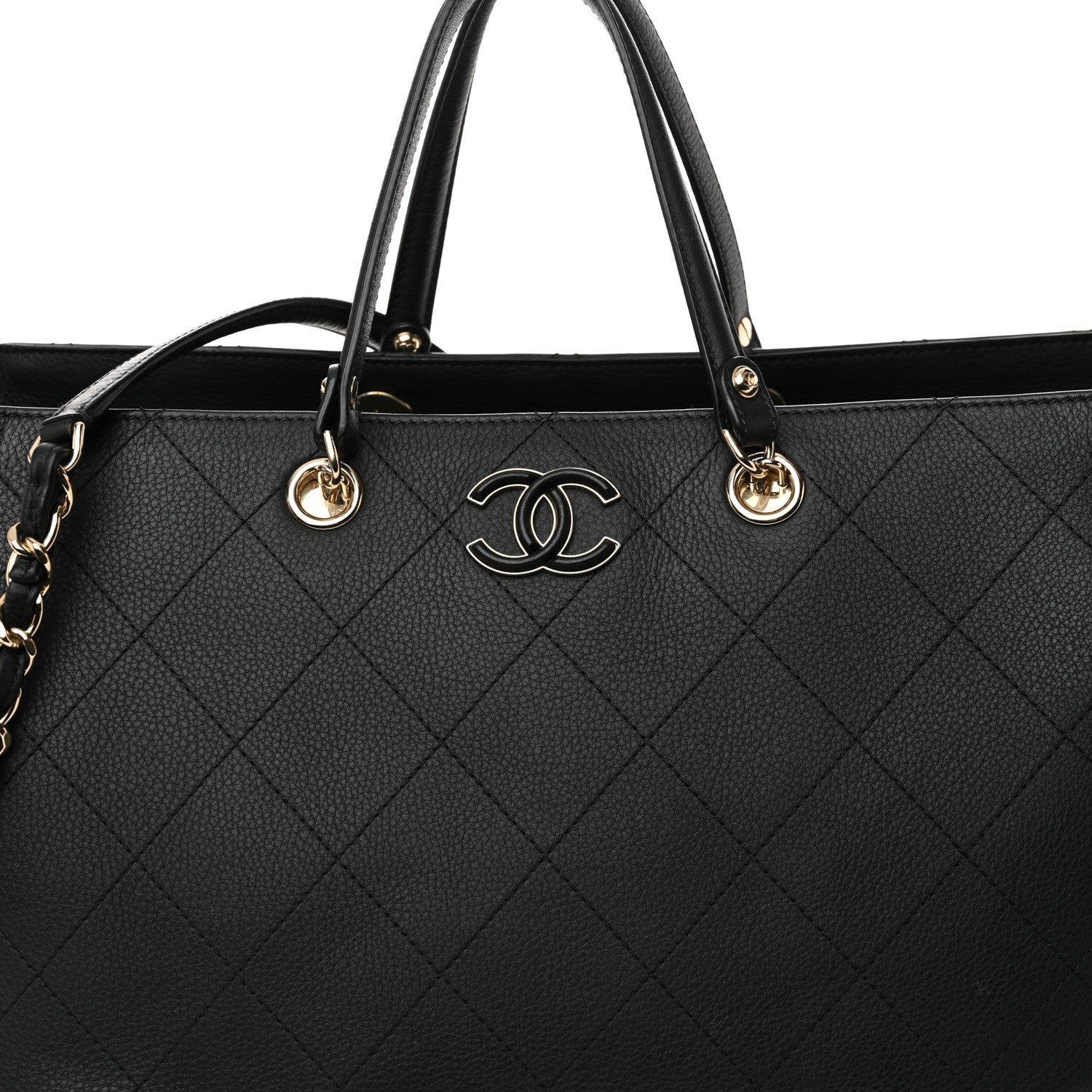 This is an authentic CHANEL Bullskin Stitched Large Shopping Bag in Black. This tote is beautifully crafted of diamond quilted calfskin leather in black. The bag features sturdy leather top handles. and a leather-threaded gold chain along the side panels of the bag that extends into a matching shoulder strap. The tote opens to a spacious black fabric interior with zipper and patch pockets.