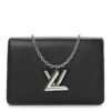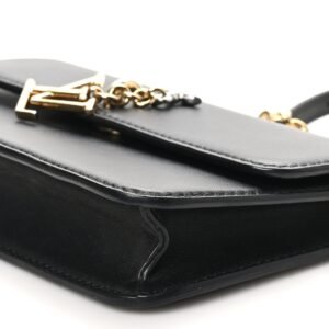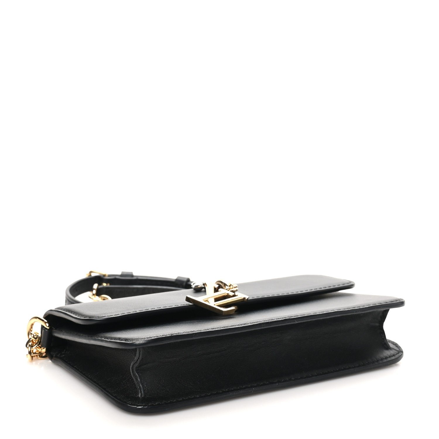 This is an authentic LOUIS VUITTON Calfskin LV Bloom Wallet On Chain in Black. This stylish handbag is crafted in black leather. The bag features a front flap that is adorned with two charms and a removable chain strap with black leather pad. The front flap opens to a black microfiber interior with card slots.