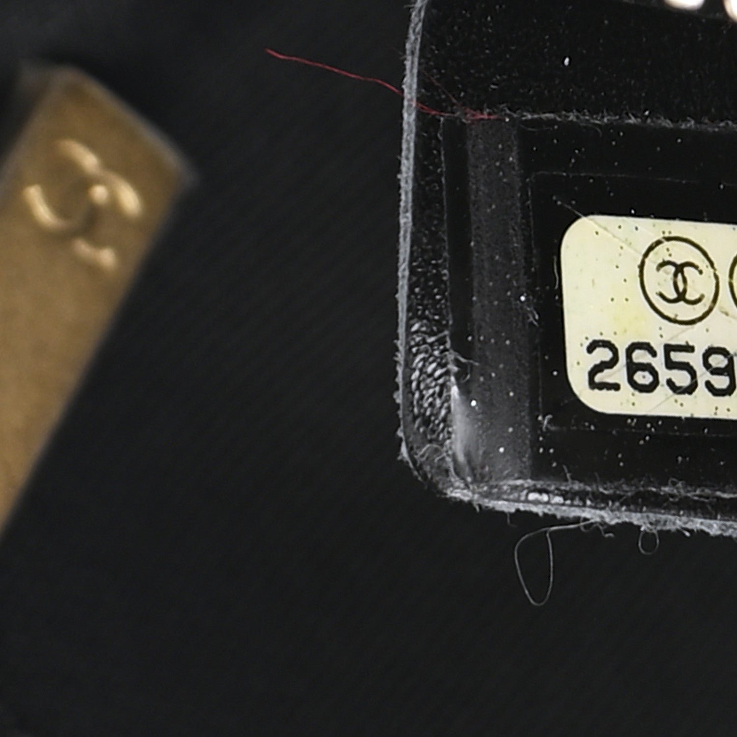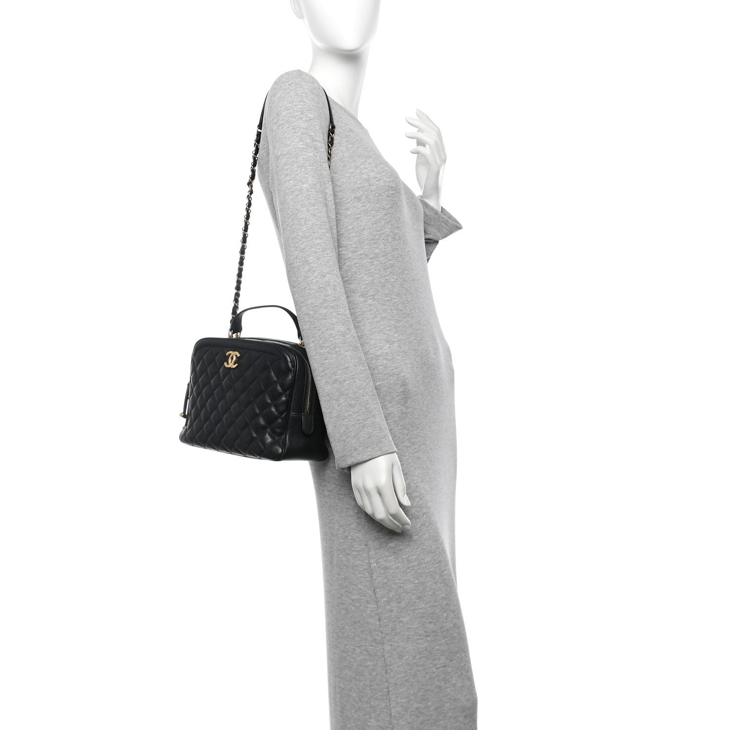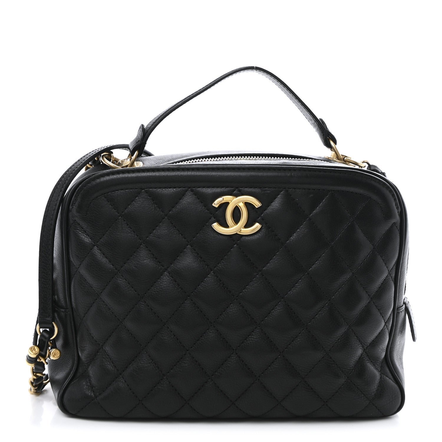 This is an authentic CHANEL Calfskin Quilted CC Medium Vanity Case in Black. This chictravel bag is crafted of diamond-quilted calfskin leather in black. It features a black leather handle.matte gold chain link black leather threaded shoulder straps and a Channel CC logo in gold. The two top zippers open to a black fabric interior with a zipper and patched pocket.