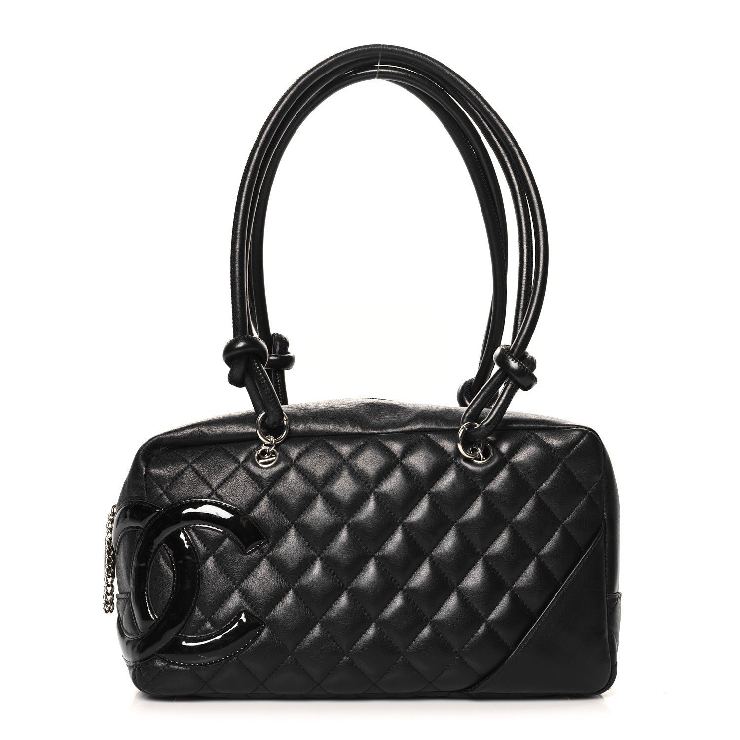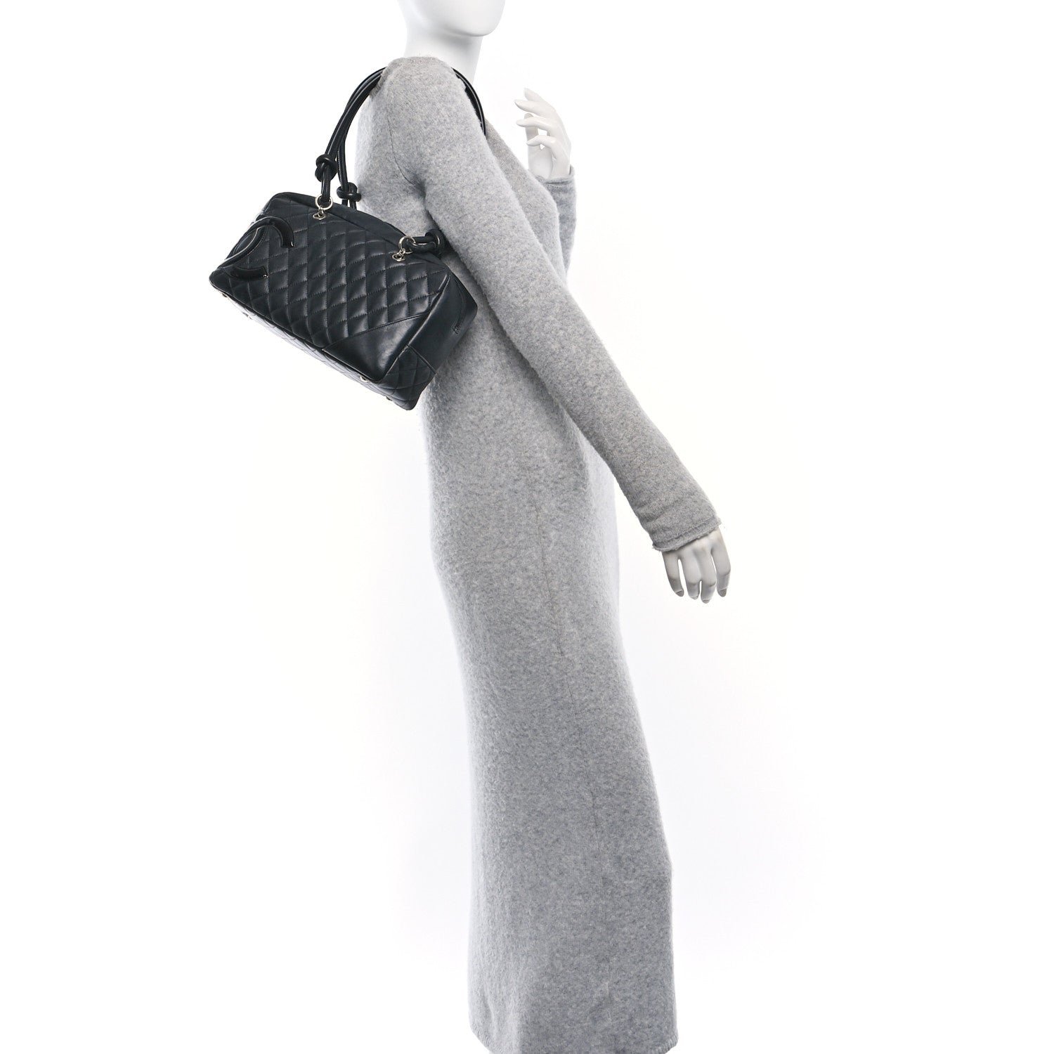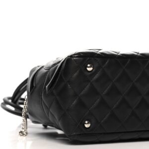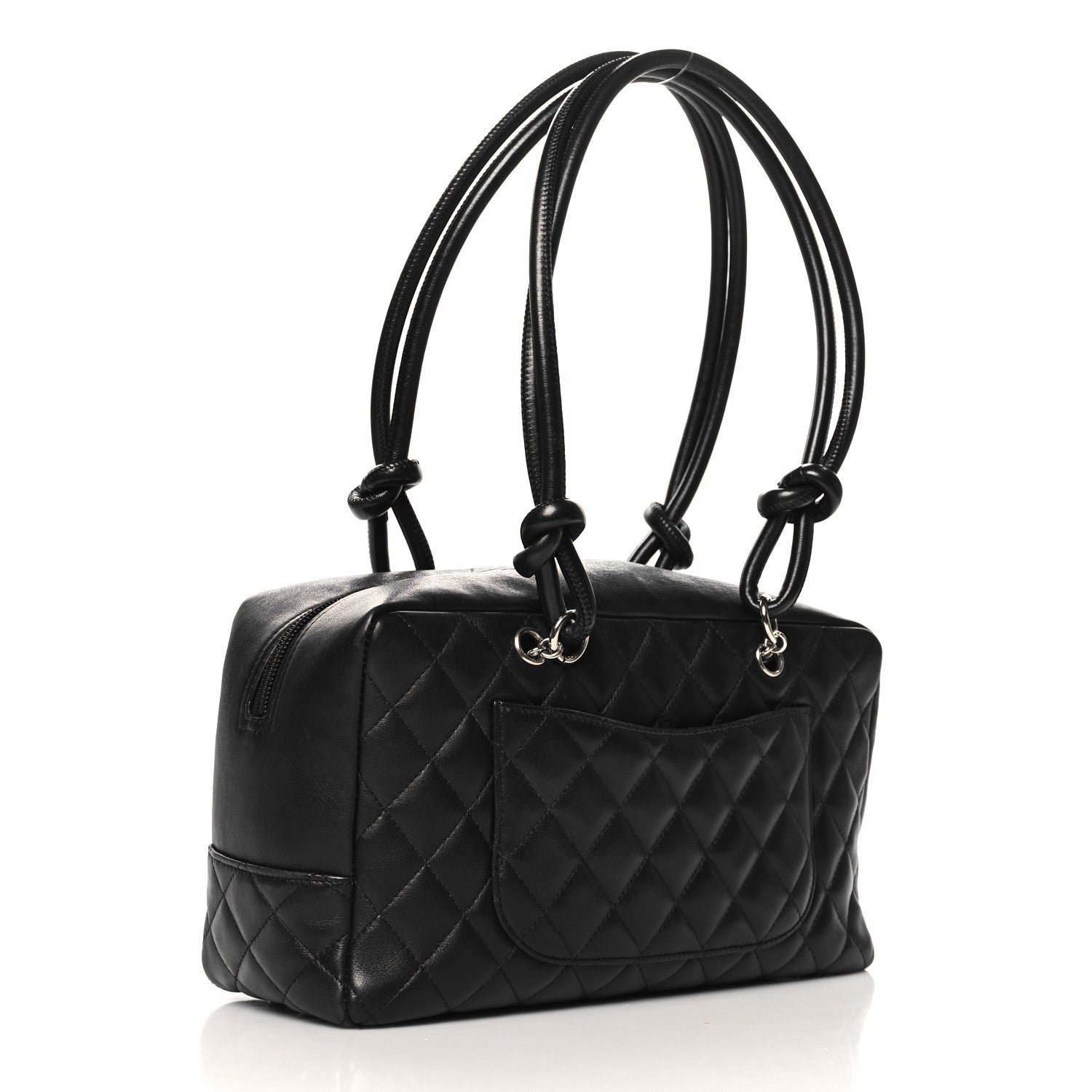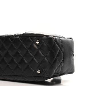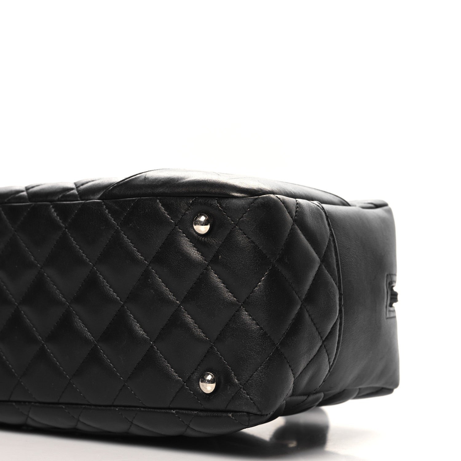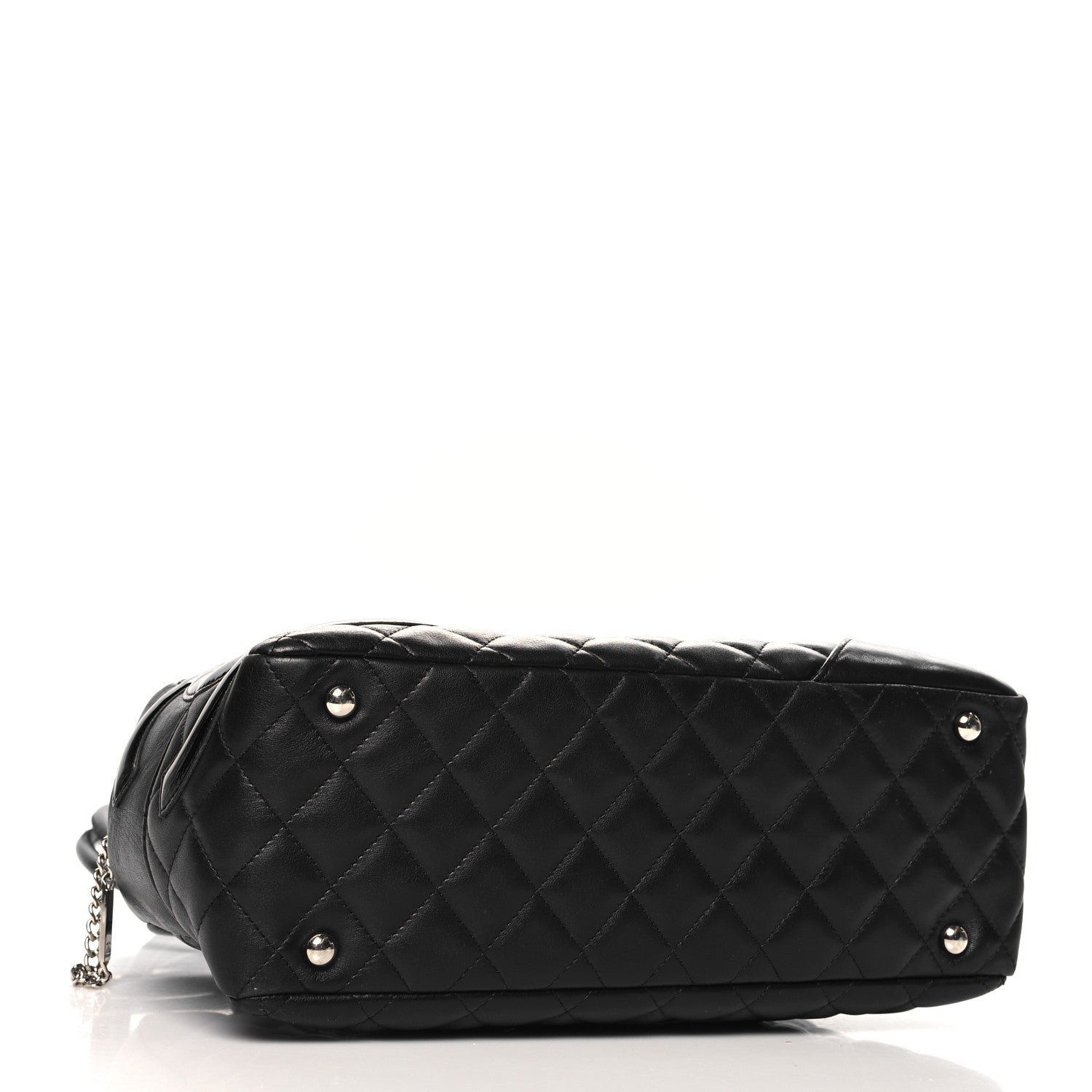 This is an authenticCHANEL Calfskin Quilted Large Cambon Bowler in Black. This distinctive shoulder is crafted of calfskin diamond-quilted leather in black. This bag features a signature of Chanel CC patch. a rear patch pocket. and thin rolled leather straps. The top zipper opens to a bright pink Chanel logo fabric interior with zipper and patch pockets.