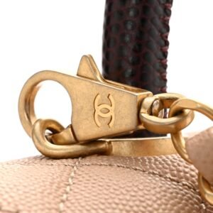 This is an authentic CHANEL Caviar Lizard Embossed Quilted Small Coco Handle Flap in Beige. This stylish and classic tote is crafted of diamond-stitched-grained caviar leather in beige. The shoulder bag features a purple lizard embossed top handle. a leather threaded aged gold chain link shoulder strap and CC turn lock closure. The flap opens to a matching fabric interior with a central zipper compartment. zipper and patch pockets.