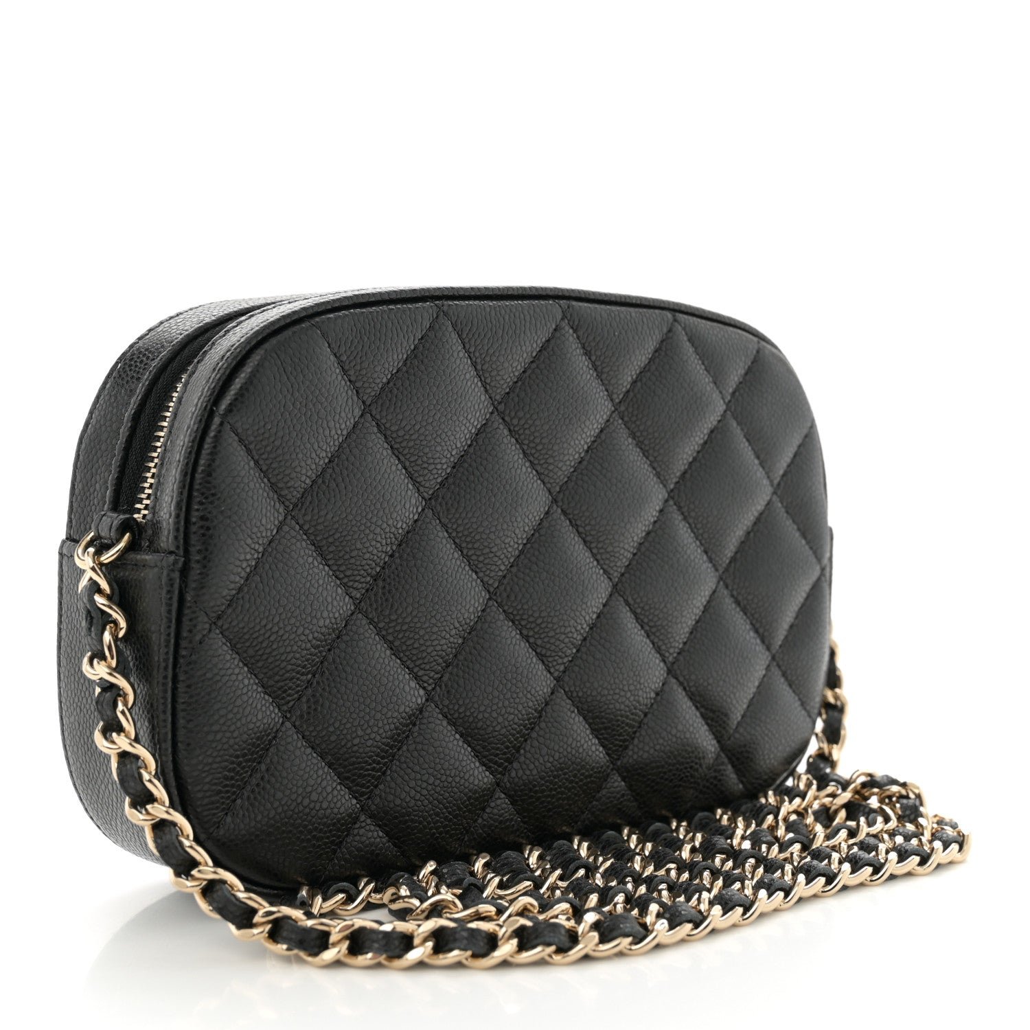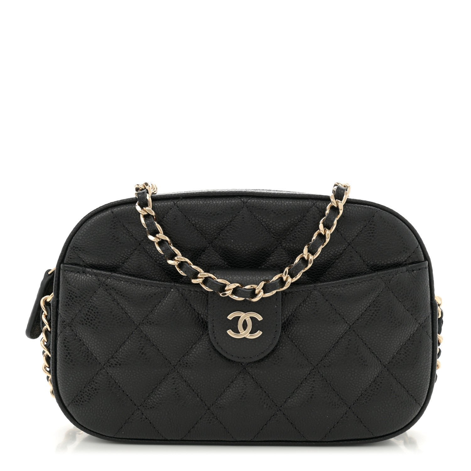 This is an authentic CHANEL Caviar Quilted Chain Camera Bag in Black. This chic mini crossbody classic is crafted of quiltedcaviar leather in black. The bag features a gold chain link leather threaded shoulder strap and a gold classic CC logo strap at the front pocket. The top zipper opens to a burgundy fabric interior with a patch pocket and card slots.