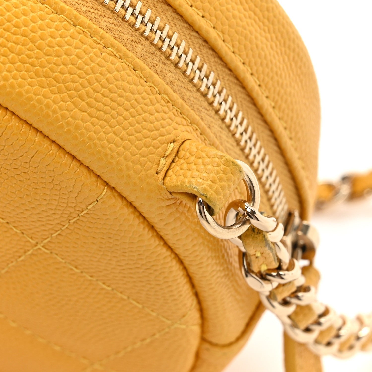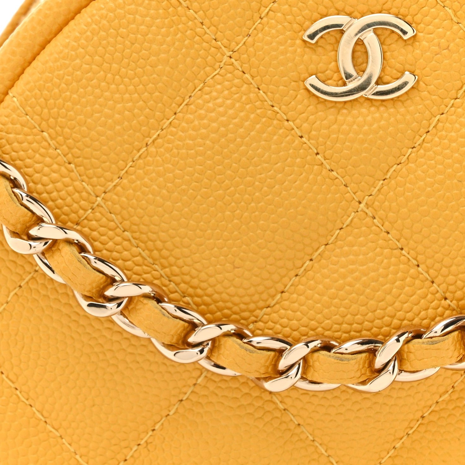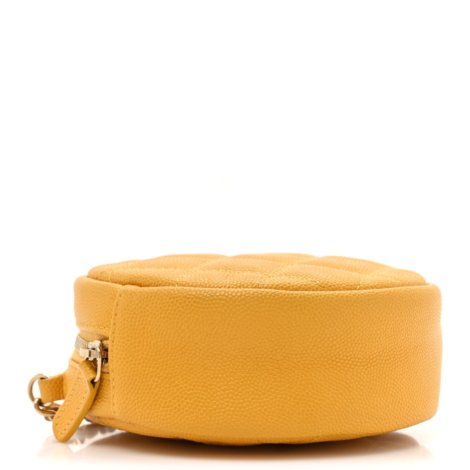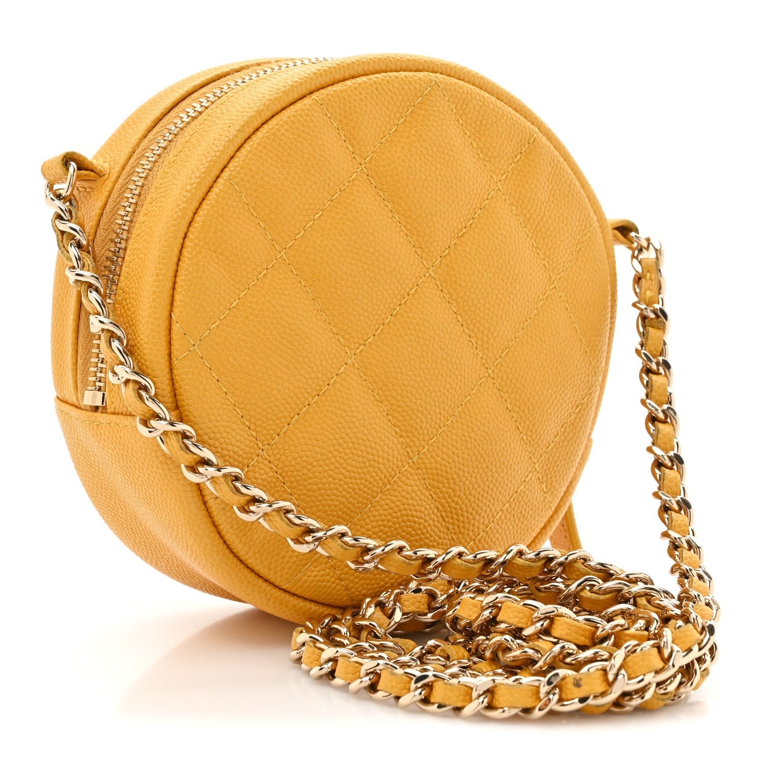 This is an authenticCHANEL Caviar Quilted Round Clutch With Chain in Yellow. This stylish crossbody clutch is crafted of luxurious caviar quilted leather in yellow. The shoulder bag features a leather-threaded light gold chain-link shoulder strap and a light gold Chanel CC logo on the front. Thisshoulder bag opens with a top zipper to a matching fabric interior with patch pockets.