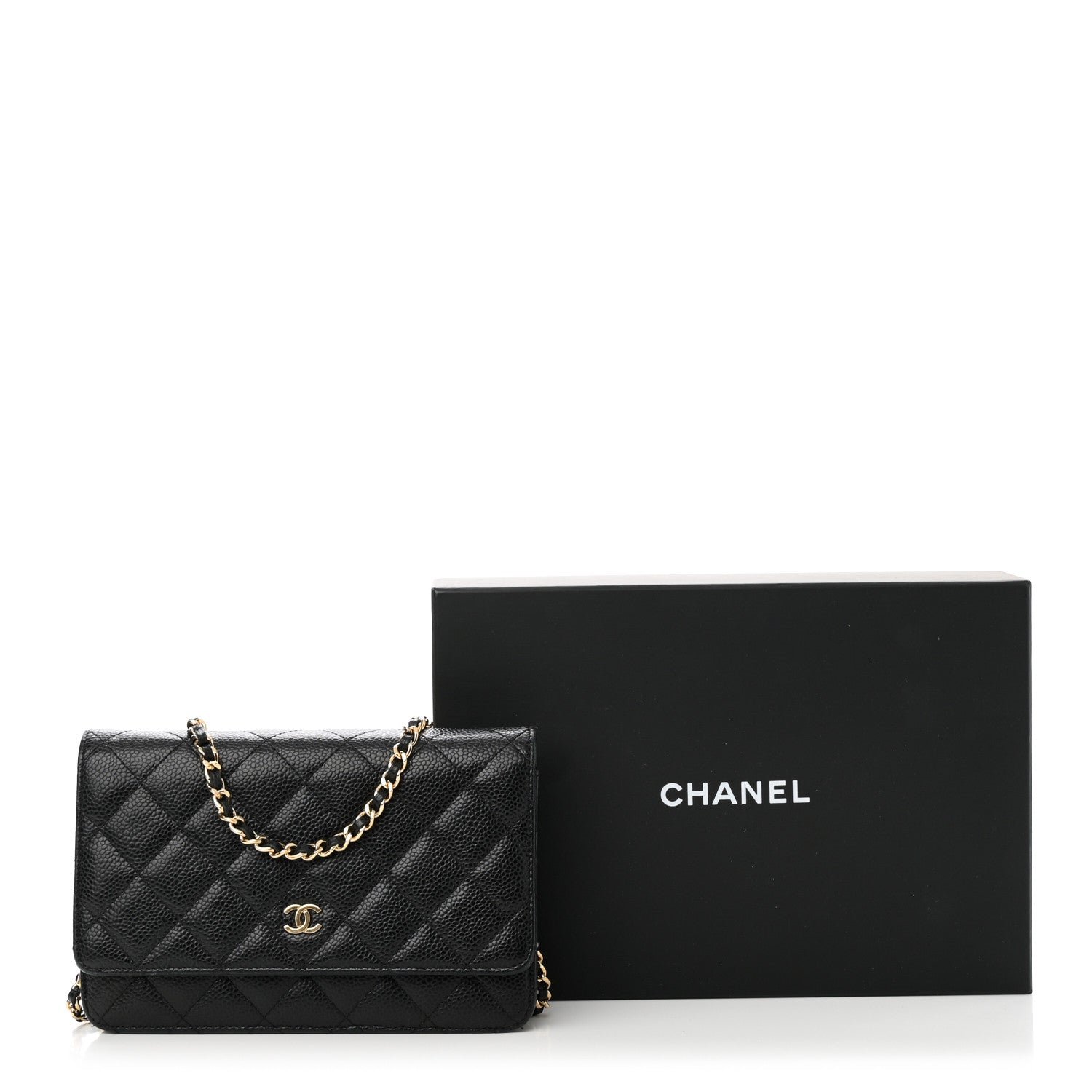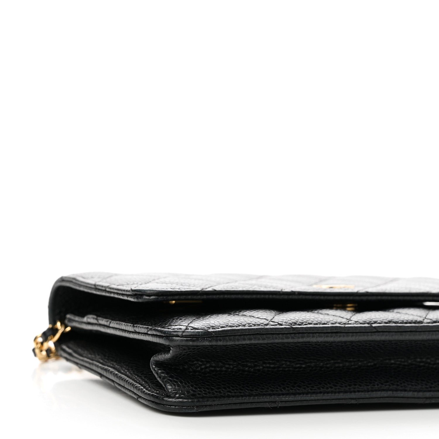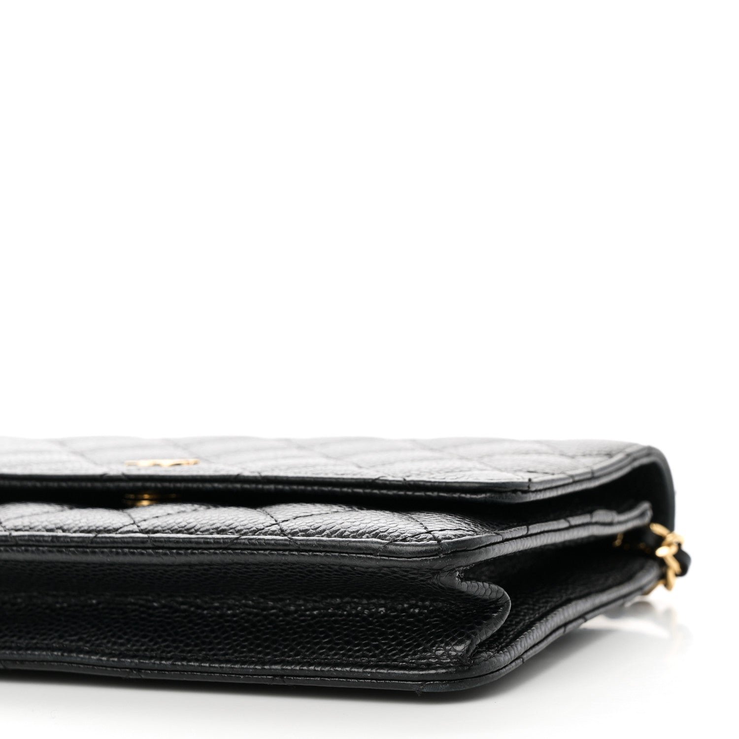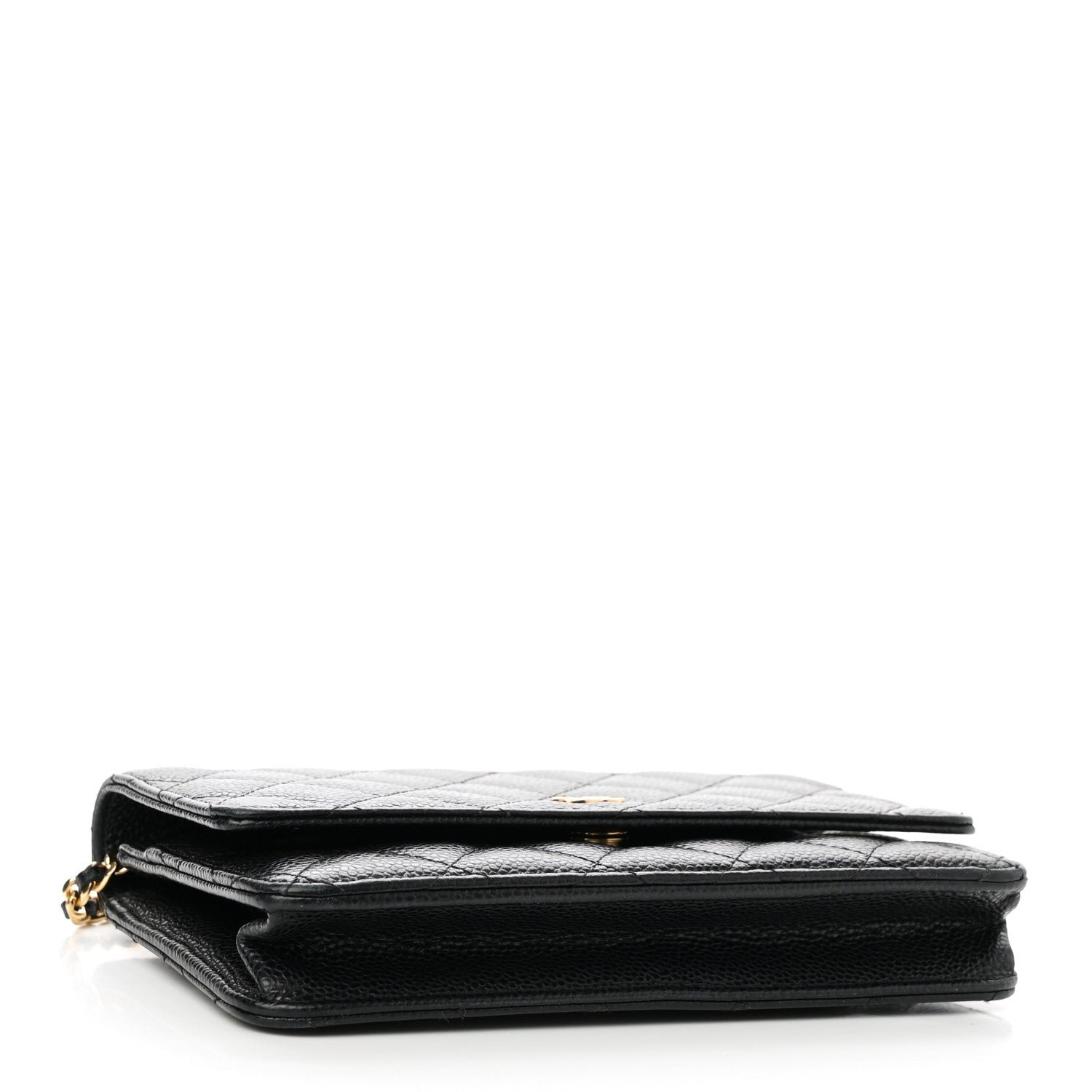 This is an authentic CHANEL Caviar Quilted Wallet on Chain WOC in Black. This stylish wallet is crafted of luxuriously textured diamond quilted caviar leather in black. This shoulder bag featuresa gold chain-link crossbody strap and a Chanel CC logo on the facing flap. The bag opens to a burgundy fabric interior with a zipper compartment. card slots. and a leatherpatch pocket.