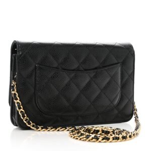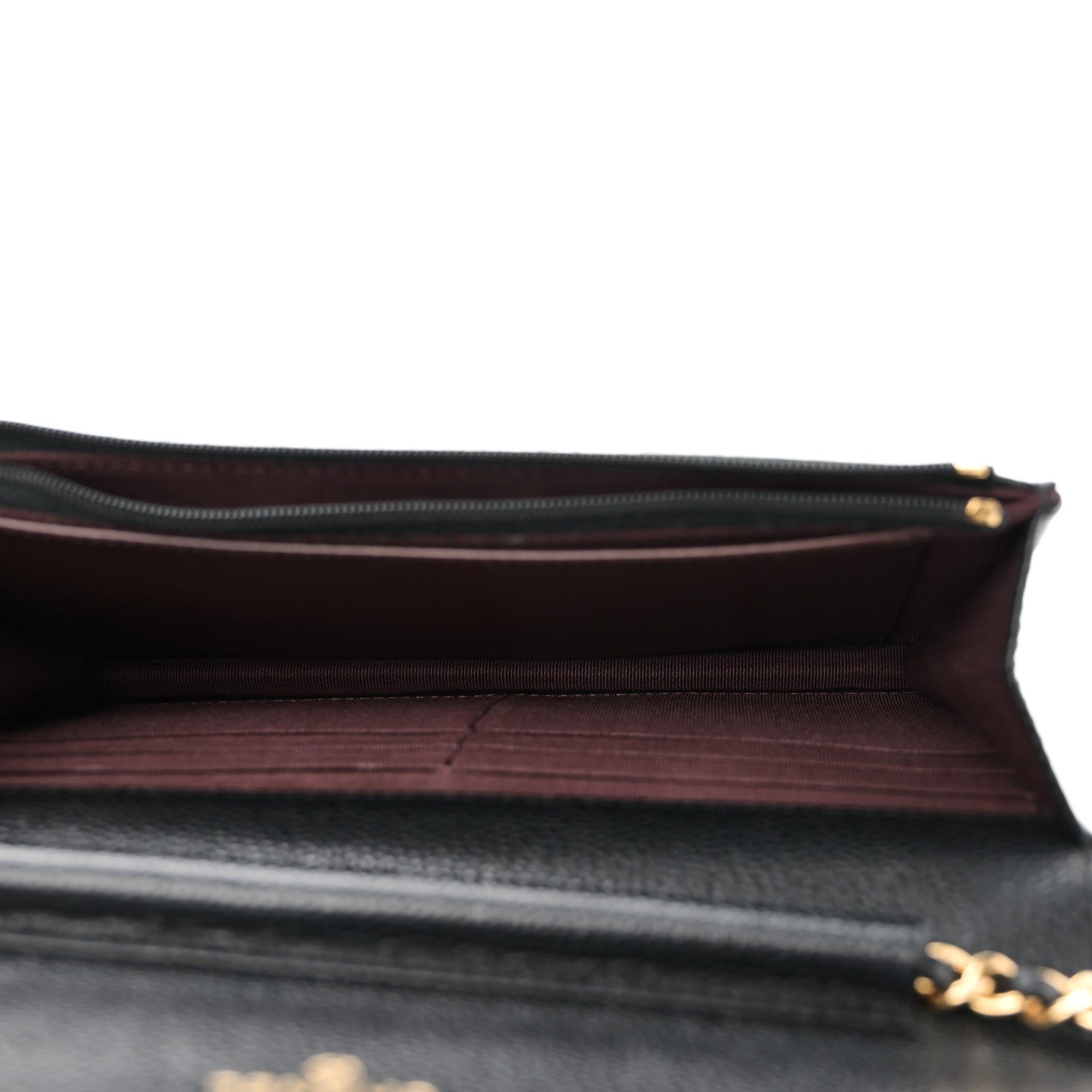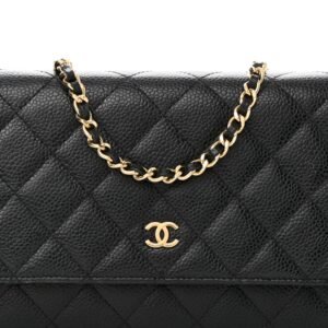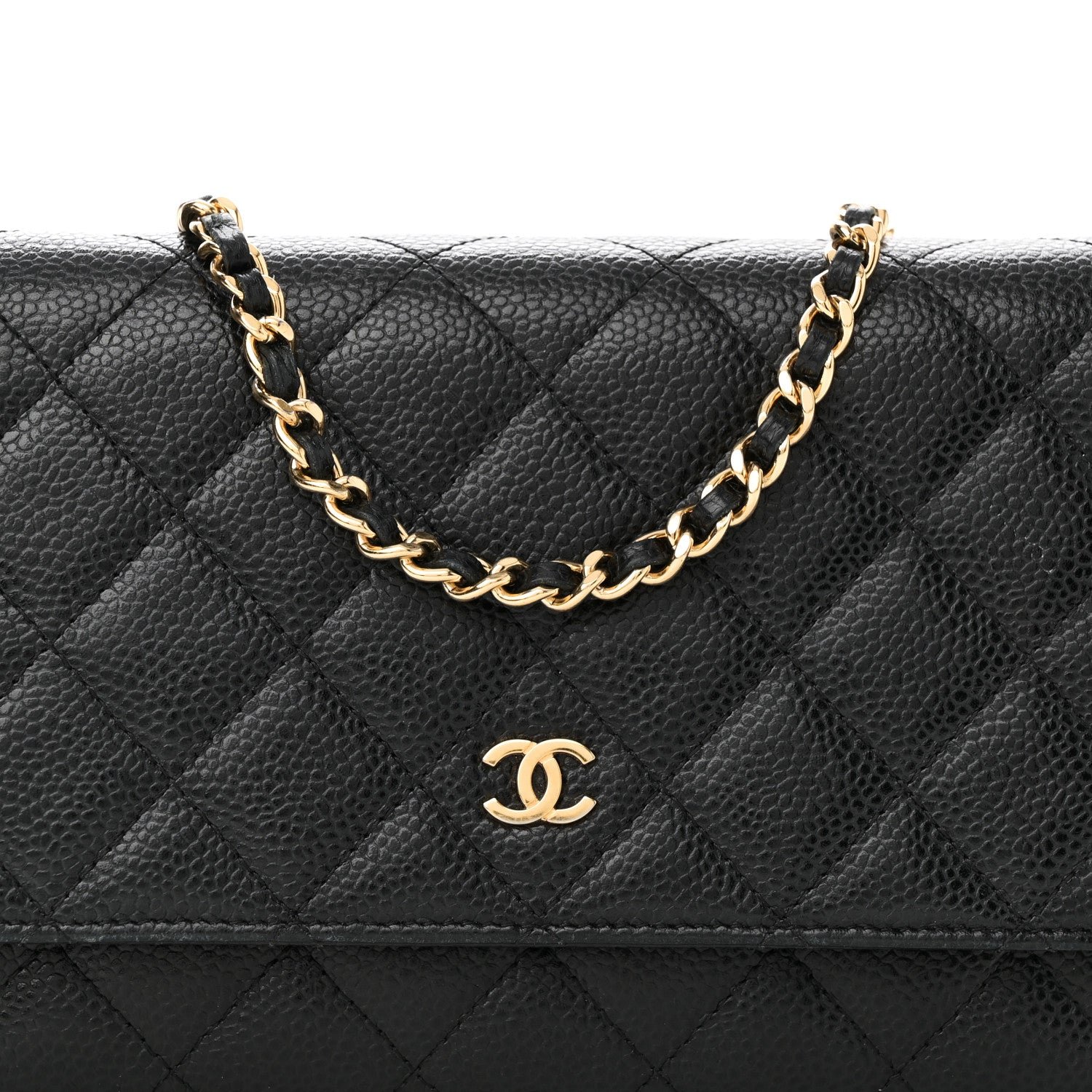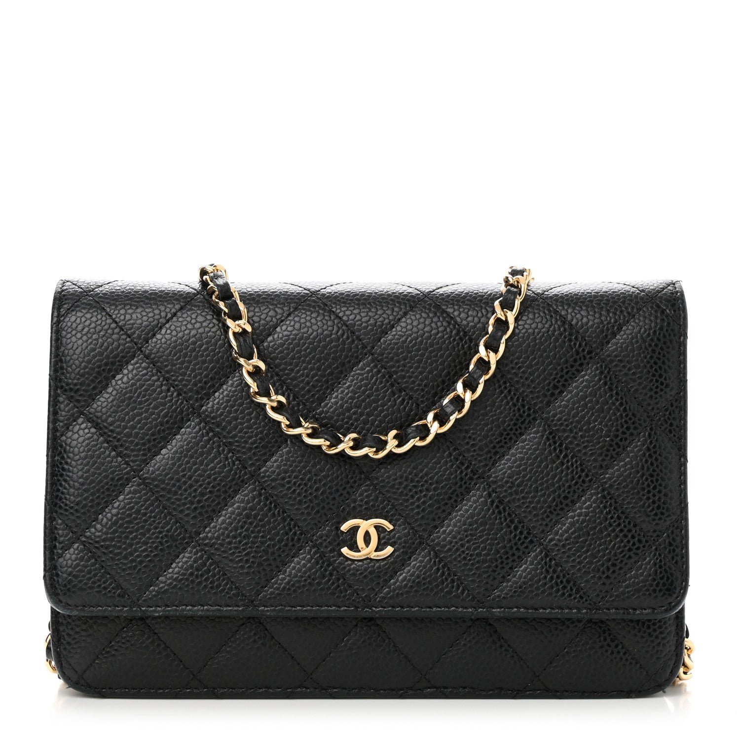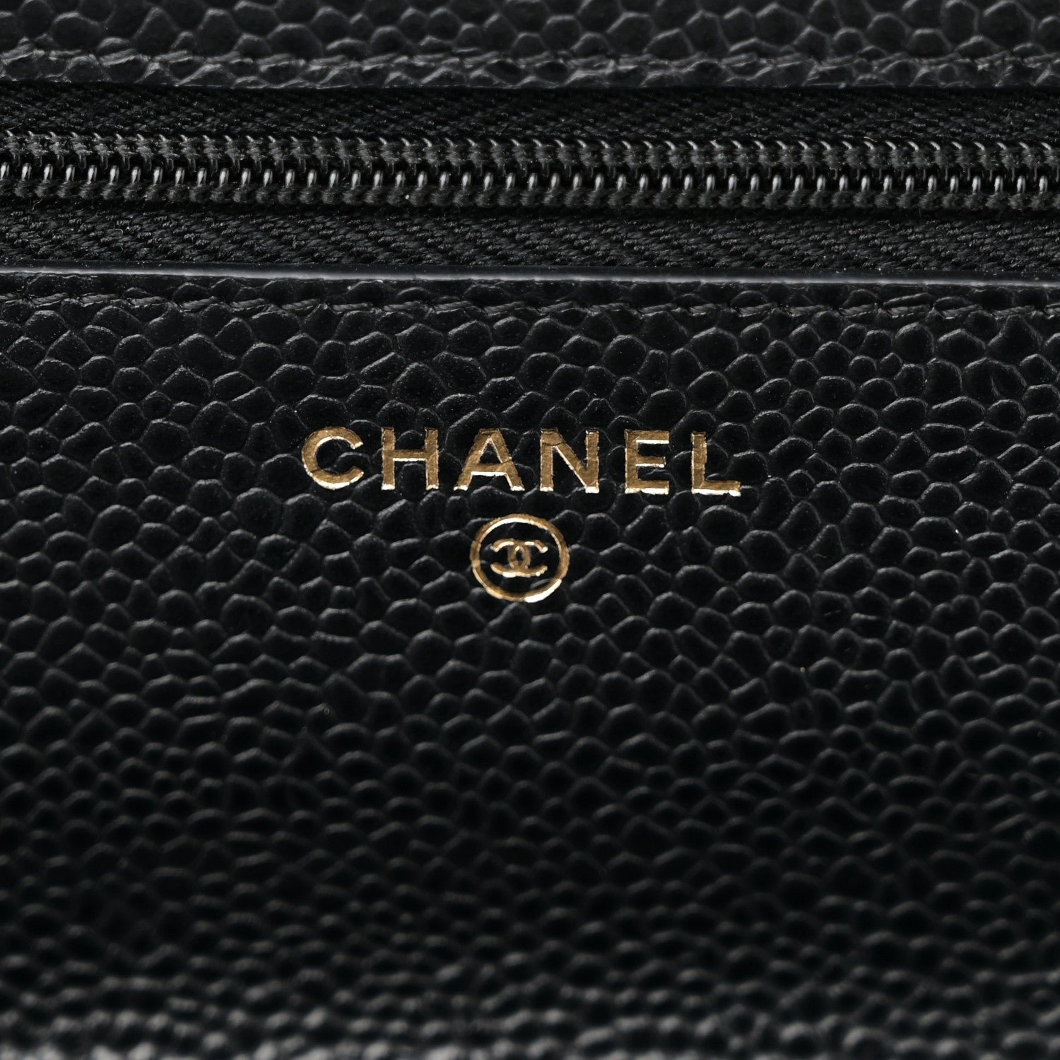 This is an authentic CHANEL Caviar Quilted Wallet on Chain WOC in Black. This stylish wallet is crafted of luxuriously textured diamond quilted caviar leather in black. This shoulder bag featuresa gold chain-link crossbody strap and a Chanel CC logo on the facing flap. The bag opens to a burgundy fabric interior with a zipper compartment. card slots. and a leatherpatch pocket.