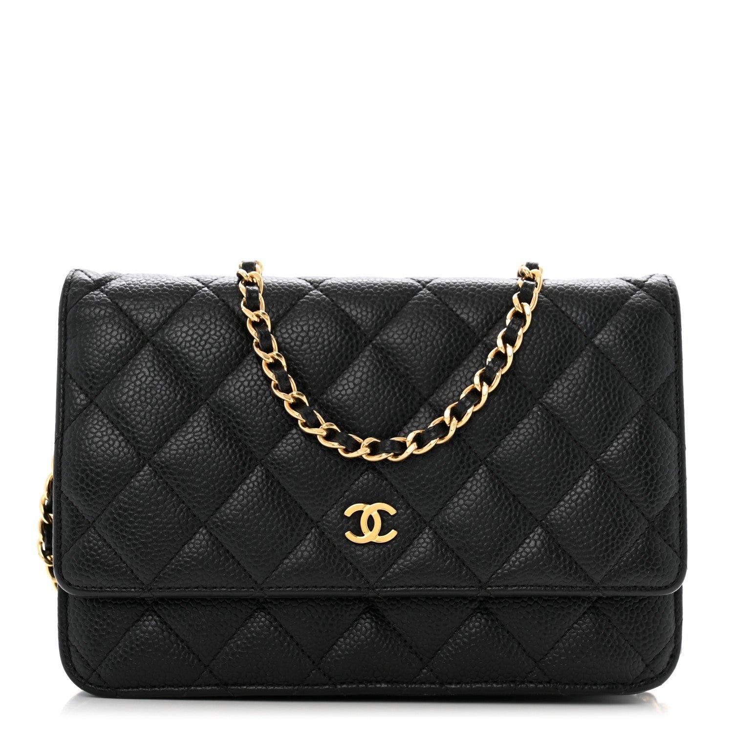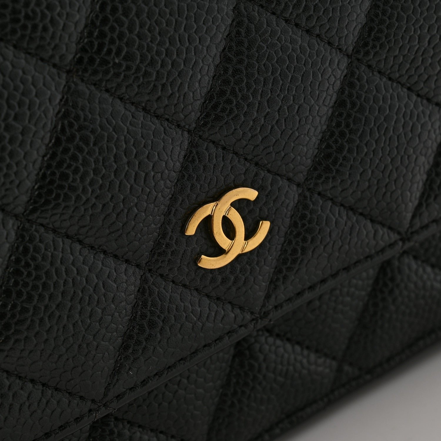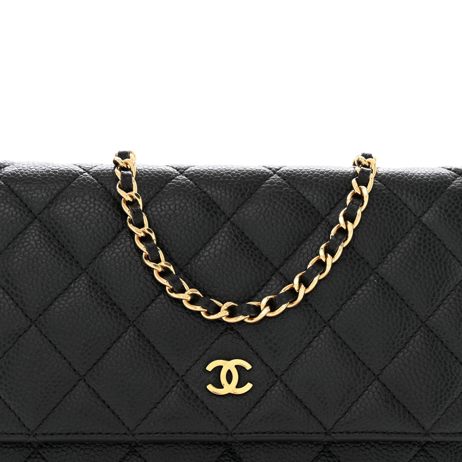 This is an authentic CHANEL Caviar Quilted Wallet on Chain WOC in Black. This stylish wallet is crafted of luxuriously textured diamond quilted caviar leather in black. This shoulder bag featuresa polished gold chain-link crossbody strap and a Chanel CC logo on the facing flap. The bag opens to a burgundy fabric interior with a zipper compartment. card slots. and a leatherpatch pocket.