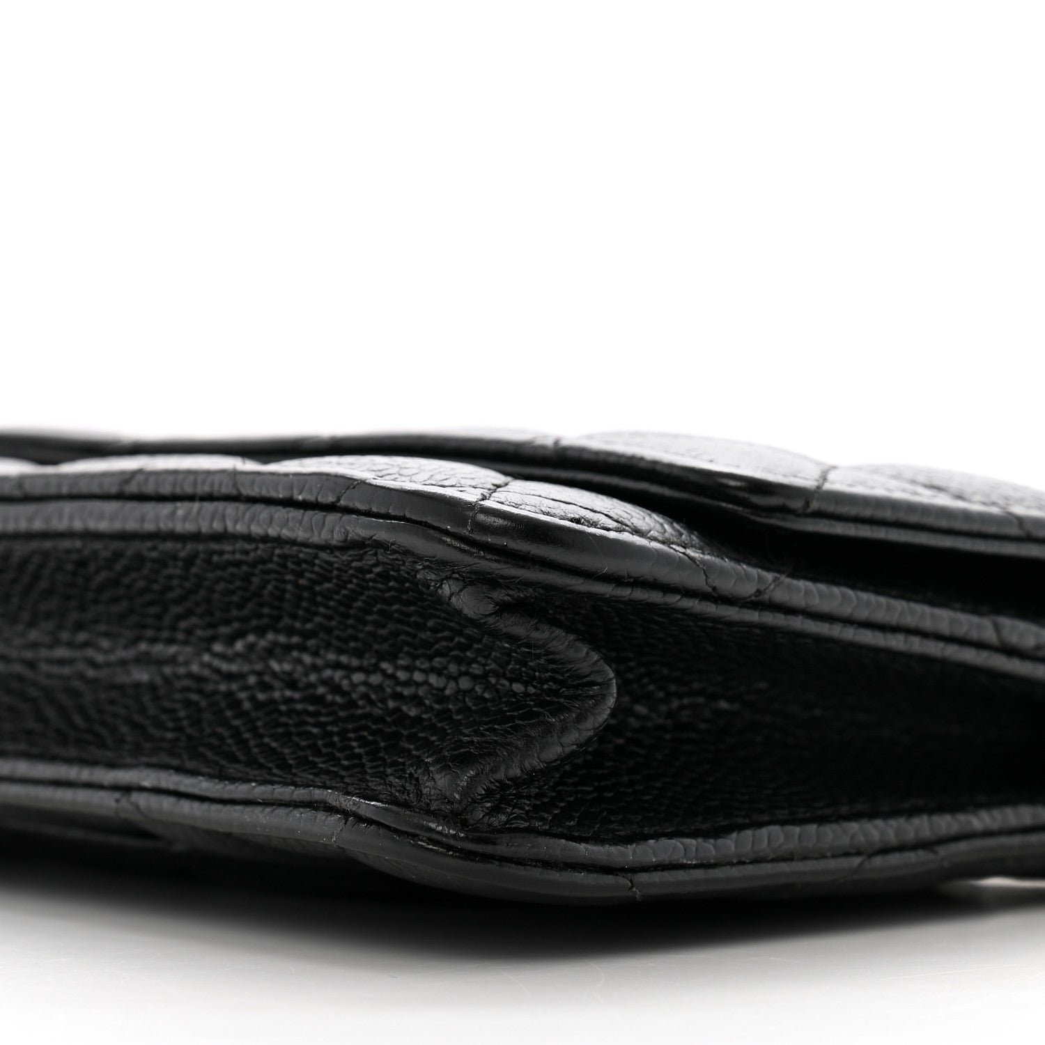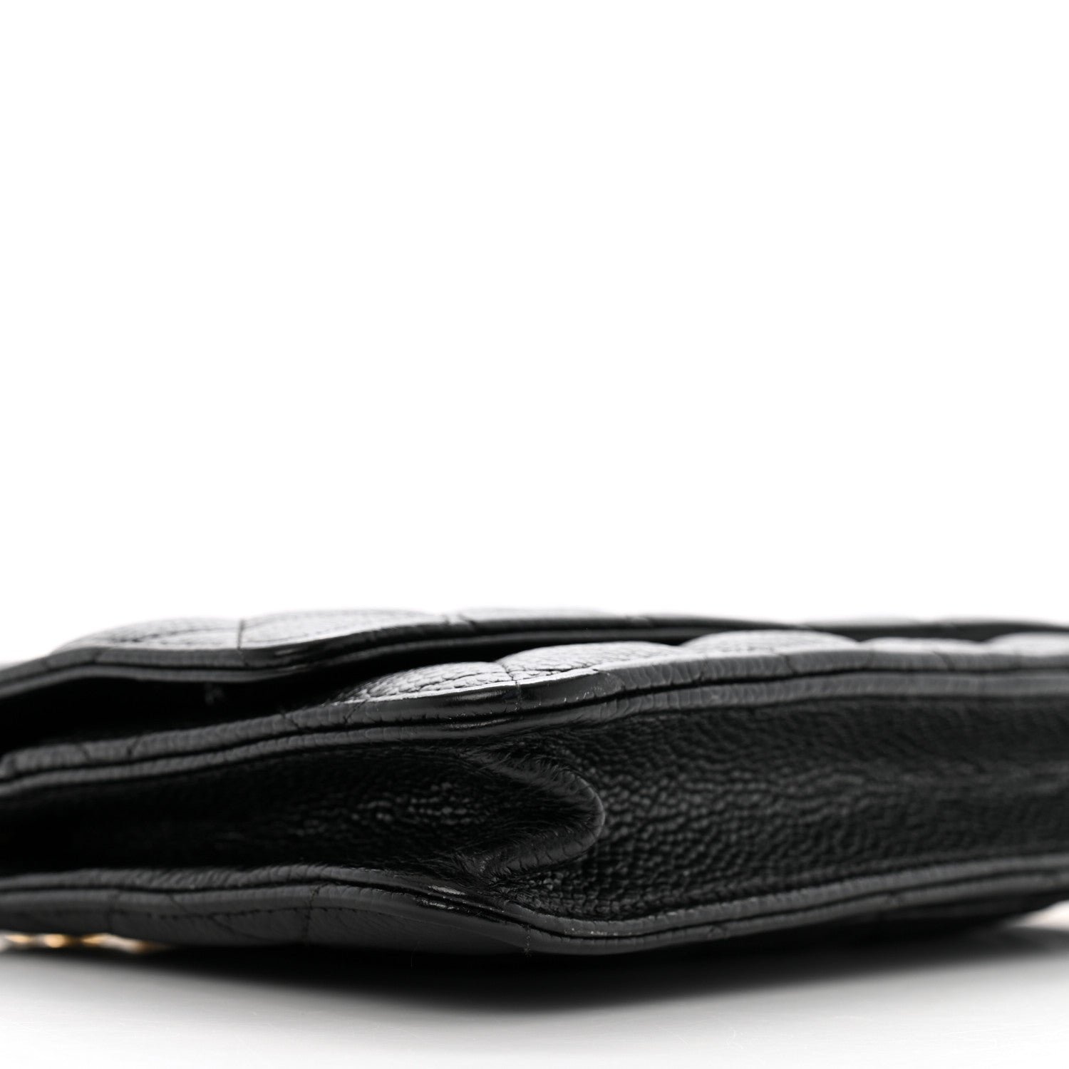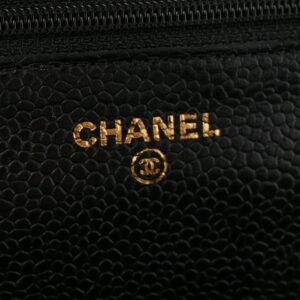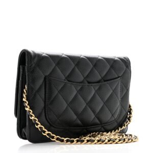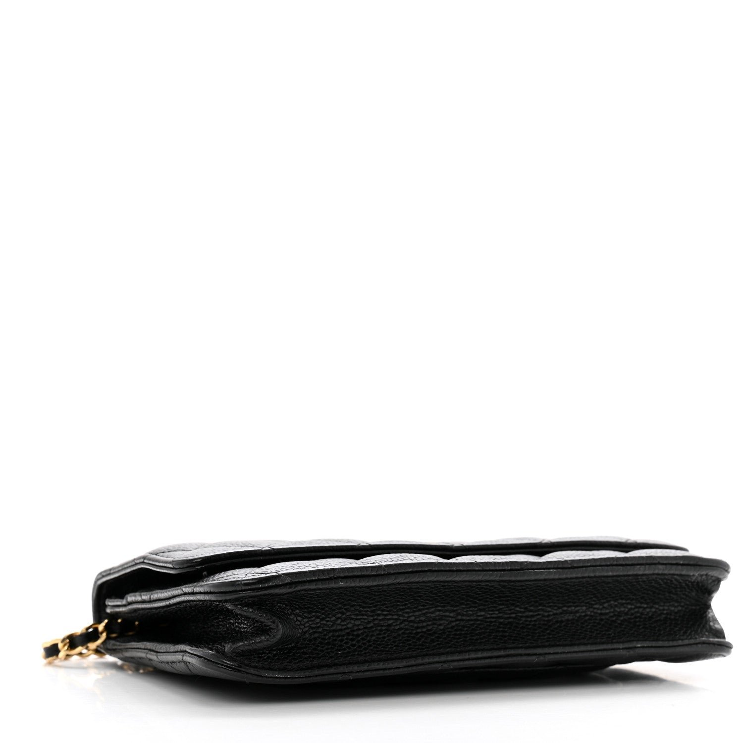 This is an authentic CHANEL Caviar Quilted Wallet on Chain WOC in Black. This stylish wallet is crafted of luxuriously textured diamond quilted caviar leather in black. This shoulder bag featuresa polished gold chain-link crossbody strap and a Chanel CC logo on the facing flap. The bag opens to a burgundy fabric interior with a zipper compartment. card slots. and a leatherpatch pocket.