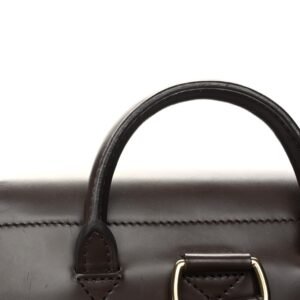 This is an authentic LOUIS VUITTON Damier Ebene Soho Backpack. This stylish backpack is crafted of Louis Vuitton’s signature Damier check on toile canvas. The backpack features a chocolate cowhide leather base. top flap. a rolled leather handle and adjustable shoulder straps with brass hardware. The flap opens with a buckle and strap toa spacious burnt orange fabric interior with a flat pocket.