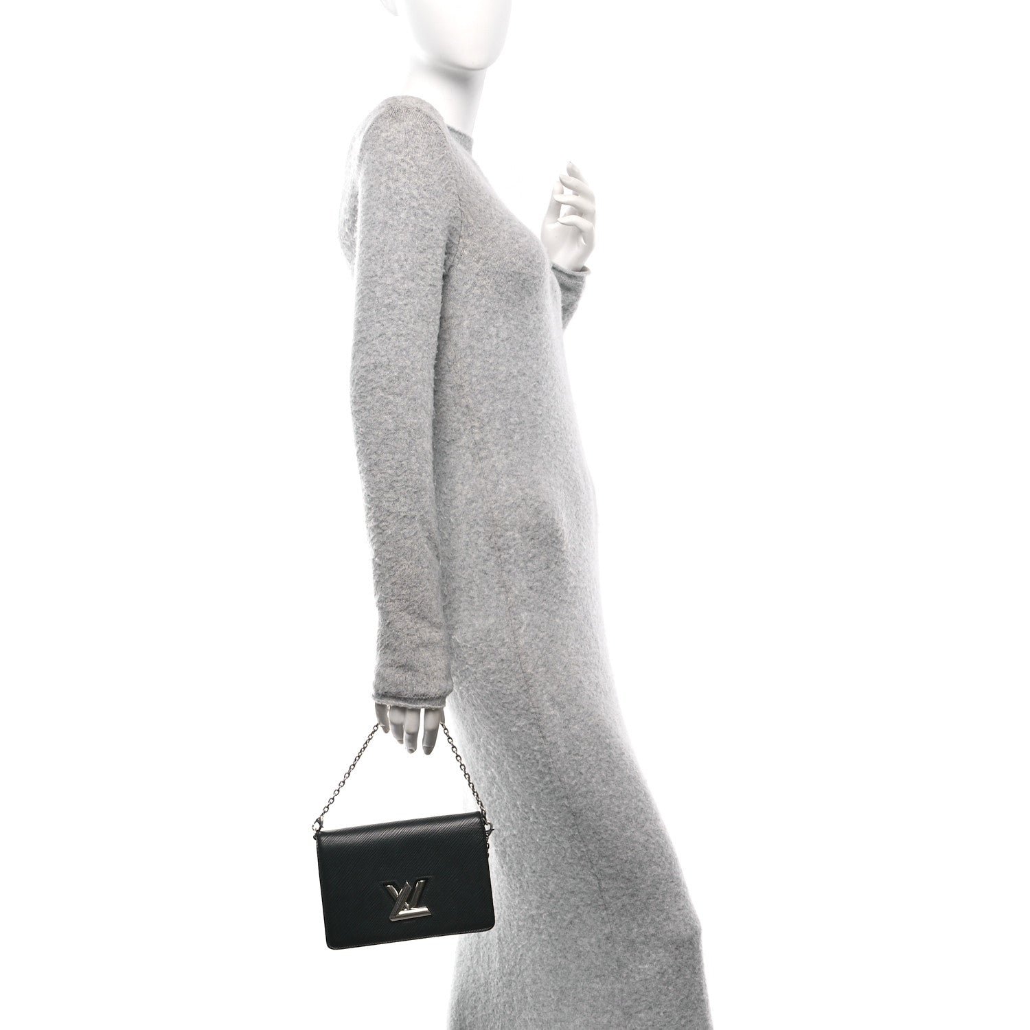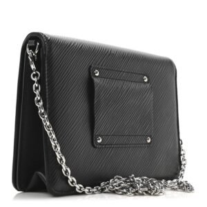 This is an authentic LOUIS VUITTON Epi Twist Chain Wallet in Black. This stylish waist-length crossbody shoulder bag is crafted of textured epileather in black. The chic bag features a polished silver chain shoulder strap and a polished silver LV twist lock on the facing flap. This opens to a black cross-grain leather interior with a patch pocket. zipper compartment. and card slots.