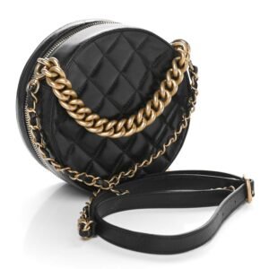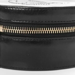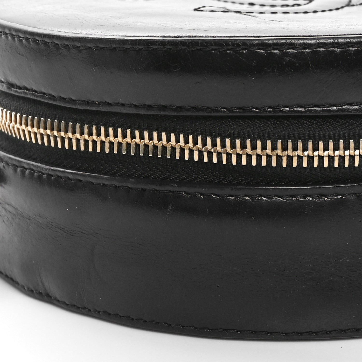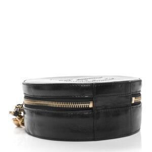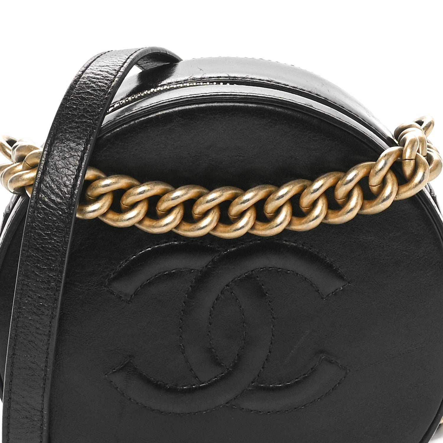 This is an authentic CHANEL Glazed Calfskin Round As Earth Evening Bag in Black. This chic shoulder bag is crafted of glazed black calfskin leather.This round handbag features a leather and an aged gold chain link shoulder strap. with an embossed Chanel CC logo on the front and star and planet aged gold zipper pulls. This opens to a beige fabric interior with a small patch pocket with enough room for day or evening necessities with the timeless style only from Chanel!