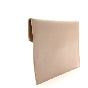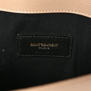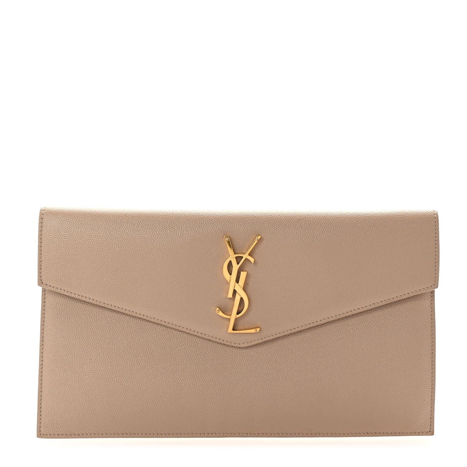This is an authentic SAINT LAURENT Grain De Poudre Monogram Uptown Pouch in Dark Beige. This clutch is crafted of pebbled calfskin leather in beige with a prominent gold YSL emblem on the front flap. This opens to a matching leather and black fabric interior.