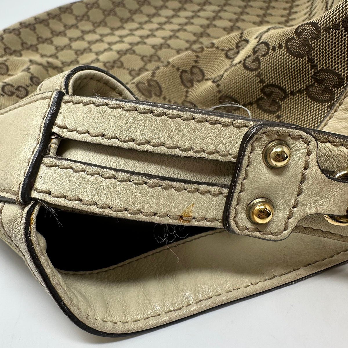 Gucci Monogram Hobo with Gold-Tone Hardware. Single Shoulder Strap. Interior Zip Pocket and Open Top (Small Stains and Wear on Canvas/Leather)
