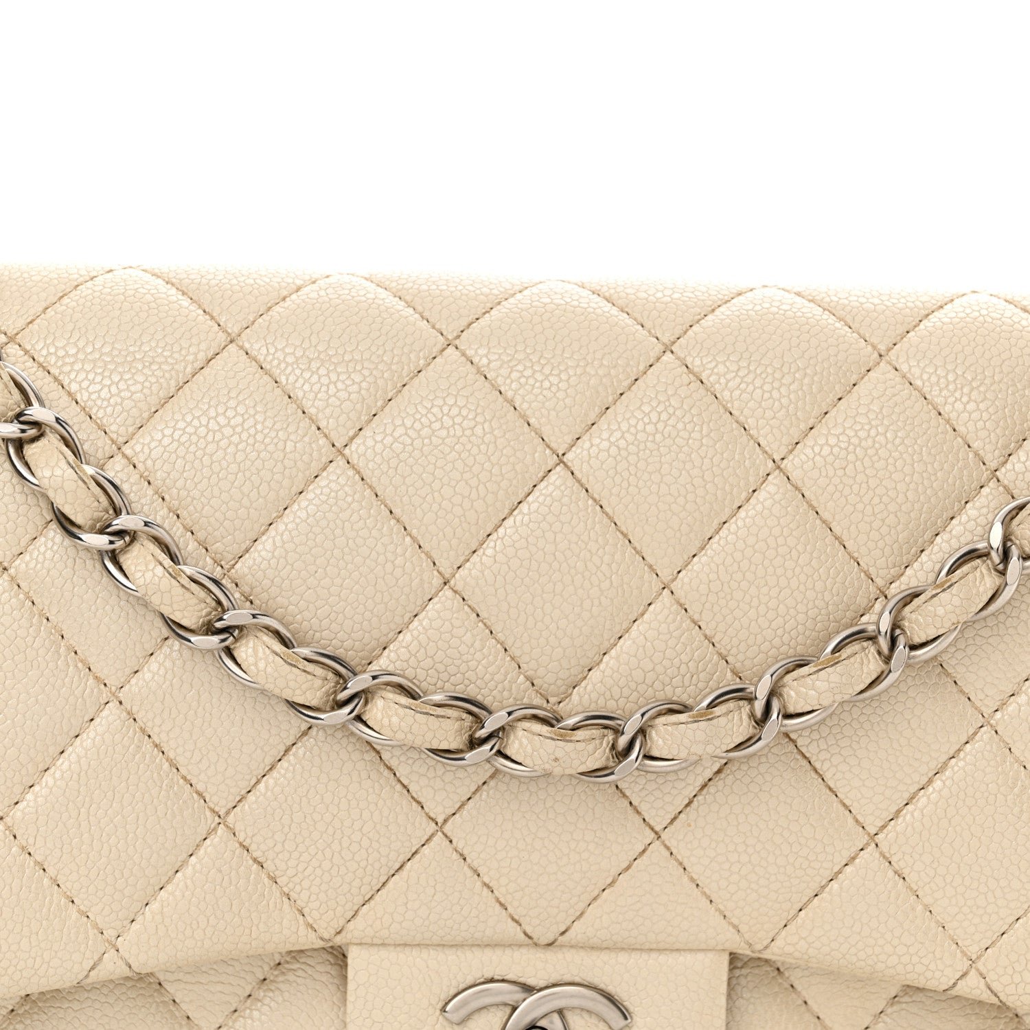 This is an authentic CHANEL Iridescent Caviar Quilted Jumbo Double Flap in Dark White. This beautiful bag is crafted of luxurious iridescent white caviar leather with the iconic diamond-shaped stitching. The bag features a silver chain-link leather threaded shoulder strap and a matching silver Chanel CC turn-lock for the facing flap. This opens to reveal an inner flap and an iridescent beige leather interior with patch pockets.