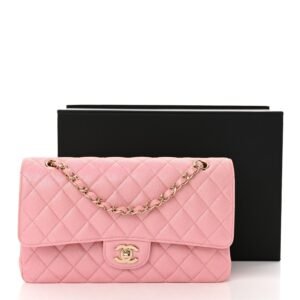 This is an authentic CHANEL Iridescent Caviar Quilted Medium Double Flap in Rose Pink. This stylish shoulder bag is crafted of luxuriously textured iridescent caviar leather with diamond quilting in rose pink. The bag features leather threaded light gold chainlink shoulder straps and a light gold Chanel CC turn lock on the front. This opens the flap to an interior flap secured with a snap and a matching smooth leather interior with patch pockets.