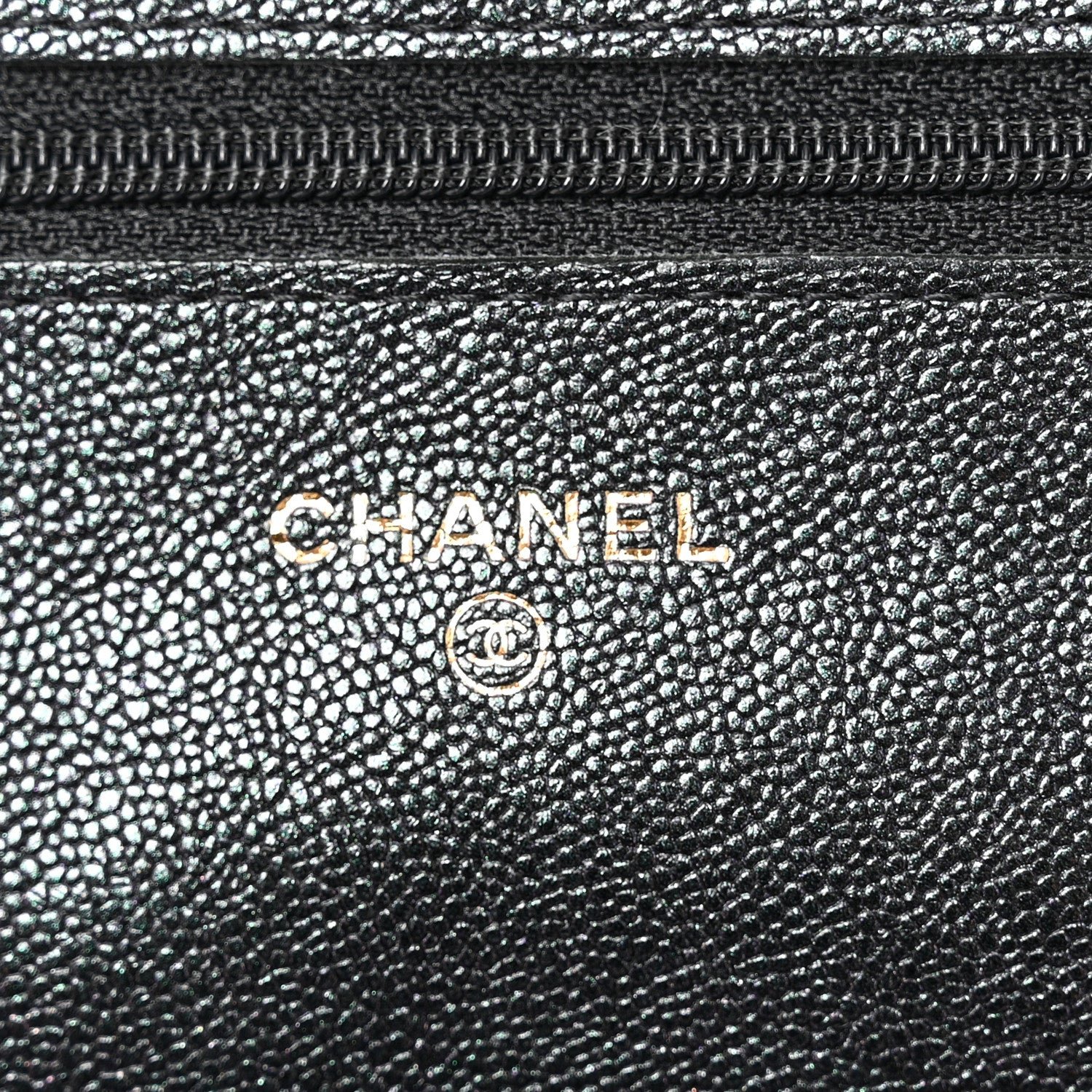 This is an authentic CHANEL Iridescent Caviar Quilted Wallet On Chain WOC in Black. This wallet is crafted beautifully of luxurious diamond quilted caviar leather in black. The frontal flap has a silver Chanel CC and opens to an interior of black fabric with card slots. pockets and a zipper compartment. The added charm of this wallet is a long polished silver chain threaded with black leather allowing the wallet to be worn low at the waist.