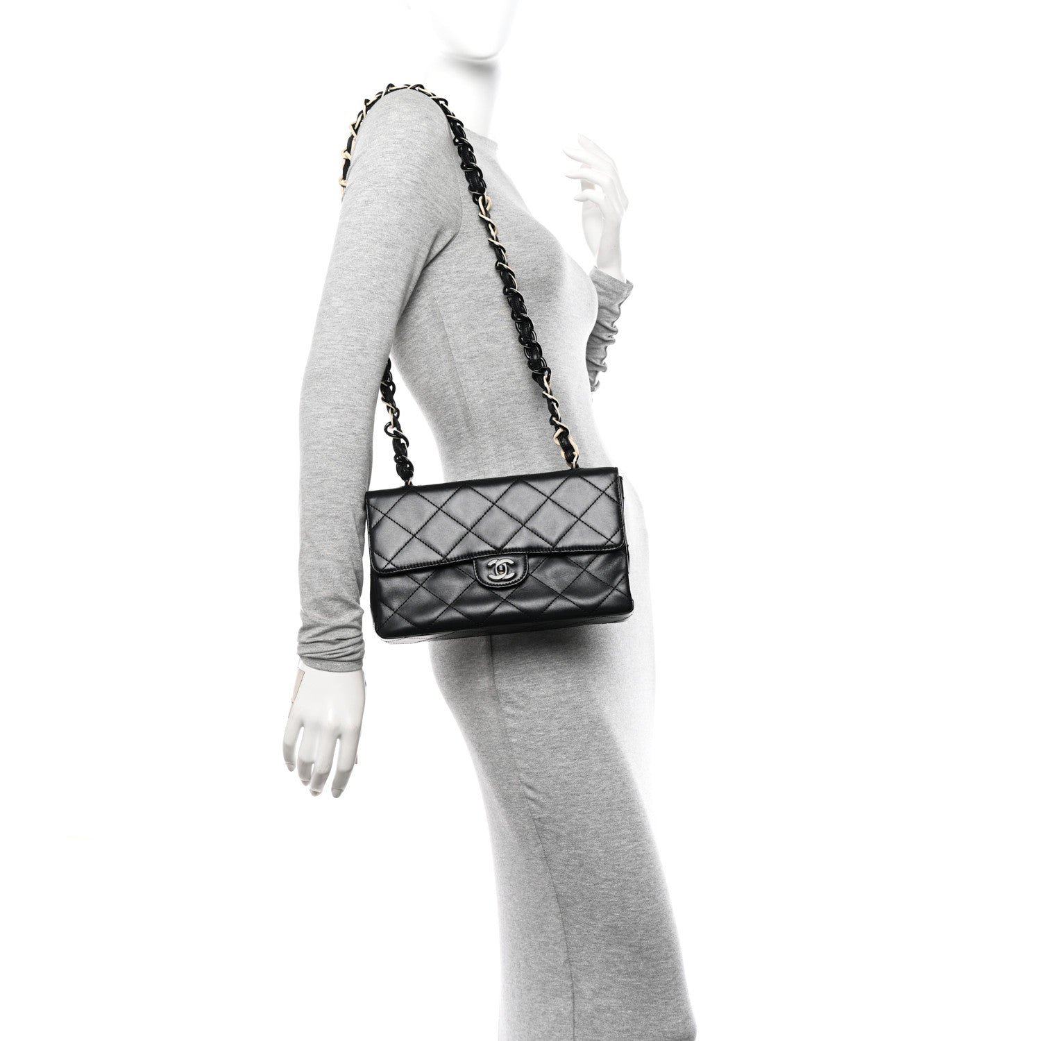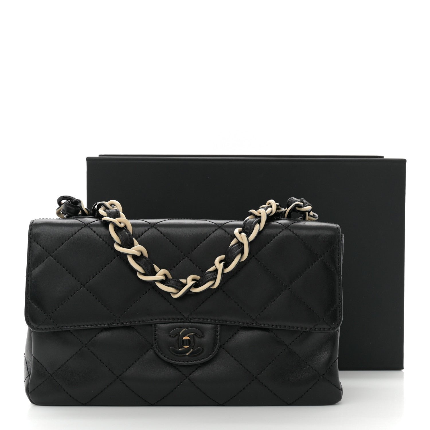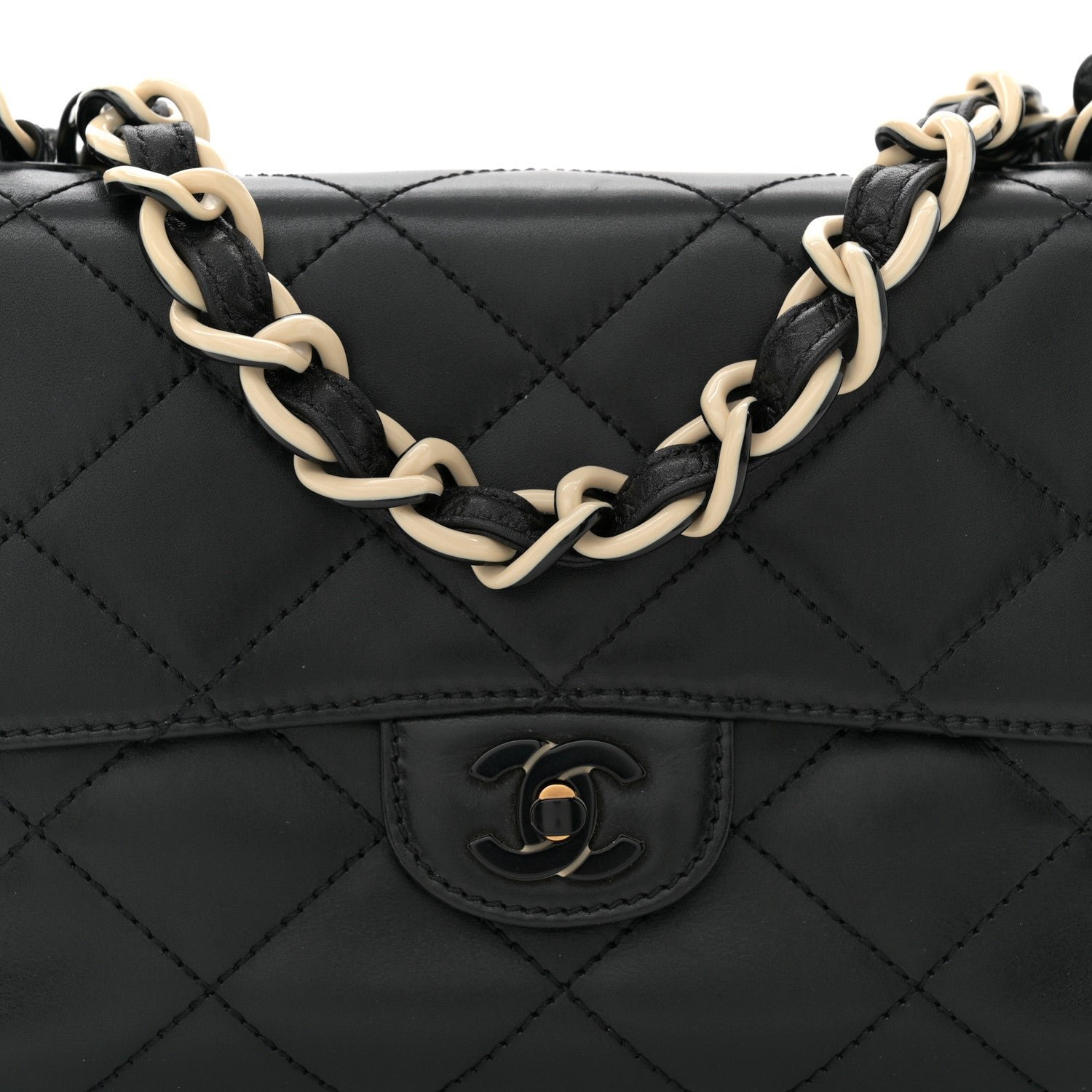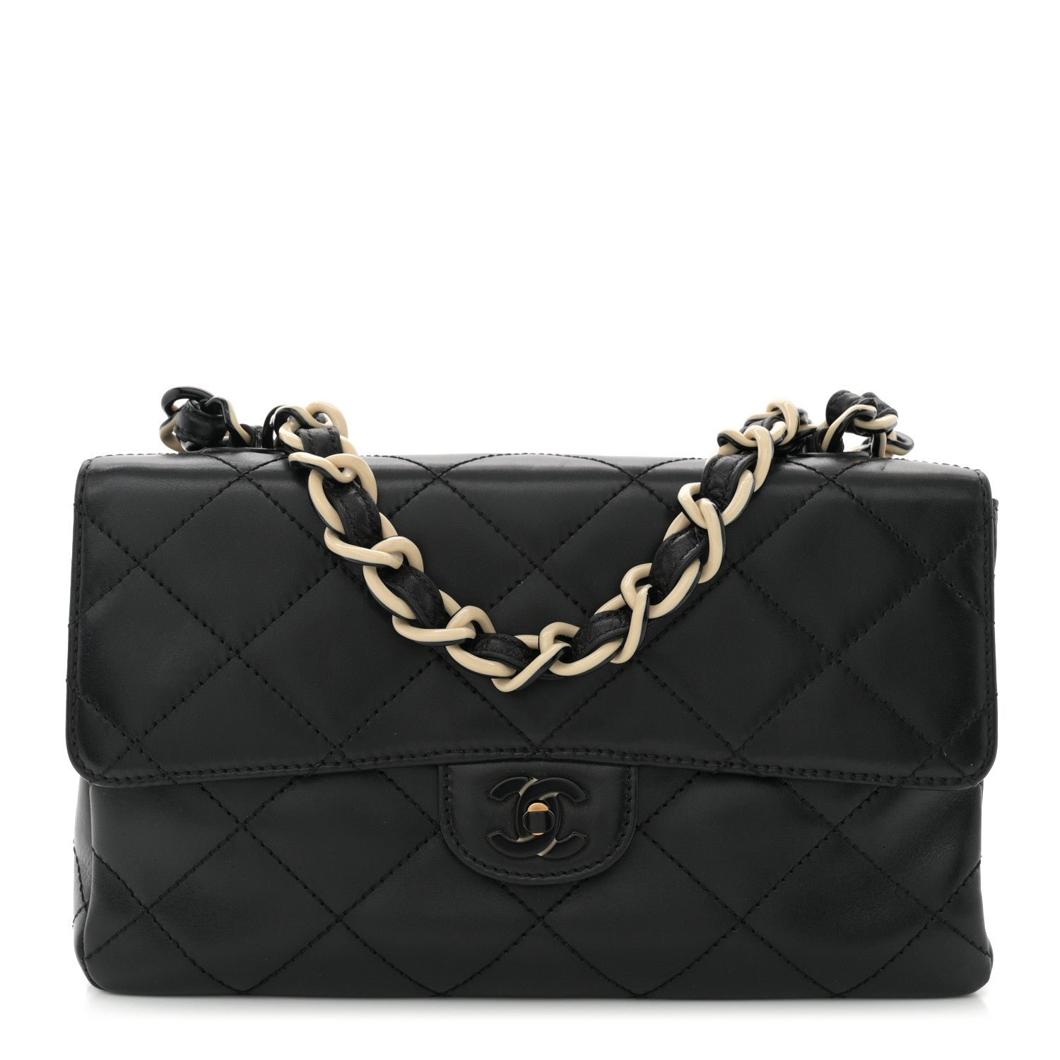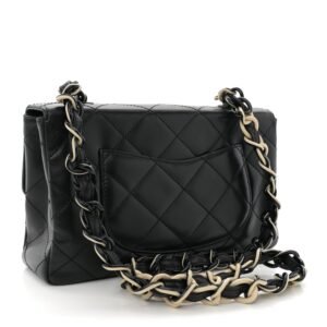 This is an authentic CHANEL Lambskin Bekko Resin Medium Single Flap in Black. This vintage shoulder bag is beautifully crafted of black diamond stitched lambskin leather. The bag features a Bekko leather and resin chain link shoulder straps and a frontal flap with a Chanel CC black resin Mademoiselle turn lock. This opens to a black leather interior with zipper and patch pockets. This is an excellent shoulder bag that is ideal for day or evening from Chanel!