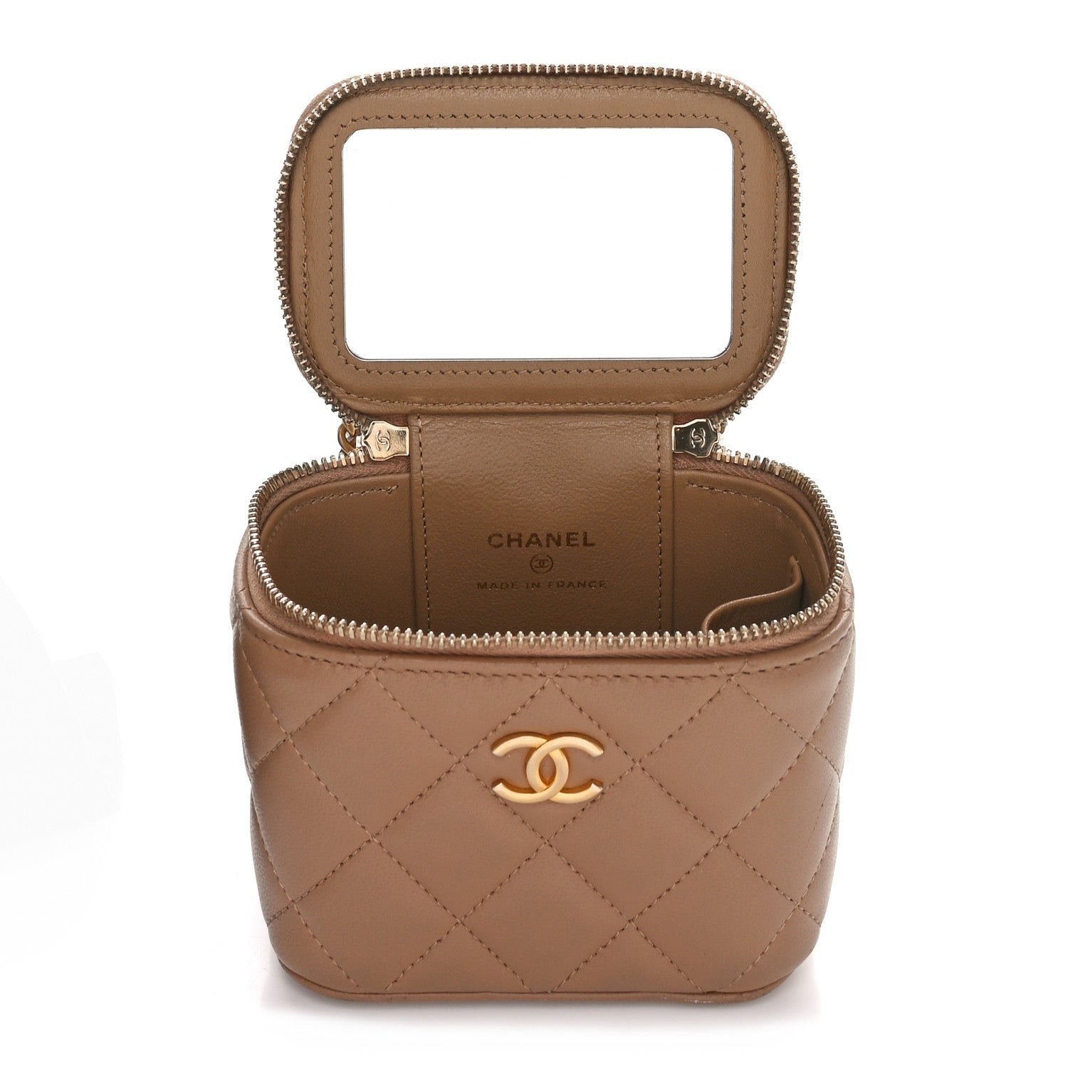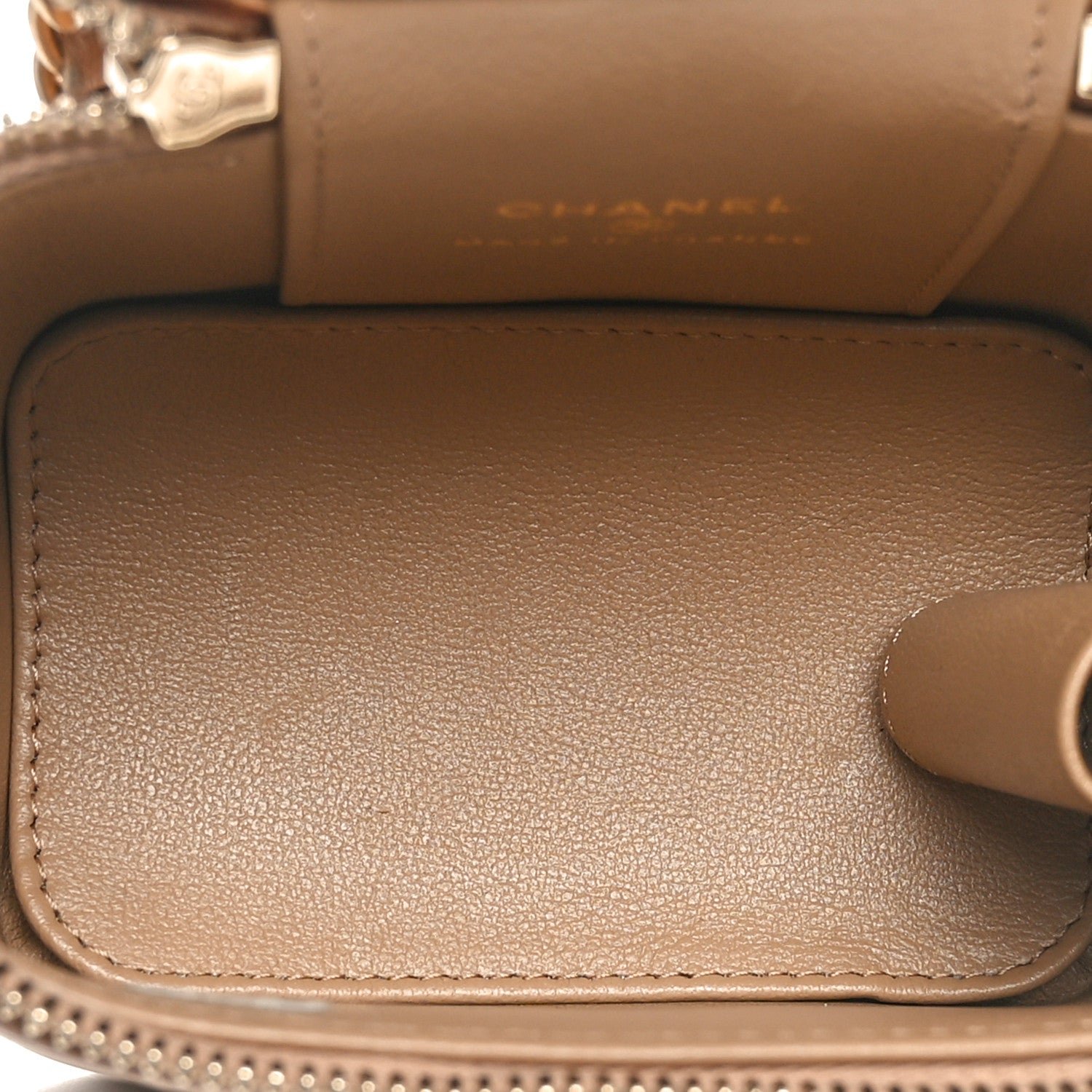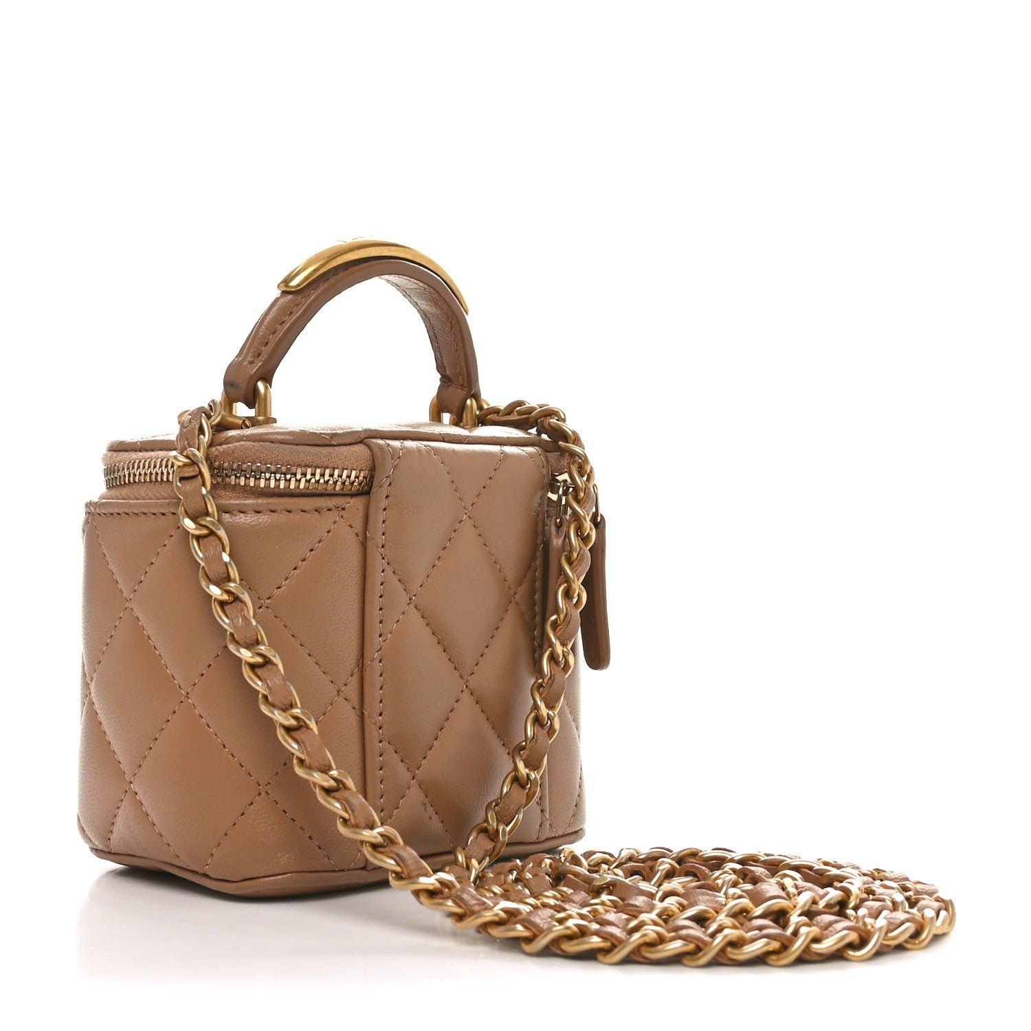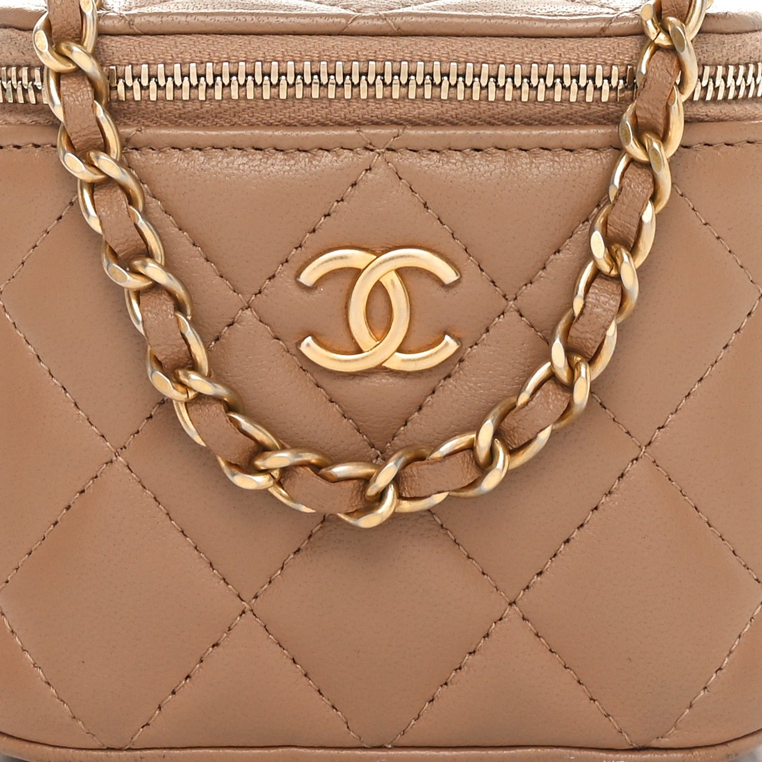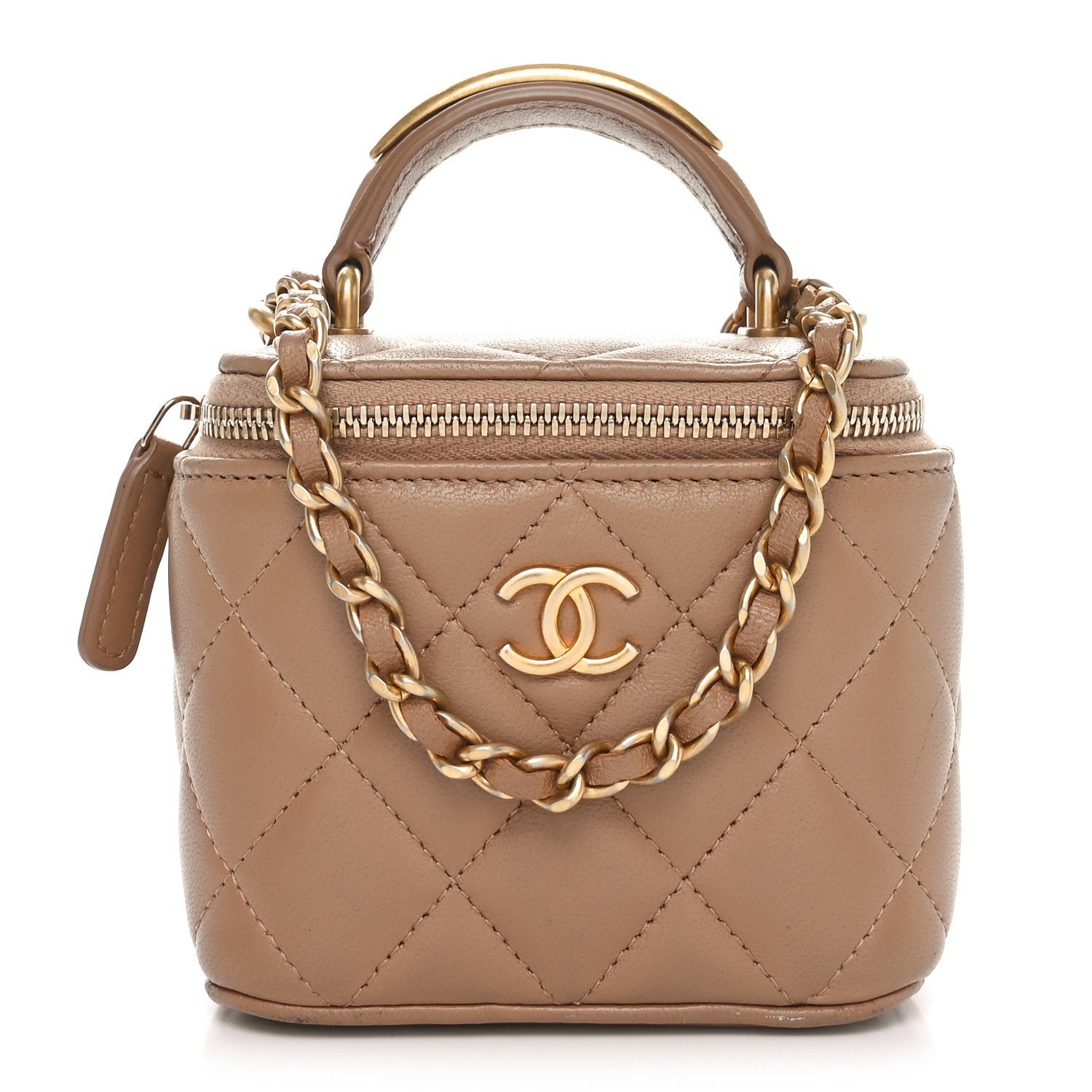 This is an authentic CHANEL Lambskin Quilted Metal Mini Top Handle Vanity Case With Chain in Beige. This stylish crossbody is crafted of beige lambskin. It features a leather threaded aged gold chain-link shoulder strap and aged gold hardware. The handbag features a 3/4 wrap-around zipper that opens to a matching leather interior with a built-in mirror and a lipstick holder.