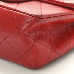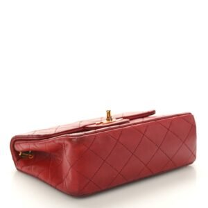 This is an authentic CHANEL Lambskin Quilted Mini Square Flap in Red. This bag is crafted of diamond quilted lambskin leather in red. It features a rear patch pocket. a long leather-threaded gold chain strap. and a gold CC turn lock on the front. The flap opens to a black leather interior with a zipper and patch pocket.