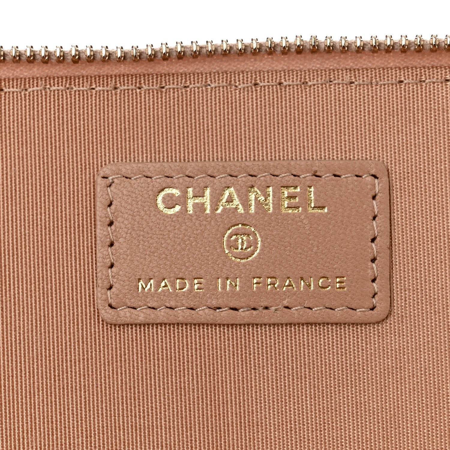 This is an authentic CHANEL Lambskin Quilted Small Top Handle Vanity Case With Chain in Beige. This stylish crossbody is crafted of luxurious lambskin leather in beige. The bag features leather threaded gold chain-link shoulder strap and gold hardware. The handbag features a 3/4 wrap-around zipper that opens to a fabric interior with card slots.