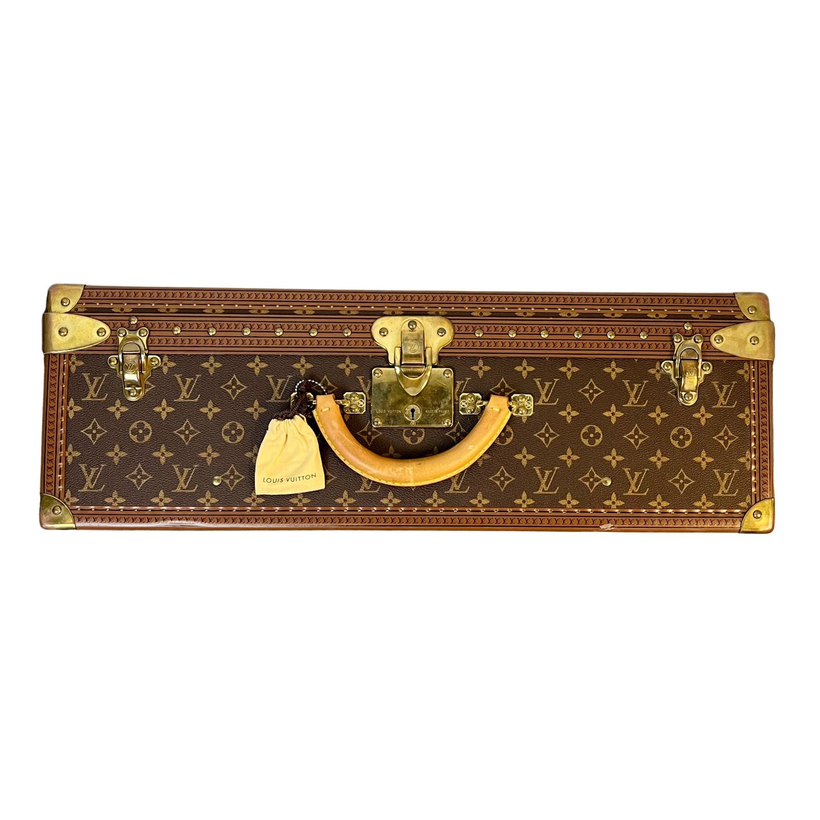 Louis Vuitton Monogram Alzer Suitcase with Brass Hardware. Stud Accents. Leather Trim. Lock/Key. Dual Compartments. Leather Trim and Interior. Leather Rolled Handle. and Louis Vuitton Protective Cover