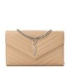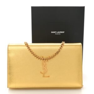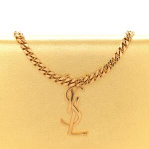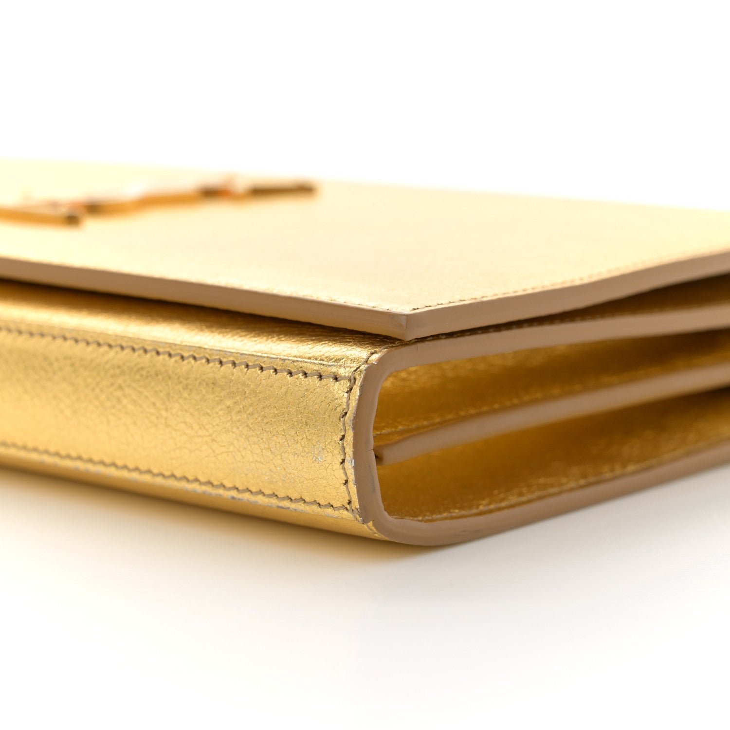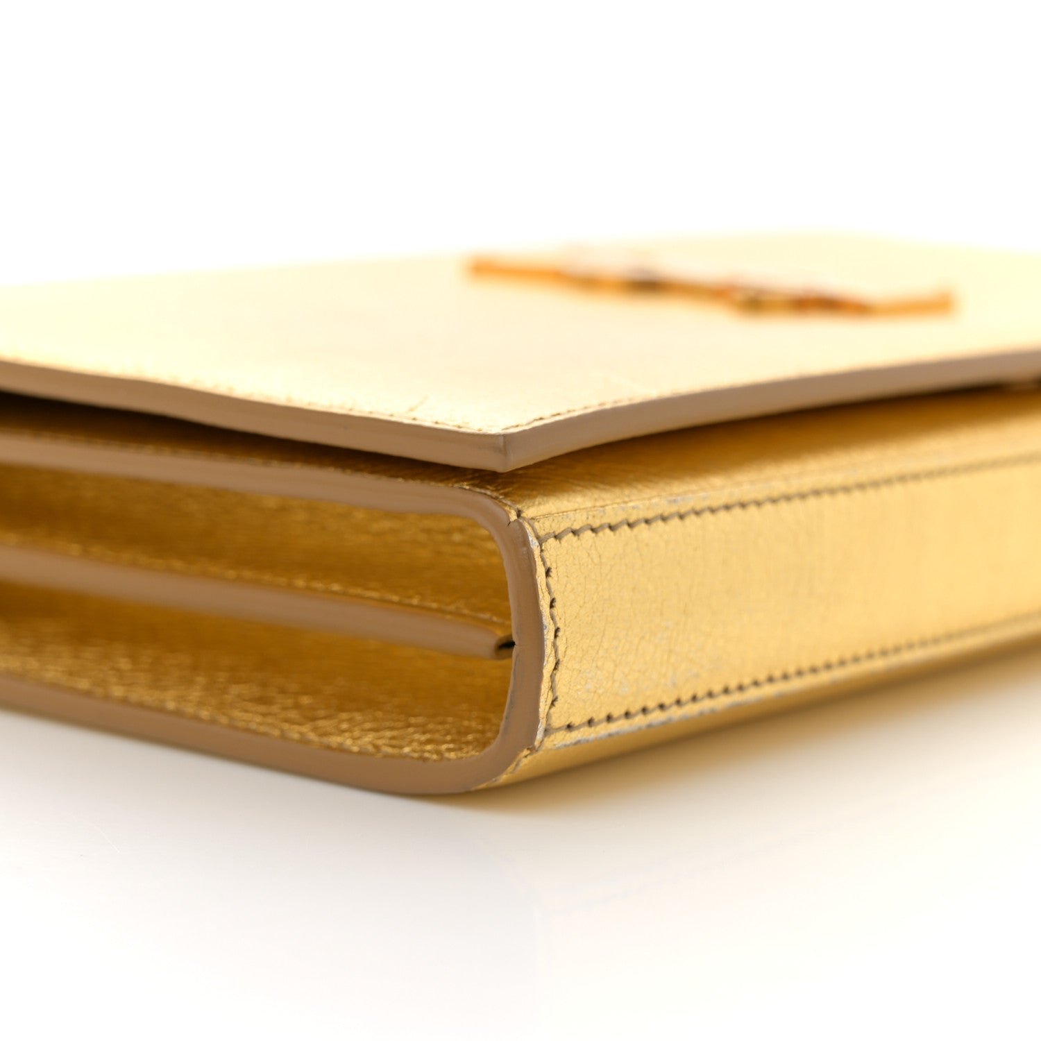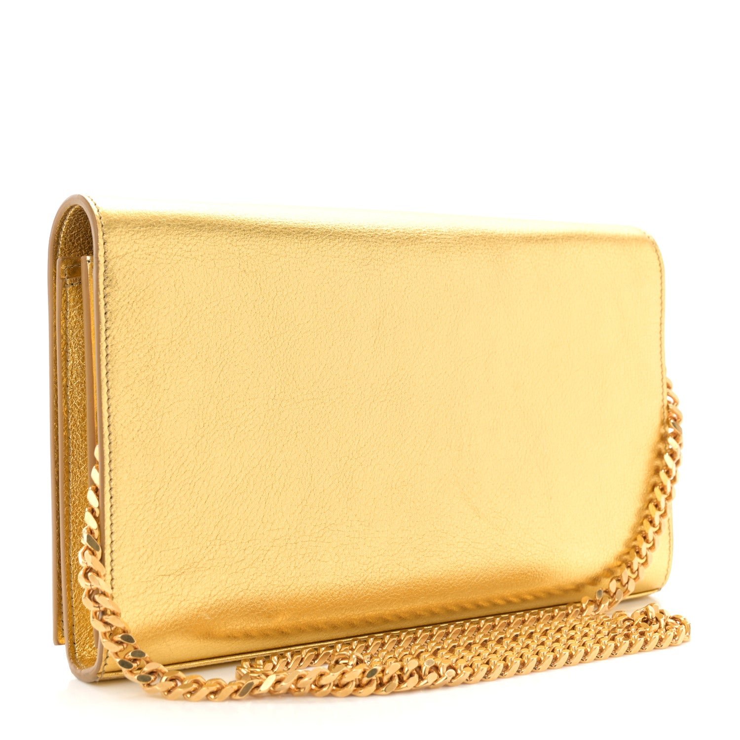 This is an authentic SAINT LAURENT Metallic Calfskin Monogram Chain Wallet in Gold. This elegant chain wallet is crafted of metallic leatherin gold. The bag features a gold chain link shoulder strap and a facing flap with a prominent gold YSL logo. The flap opens with a button snap to a partitioned black suede interior with card slot panels. a center zipper compartment. and patch pockets.