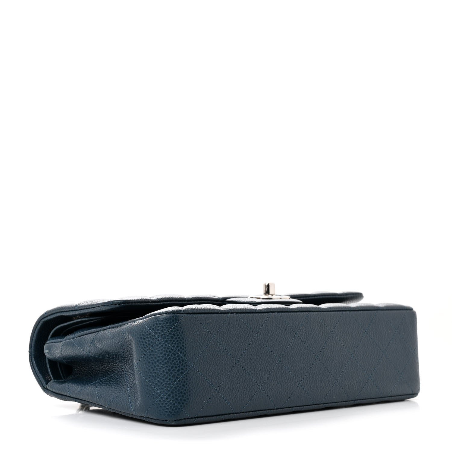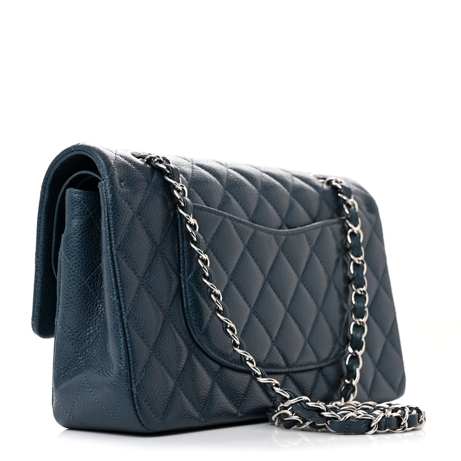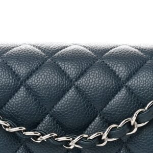 This is an authentic CHANEL Pearly Caviar Quilted Medium Double Flap in Blue. This classic shoulder bag is crafted of luxurious diamond quilted caviar leather in metallic blue. The bag features a leather threaded silver chain link shoulder strap. and a matching silver classic CC turn lock on the front. This opens the bag to reveal an inner flap. and a smooth metallic blue leather interior with patch pockets.