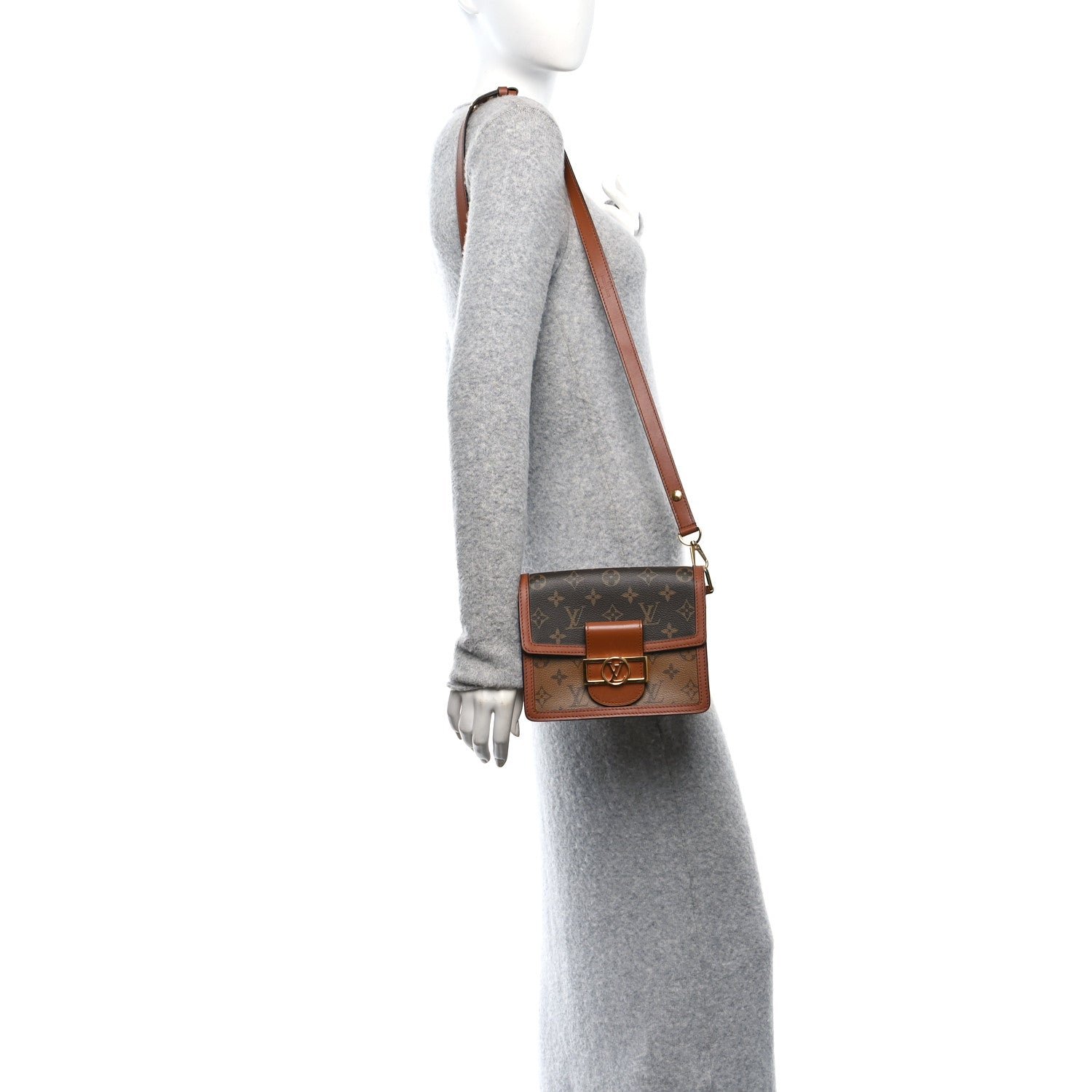 This is an authentic LOUIS VUITTON Reverse Monogram Dauphine Mini. This stylish shoulder bag is crafted of Louis Vuitton monogram on toile canvas. The bag features an adjustable calfskin leather shoulder strap and a facing flap with toffee leather trim and a decorative brass Louis Vuitton logo clasp. This opens to a black microfiber interior with a small patch pocket.