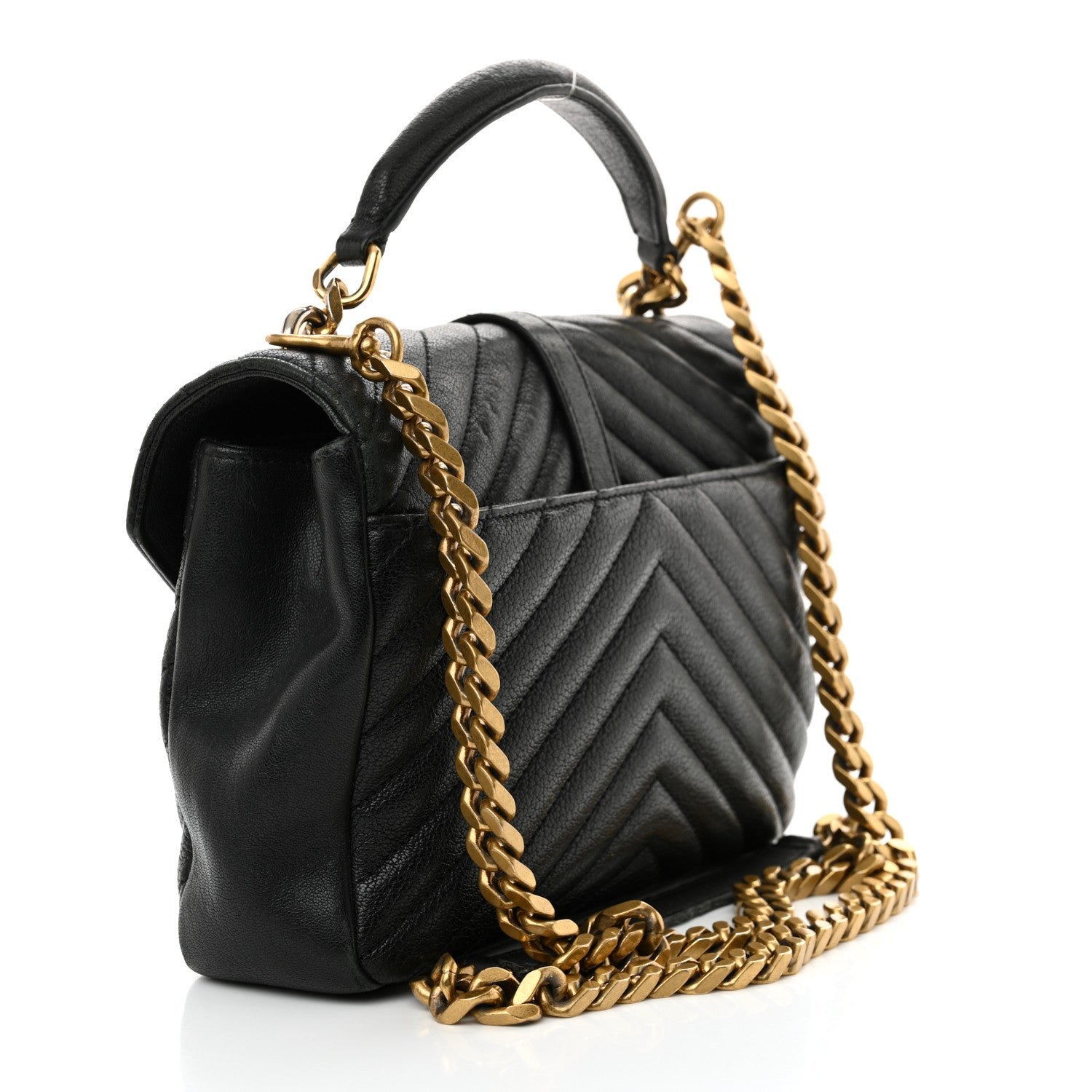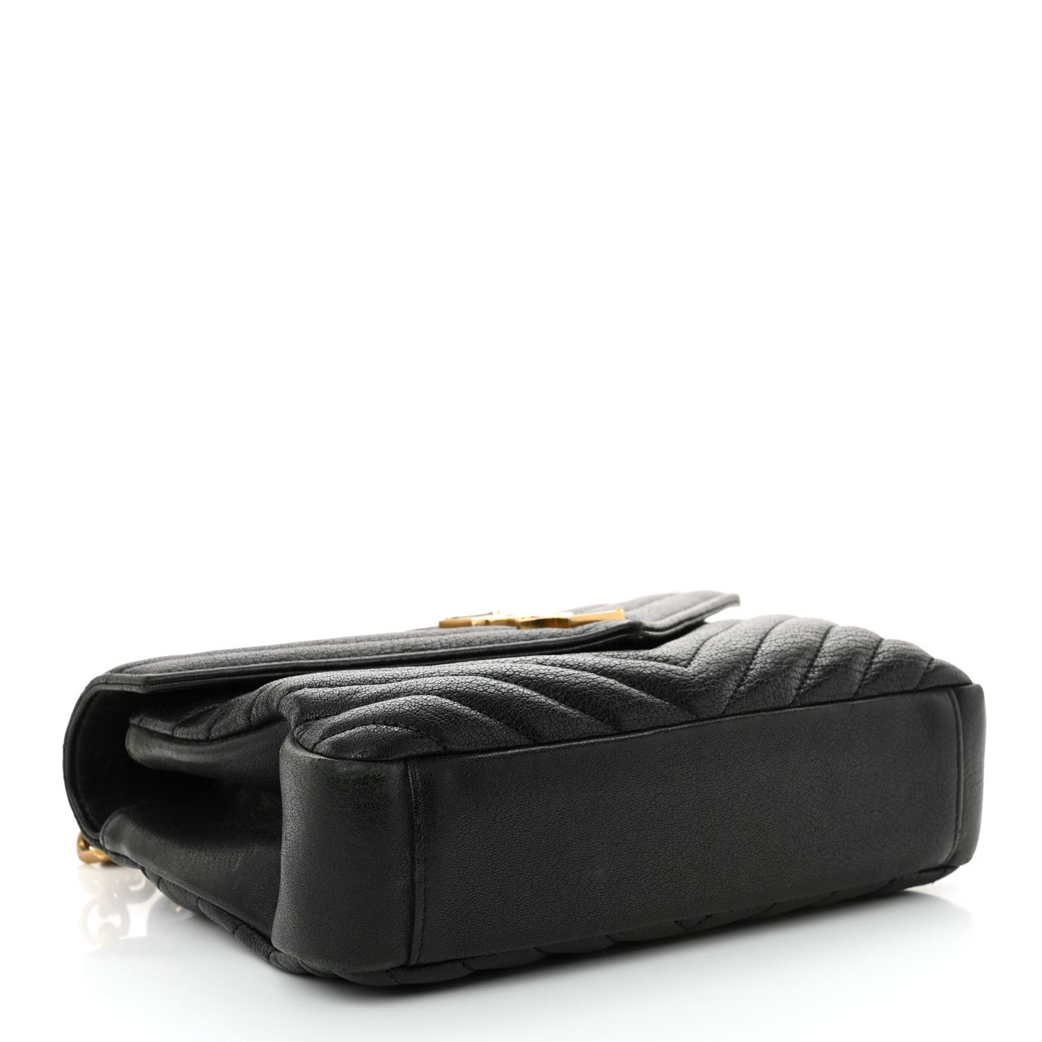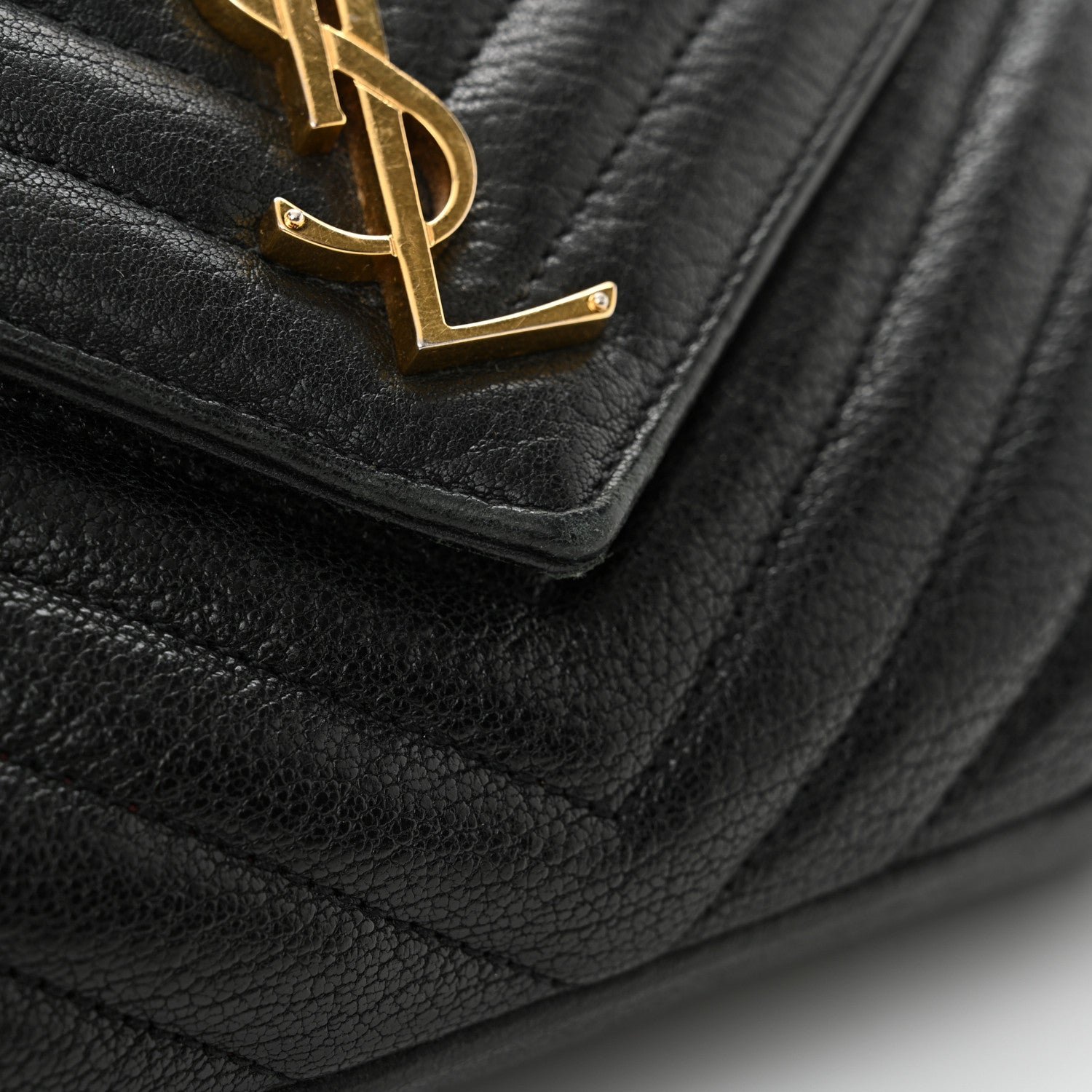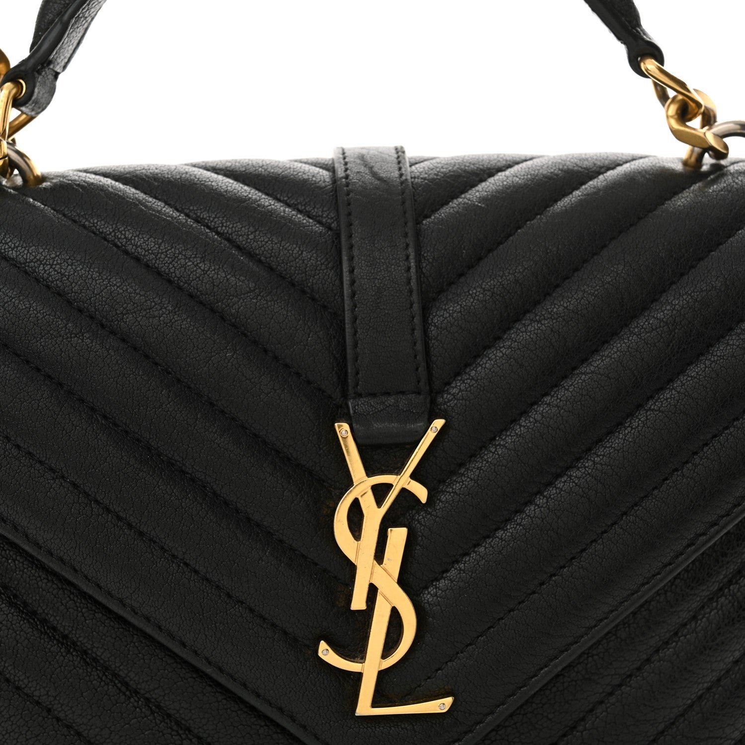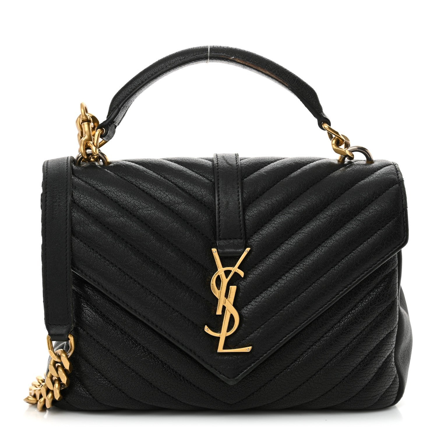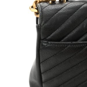 This is an authentic SAINT LAURENT Sheepskin Matelasse Chevron Monogram Medium College Bag in Black. This elegant shoulder bag features chic chevron quilted sheepskin leather in black. The bag has an optional aged gold chain-link shoulder strap with a leather shoulder pad and leather top handle. The frontal flap features a prominent aged gold YSL monogram detail and opens to a partitioned black fabric and leather interior with a patch pocket and a central zippered compartment.