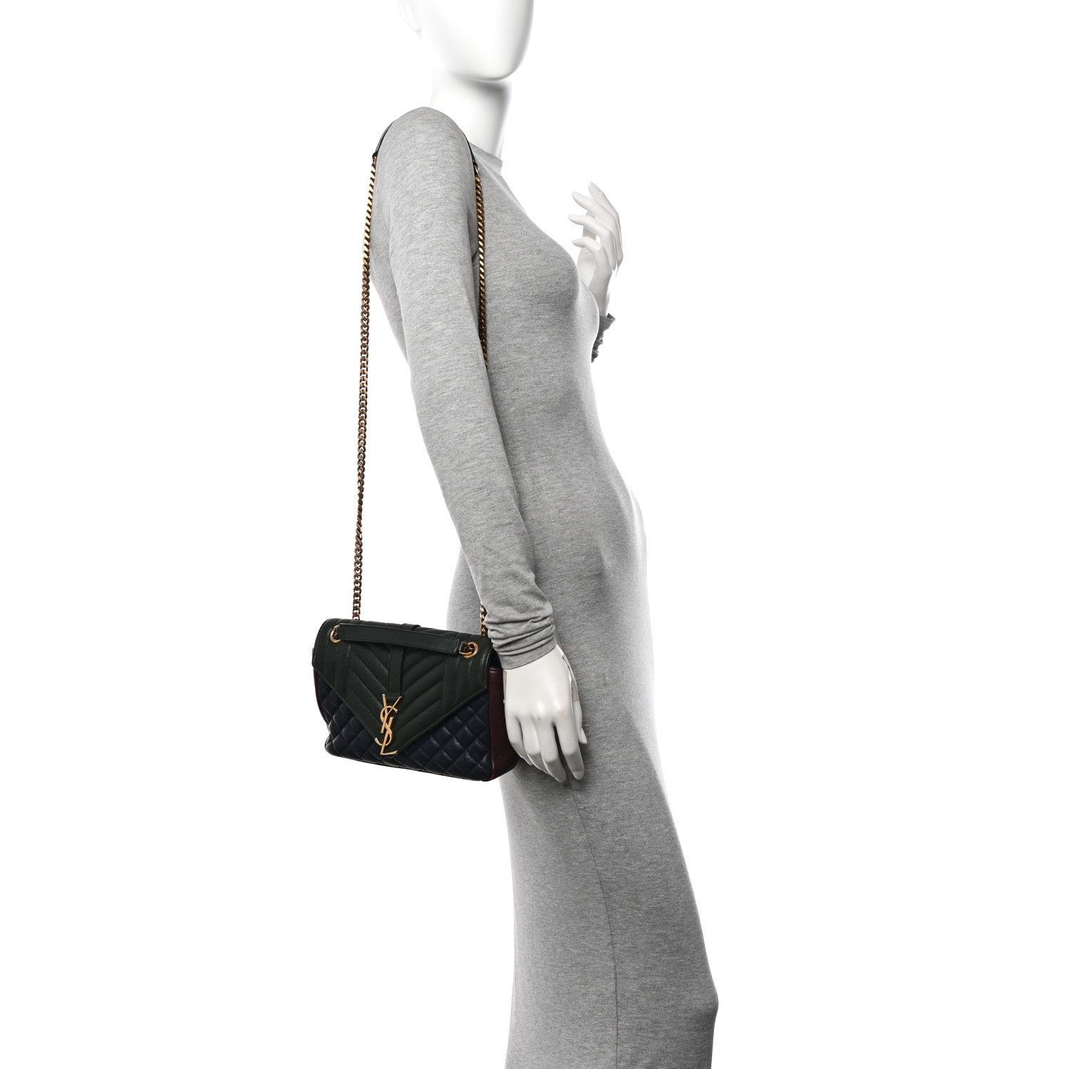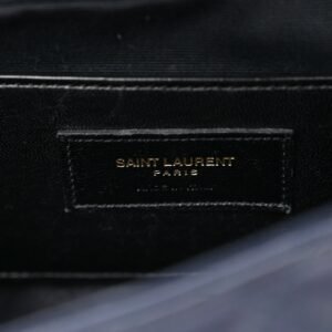 This is an authentic SAINT LAURENT Sheepskin Tri-Color Tri-Quilt Monogram Medium College Bag. The bag features an aged silver bijoux chain link shoulder strap with a leather shoulder pad. The frontal flap features a prominent gold YSL monogram detail and opens to a black fabric interior with a patch pocket.