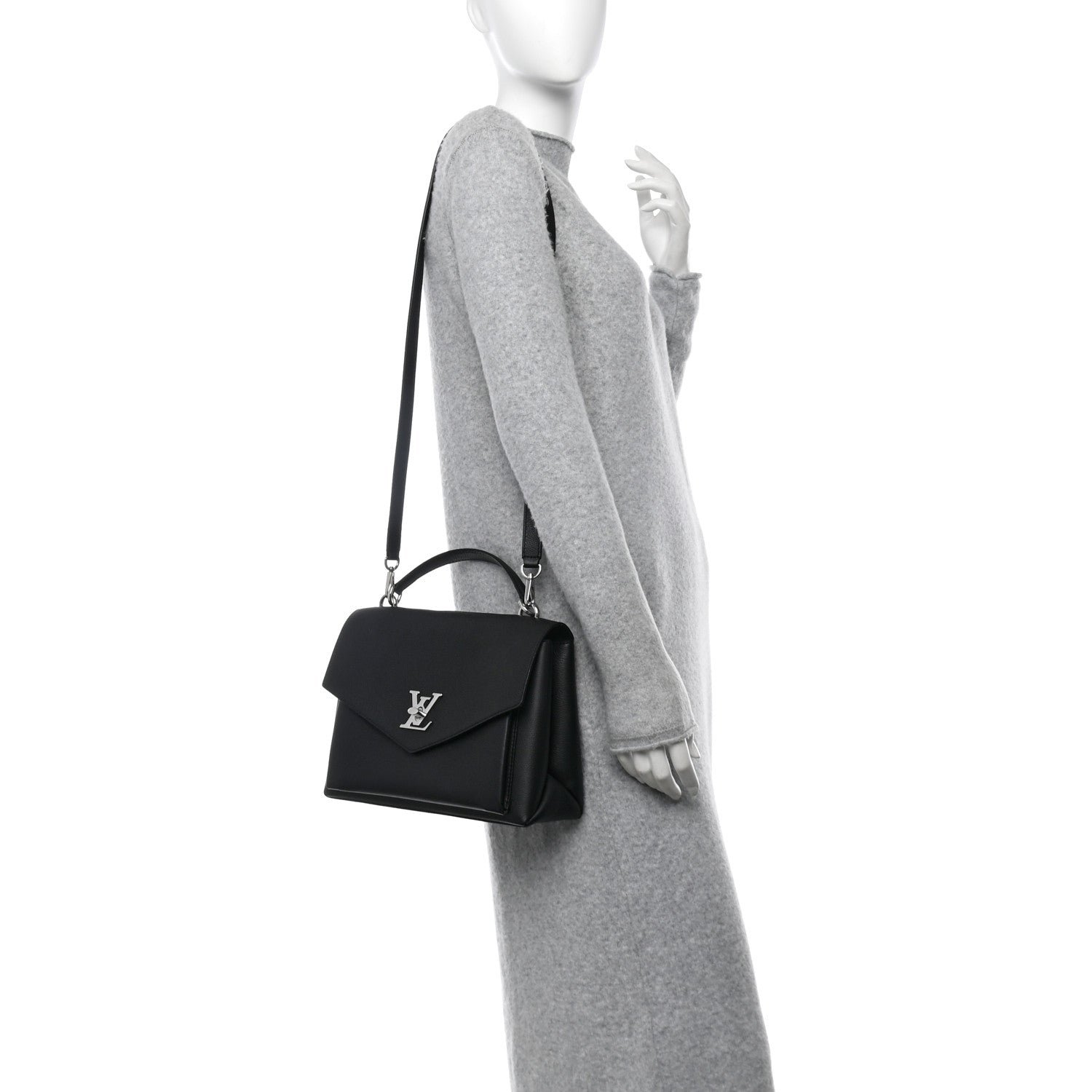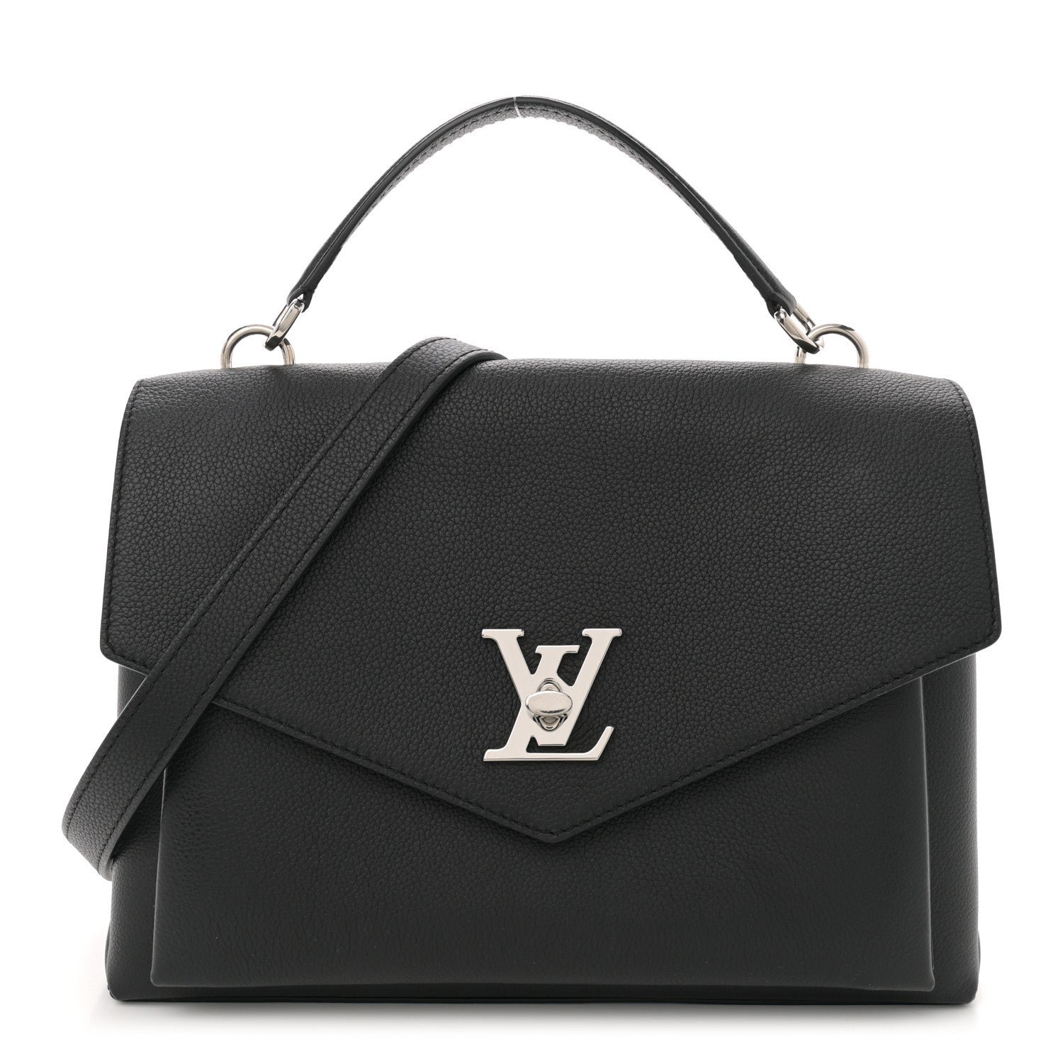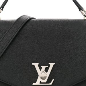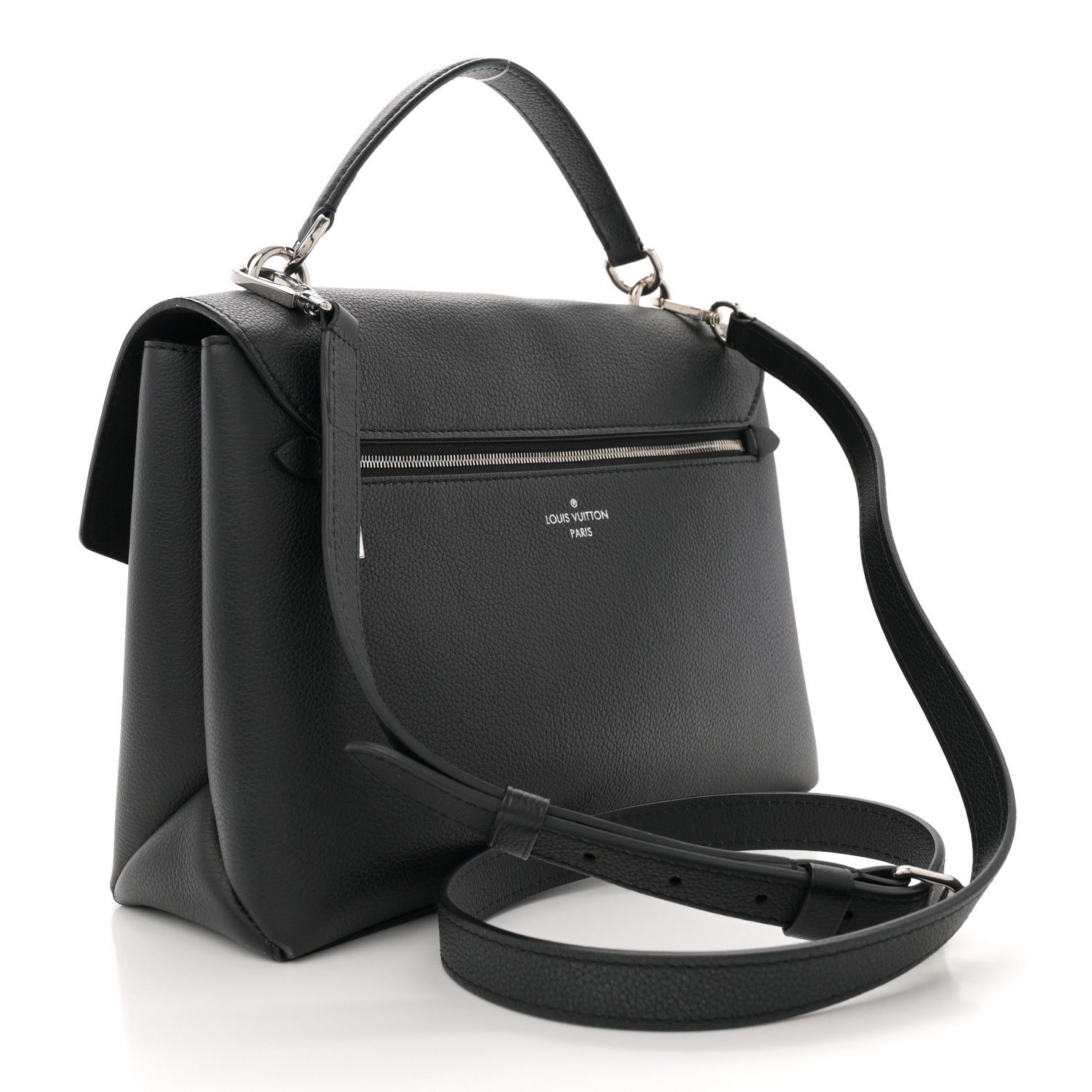 This is an authentic LOUIS VUITTON Soft Calfskin My Lockme Top Handle in Black. This chic small handbag is crafted of grained calfskin leather in black. The bag features a leather strap top handle. an optional adjustable shoulder strap. and a facing flap pocket with a silver Louis Vuitton turn lock. This opens to a partitioned microfiber interior with pockets.