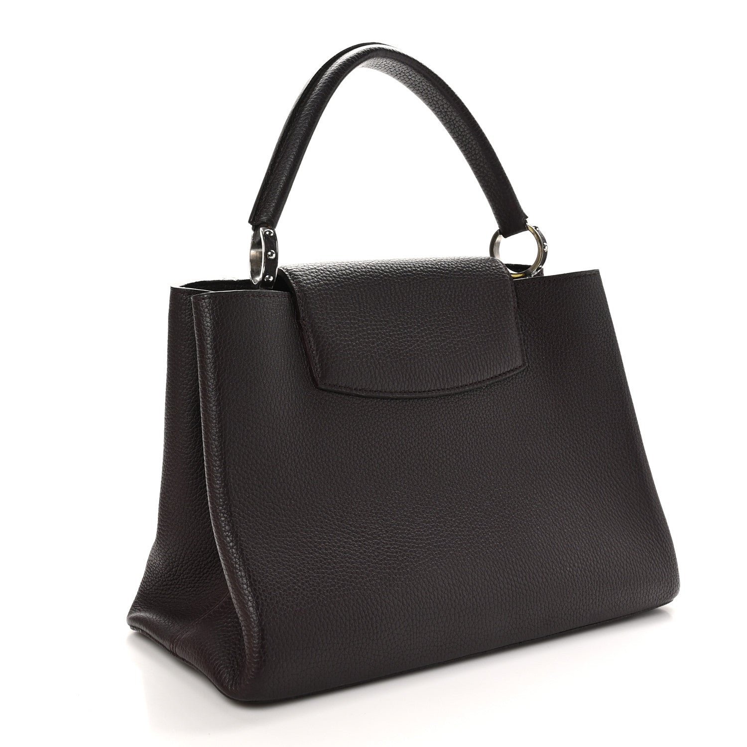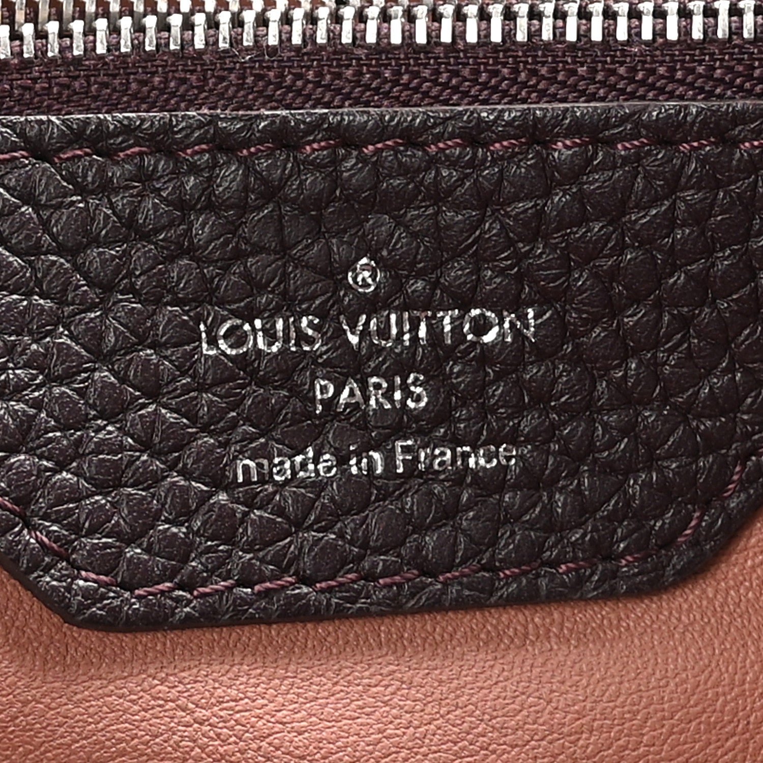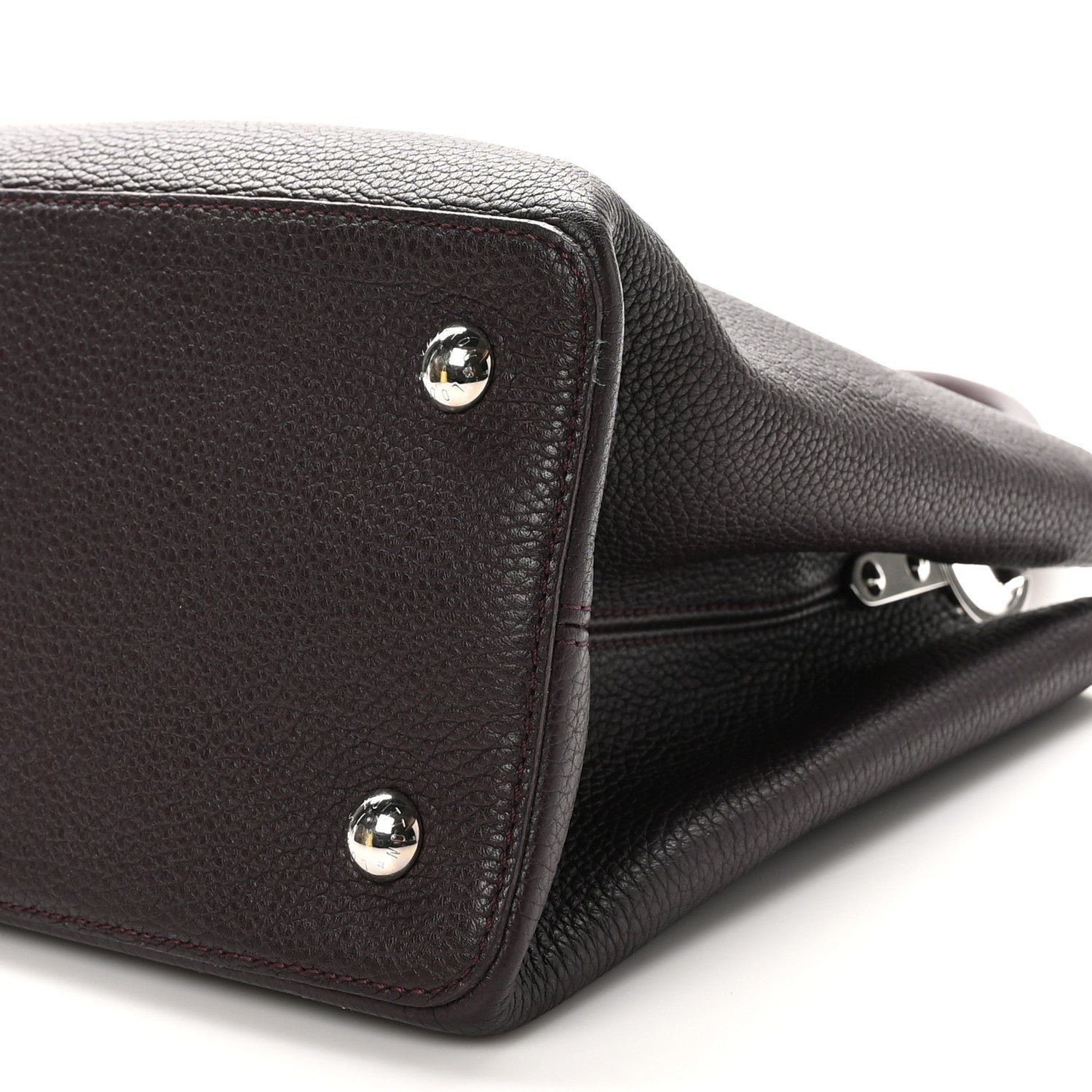 This is an authentic LOUIS VUITTON Taurillon Capucines MM in Quetsche. This stylish handbag tote is crafted of beautifully textured Taurillon calfskin leather in dark purple. The bag features a reinforced looping rolled leather top handle with polished silver ring links and a leather lined silver Louis Vuitton logo. The interior is apartitionedbeige pink leather with a patch pocket and a central zipper compartment.