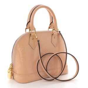 This is an authenticLOUIS VUITTON Vernis Alma BB in Rose Angelique. This is a chic Alma that is finely crafted of light pink monogram-embossed patent leather. The bag features rolled leather top handles. and an optional shoulder strap with polished brass hardware. The wrap-around zippers open the bag to a matching light pink fabric interior with a pocket.