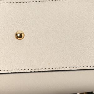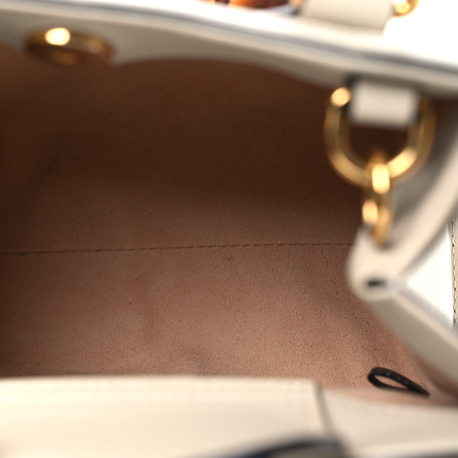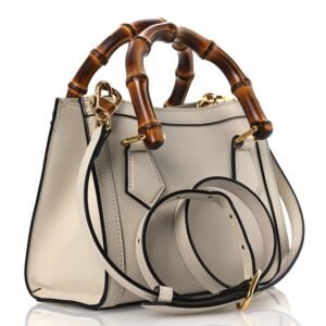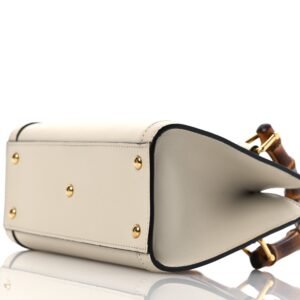 This is an authenticGUCCI Wonka Grain Calfskin Mini Diana Tote Bag in Mystic White.This handbagis crafted of off white calfskin leather with sturdy bamboo top handles. The bag alsofeatures an aged gold Gucci GG logo on the front and a magnetic snap closure. This opens to a beige microfiber interior.