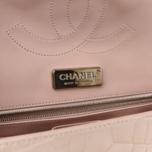 This is an authentic CHANEL Alligator Jumbo Double Flap in Light Pink. This stylish shoulder bag is crafted of pink alligator leather. The bag features a polished silver chain shoulder strap interwoven with pink leather and a full frontal flap with the classic CC turn lock. the back of the bag features the slip pocket. The double flap opens to a matching pink leather interior with zipper pocket. two patch pockets. and a Chanel lip stick slip pocket in the main compartment.