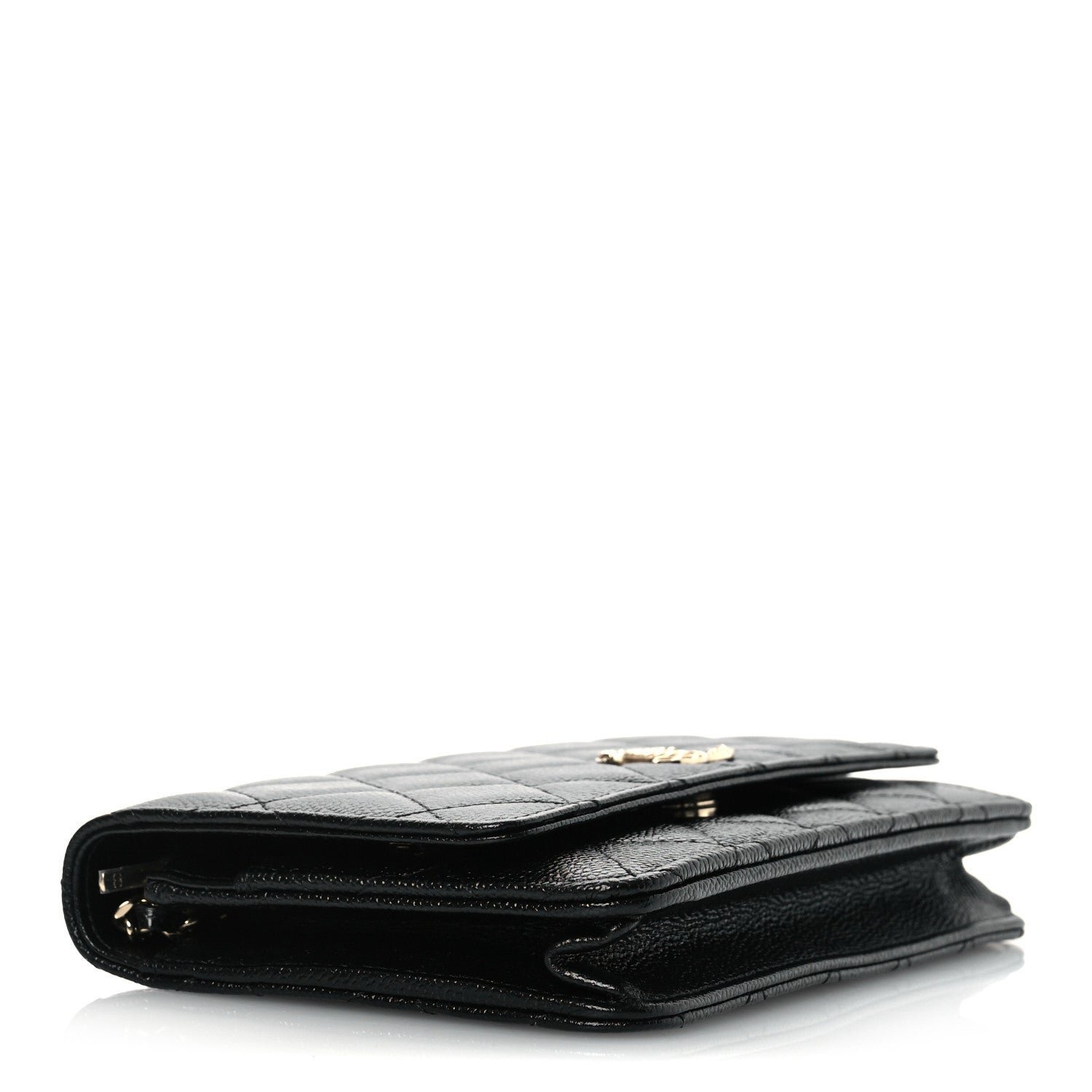 This is an authentic CHANEL Caviar Quilted Chain CC Wallet On Chain WOC in Black. This stylish wallet is crafted of luxuriously textured diamond quilted caviar leather in black. This shoulder bag featuresa polished gold chain-link crossbody strap and a polished gold and crystal Chanel CC logo on the facing flap. The bag opens to a black fabric interior with a zipped compartment. card slots. and patch pockets.