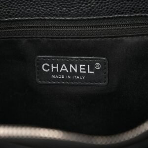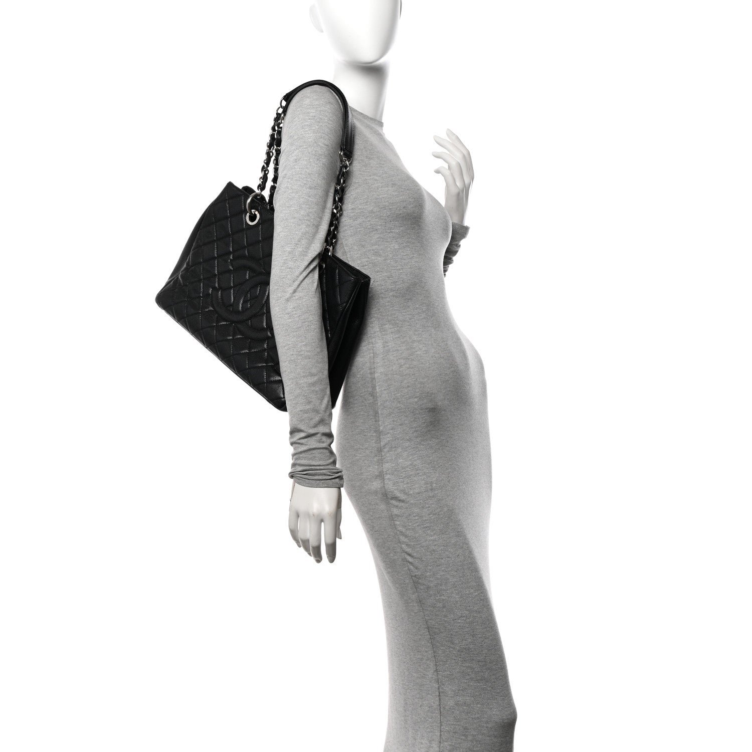 This is an authentic CHANEL Caviar Quilted Grand Shopping Tote GST in Black. This stylish tote is crafted of black diamond quilted caviar leather. This shoulder bag features leather threaded polished silver chain-link shoulder straps with shoulder pads.a quilted Chanel CC logo on the front. and a flat pocket on the rear. The top opens to a partitioned black satin interior with a central zipper compartment. zipper pocket. and patch pocket.