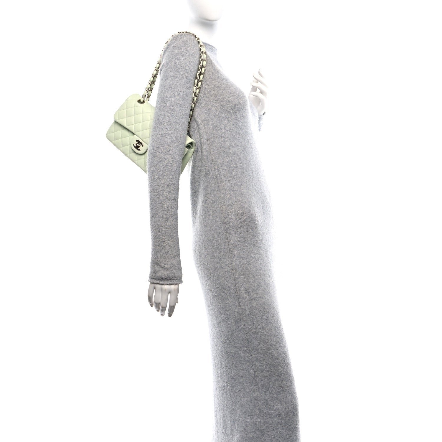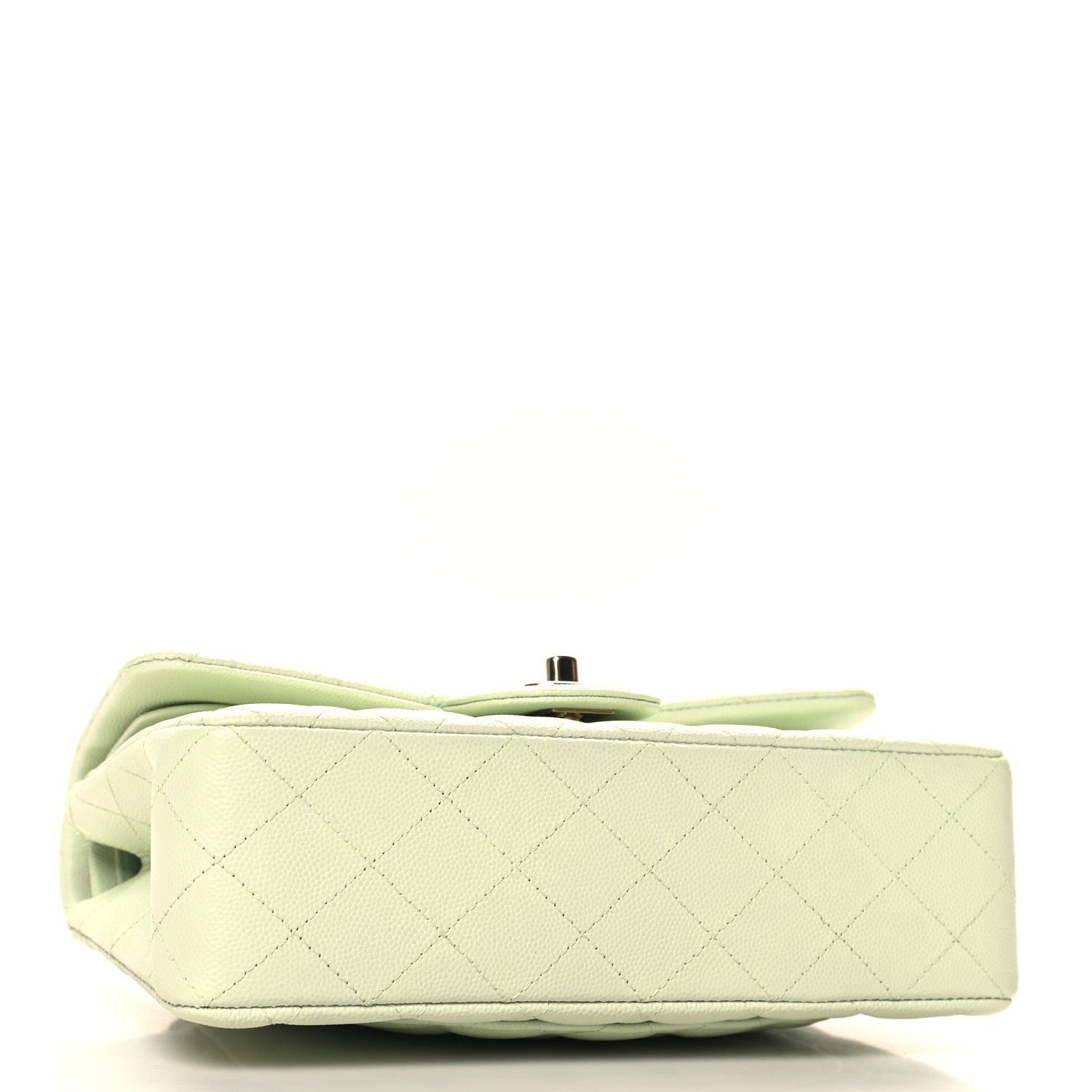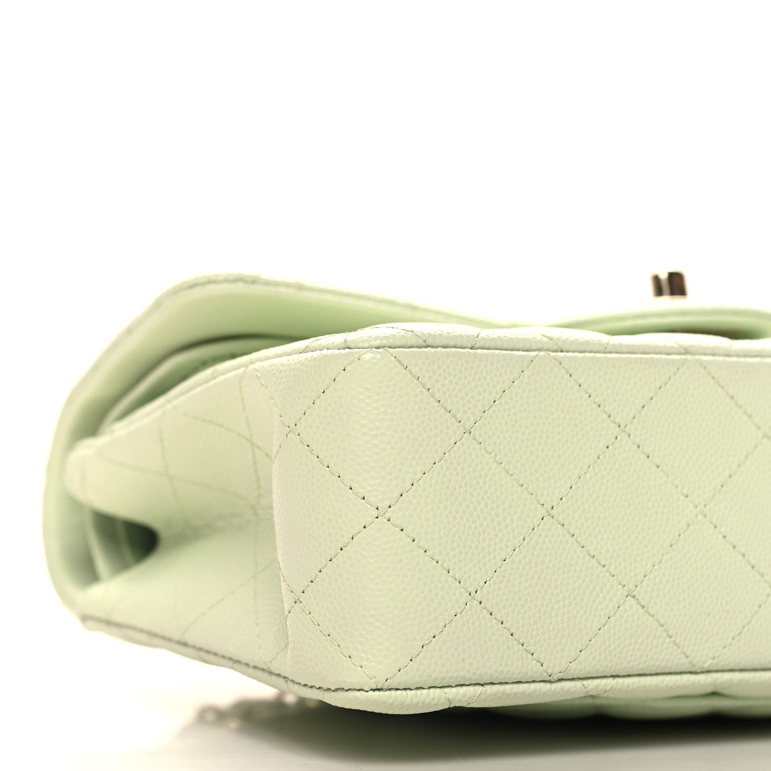 This is an authentic CHANEL Caviar Quilted Small Double Flap in Light Green. This small classic flap bag is beautifully crafted of luxurious light green caviar leather. The bag features a light gold chain-link shoulder strap threaded with leather. a crossover flap. and a light gold Chanel CC turn-lock on the front. This handbag opens to a second flap and a matching matte leather interior with patch pockets.