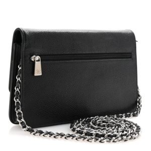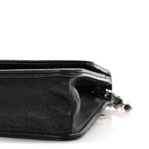 This is an authentic CHANEL Caviar Timeless CC Wallet On Chain WOC in Black. This stylish wallet is crafted of luxuriously textured caviar leather in black.with a Chanel CC logo embossed on the front. The bag features a leather threaded silver chain-link shoulder strapand a crossover flap. This opens to a black fabric and leather interior with card slots. patch pockets. and a zipper compartment.