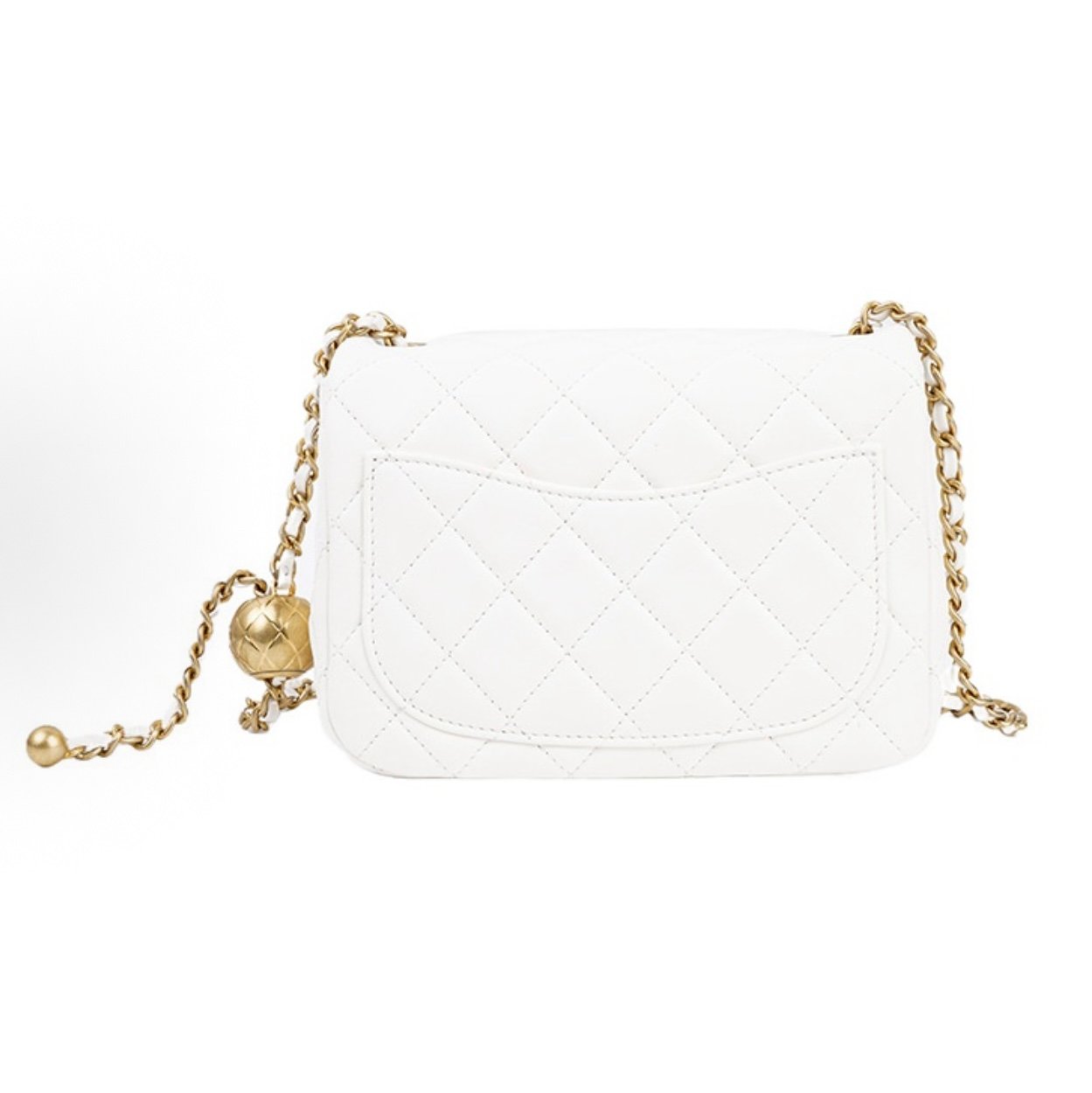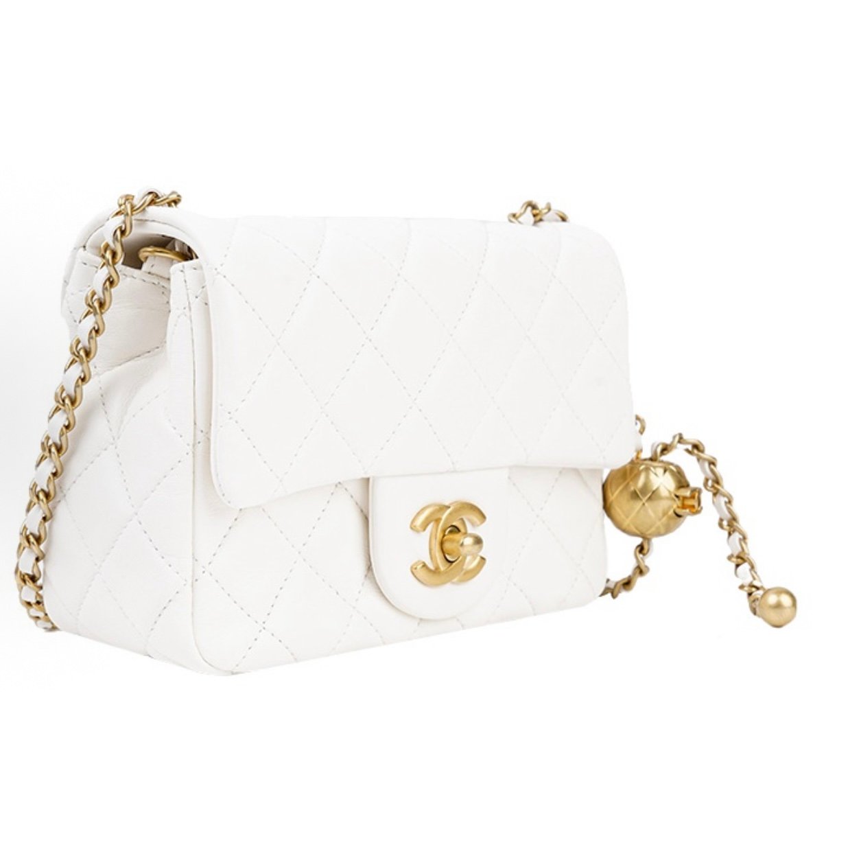 Chanel Mini Pearl Ball Flap Bag – White Quilted Leather, Gold Ball Chain
