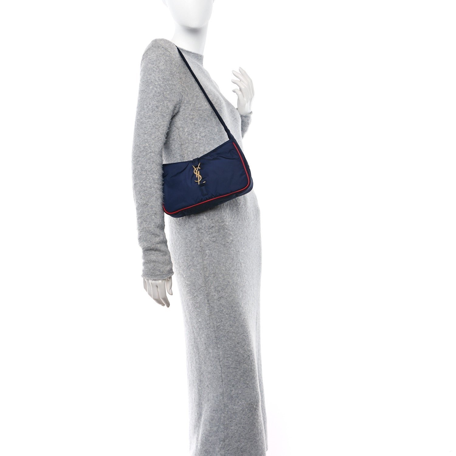 This is an authentic SAINT LAURENT Econyl Nylon Le 5 A 7 Hobo in Atlantis Rouge Eros. This shoulder bag is crafted of calfskin leather in navy blue with red trim. The bag features adjustable shoulder strap. The front features a gold prominent YSL monogram cross strap that opens to a blue nylon interior with a zipper pocket.