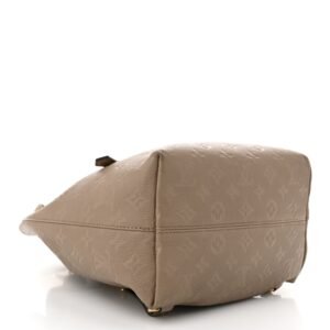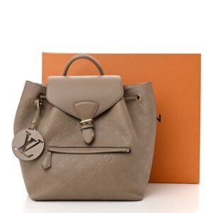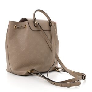 This is an authentic LOUIS VUITTON Empreinte Montsouris PM in Tourterelle. This backpack is crafted of classic Louis Vuitton empreinte leather in gray. The bag features a leather top handle adjustable shoulder straps. a front zipper pocket. and gold hardware. The crossover flap opens with a leather drawstring closure to a light pink microfiber interior with a patch pocket.