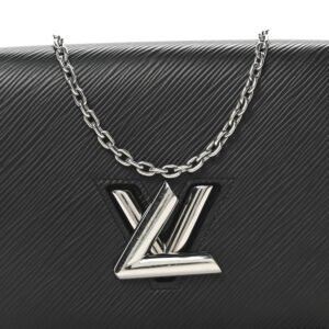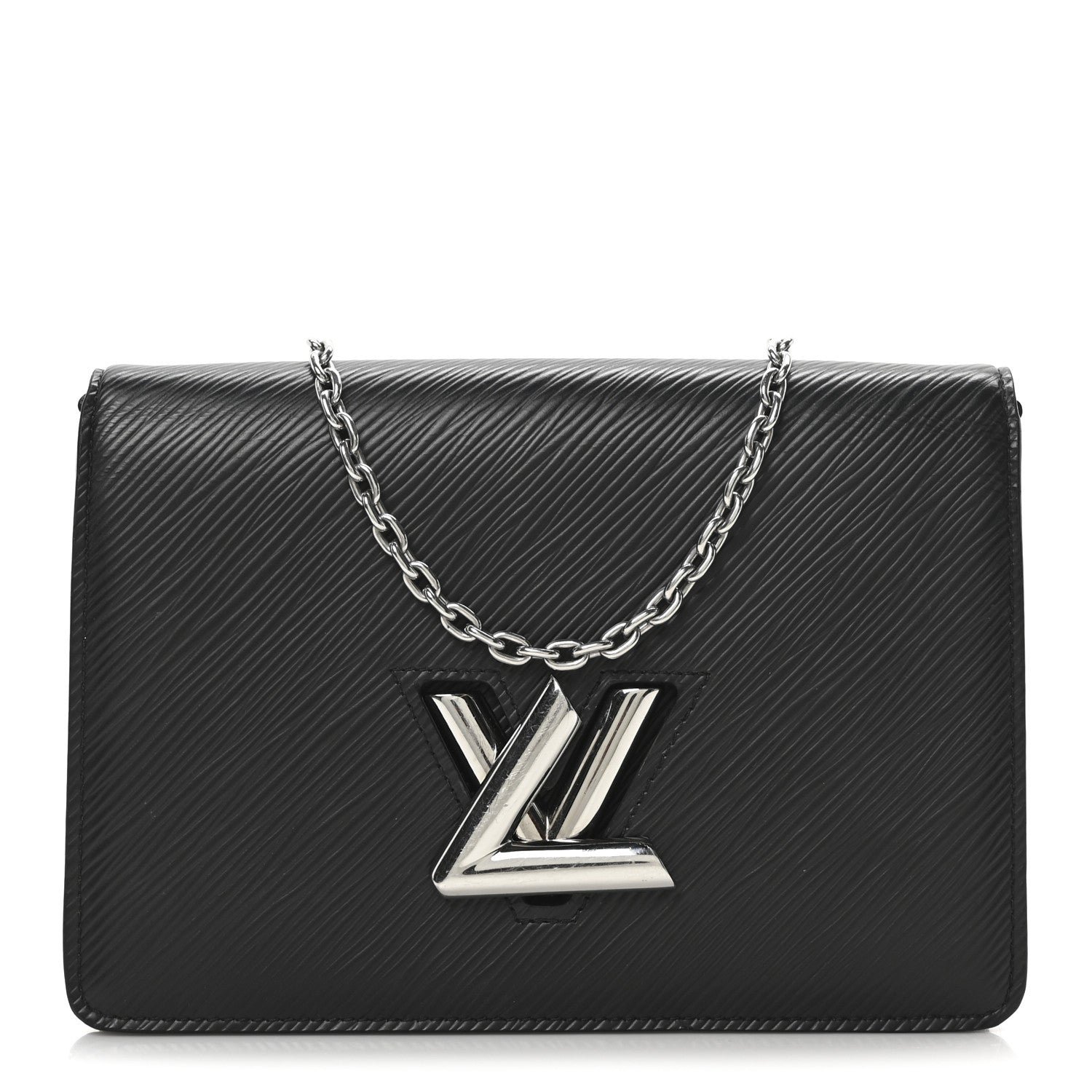 This is an authentic LOUIS VUITTON Epi Twist Chain Wallet in Black. This stylish waist-length crossbody shoulder bag is crafted of textured epileather in black. The chic bag features a polished silver chain shoulder strap and a polished silver LV twist lock on the facing flap. This opens to a black cross-grain leather interior with a patch pocket. zipper compartment. and card slots.