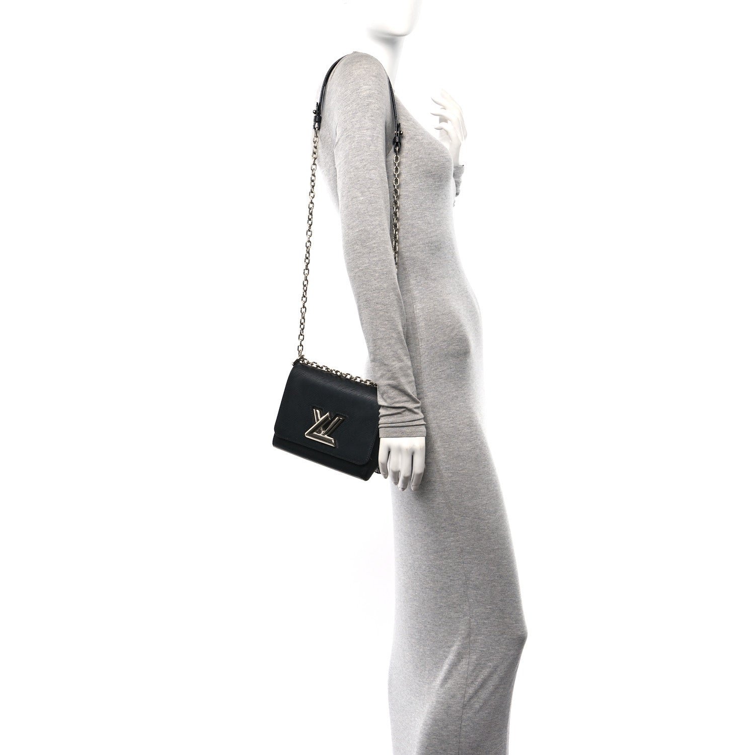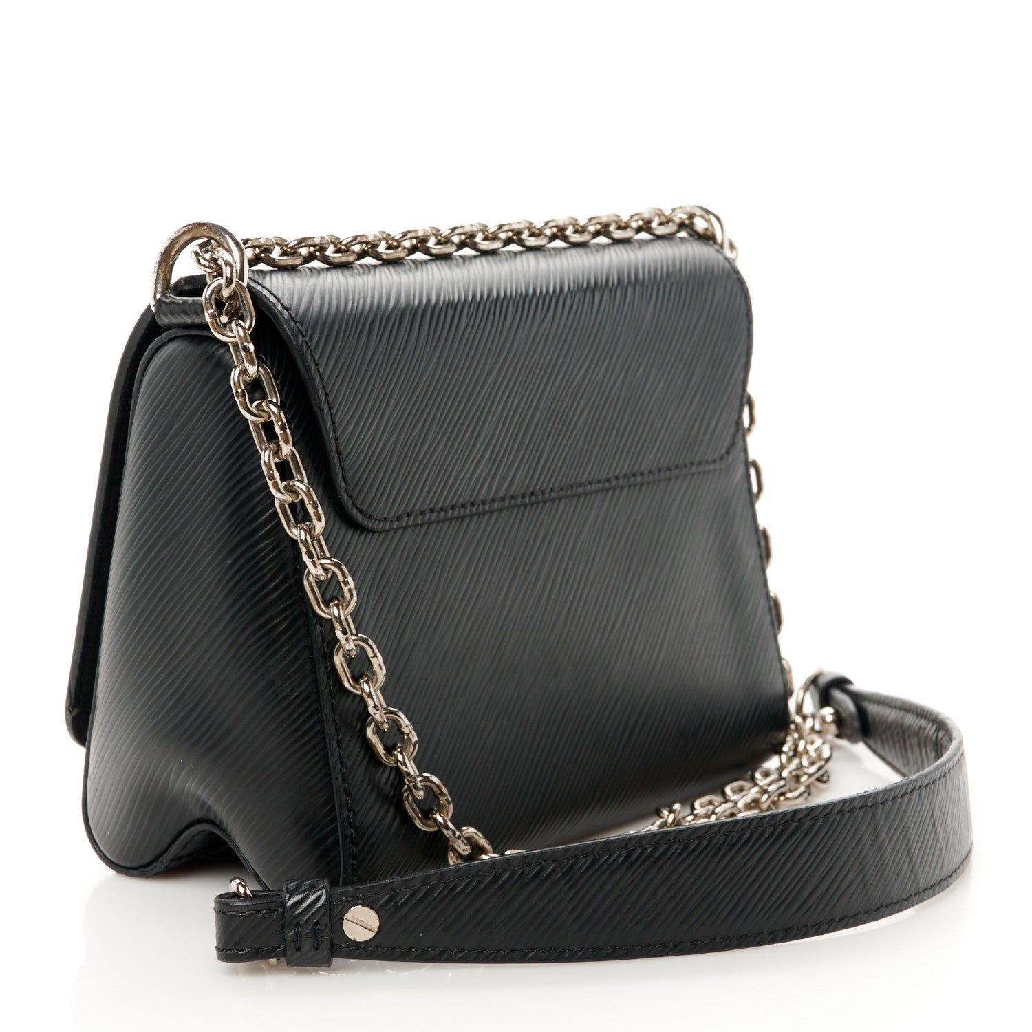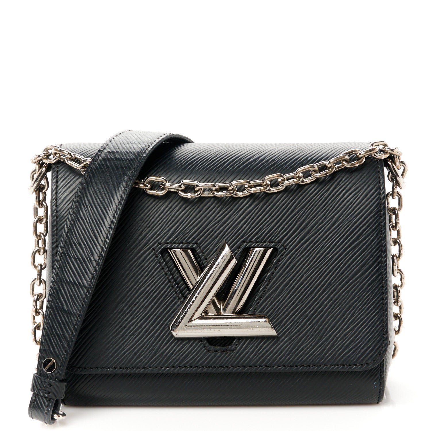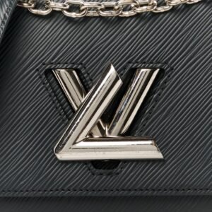 This is an authentic LOUIS VUITTON Epi Twist Shoulder Bag PM in Black. This stylish bag is crafted of textured epi leather in black. The bag features a bold. shiny silver LV on the front flap and a silver chain shoulder strap with black epi leather shoulder pad. The twist lock opens to a black microfiber interior with two small patch pockets.