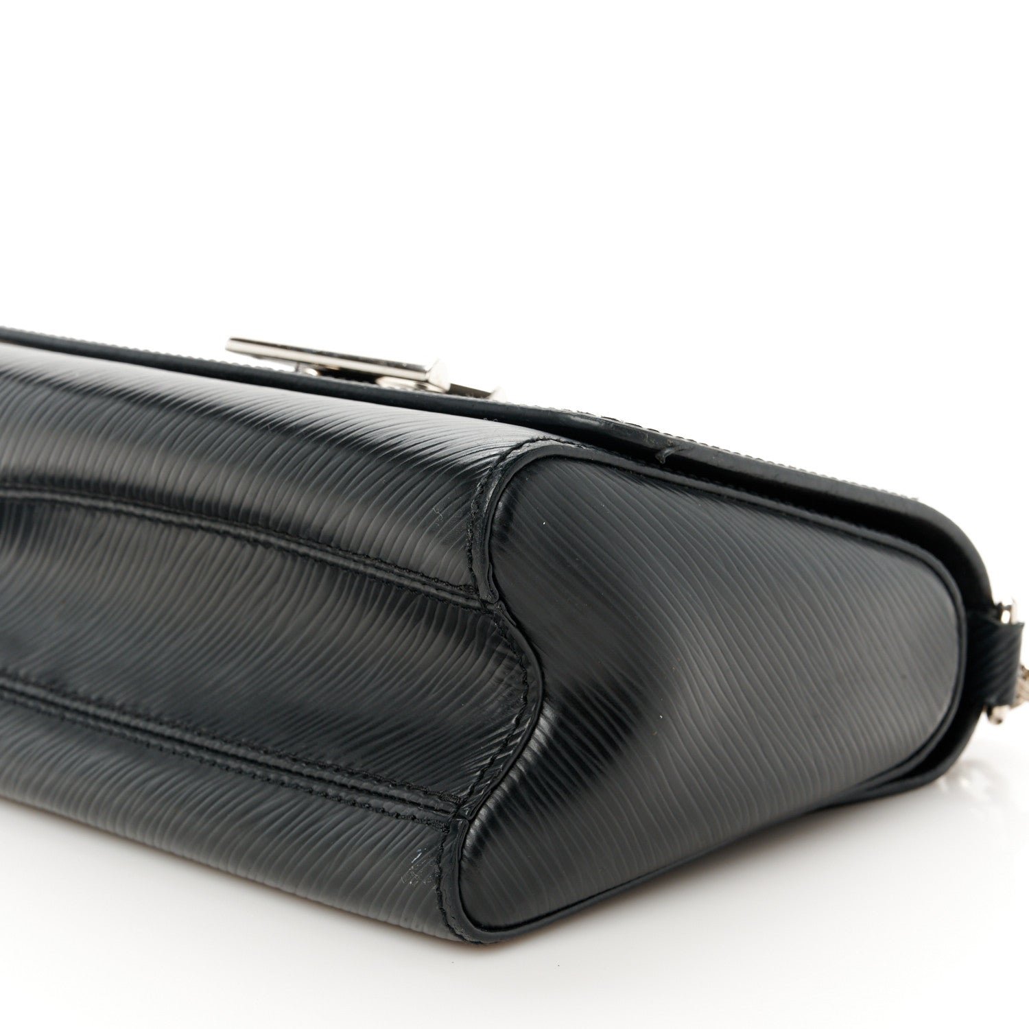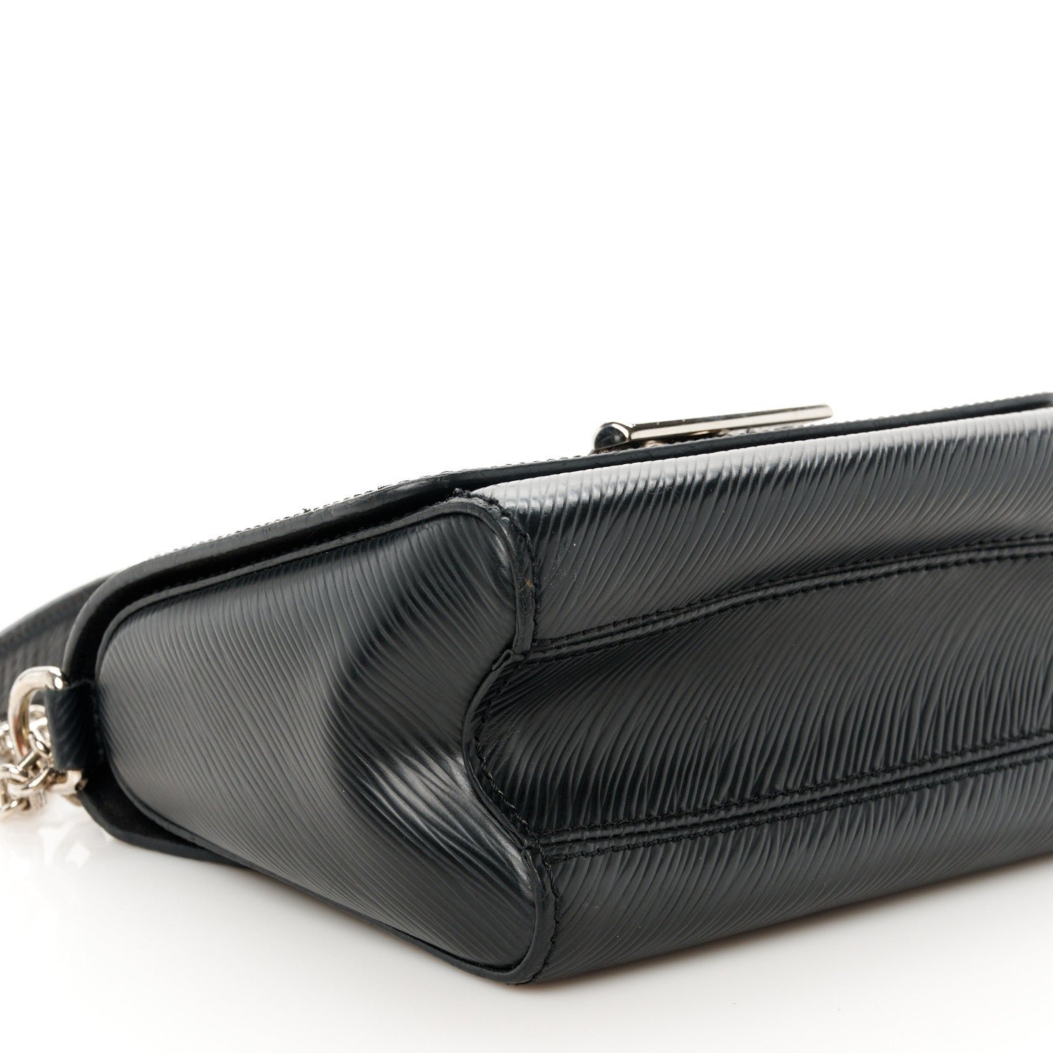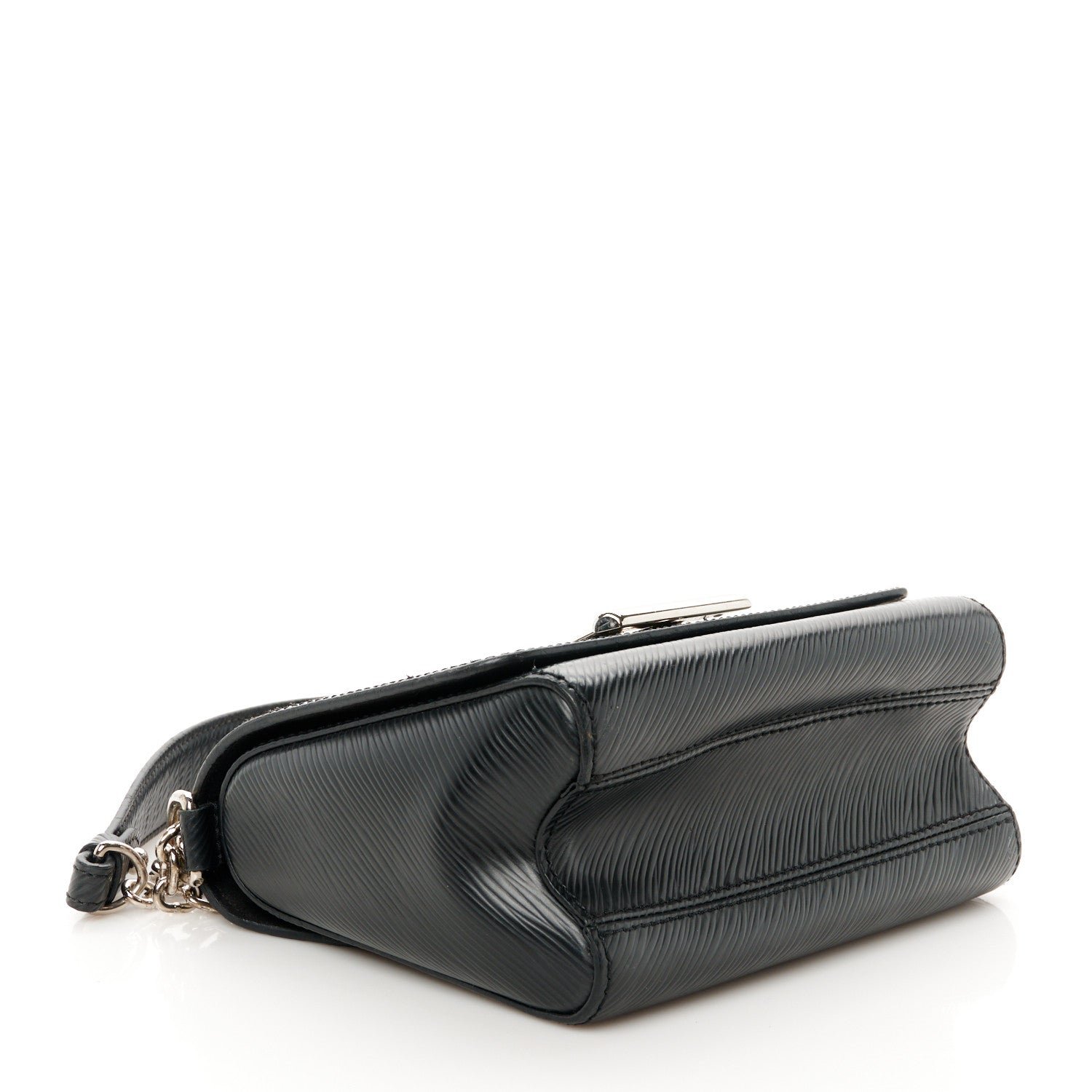 This is an authentic LOUIS VUITTON Epi Twist Shoulder Bag PM in Black. This stylish bag is crafted of textured epi leather in black. The bag features a bold. shiny silver LV on the front flap and a silver chain shoulder strap with black epi leather shoulder pad. The twist lock opens to a black microfiber interior with two small patch pockets.