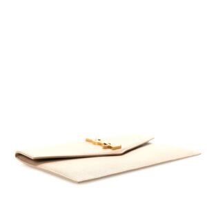 This is an authentic SAINT LAURENT Grain De Poudre Monogram Uptown Pouch in Dark Beige. This clutch is crafted of pebbled calfskin leather in beige with a prominent gold YSL emblem on the front flap. This opens to a matching leather and black fabric interior.