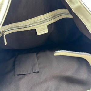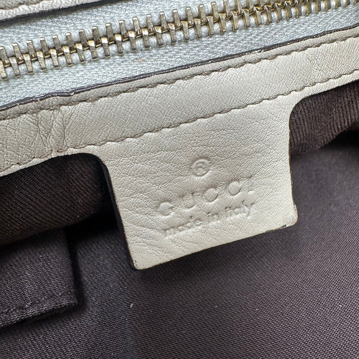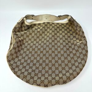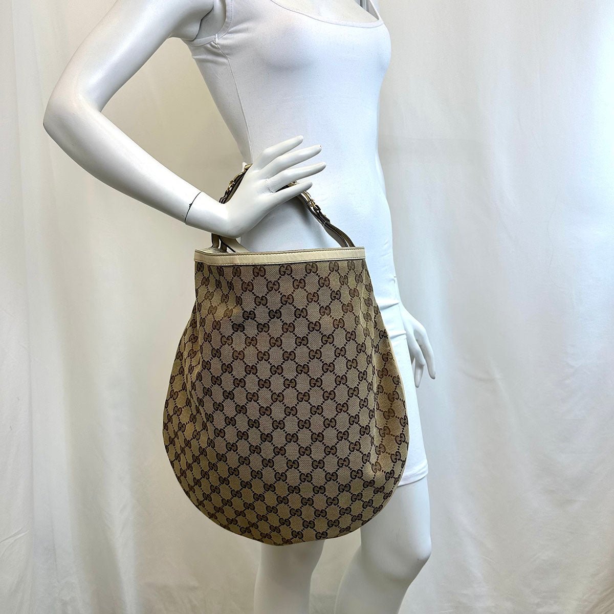Gucci Monogram Hobo with Gold-Tone Hardware. Single Shoulder Strap. Interior Zip Pocket and Open Top (Small Stains and Wear on Canvas/Leather)