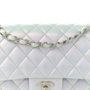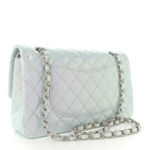 This is an authentic CHANEL Iridescent Calfskin Quilted Medium Double Flap in Light Blue. This chic shoulder bag is crafted of diamond quilted calfskin leather in iridescent light blue. The shoulder bag features a silver chain-link leather-threaded shoulder strap and a front flap with a silver classic CC turn-lock. This opens to reveal an inner flap and a matching iridescent light blue leather interior with patch pockets.
