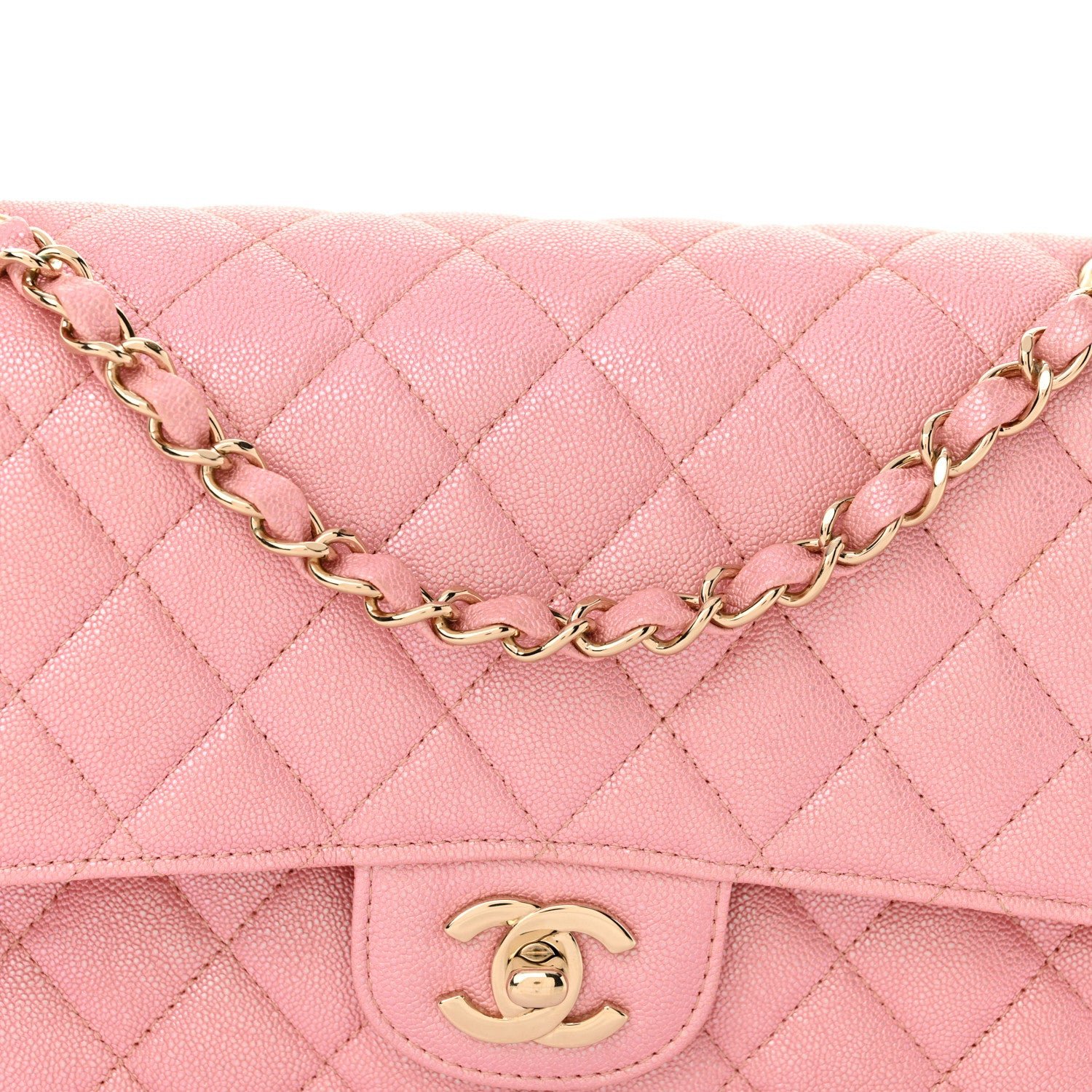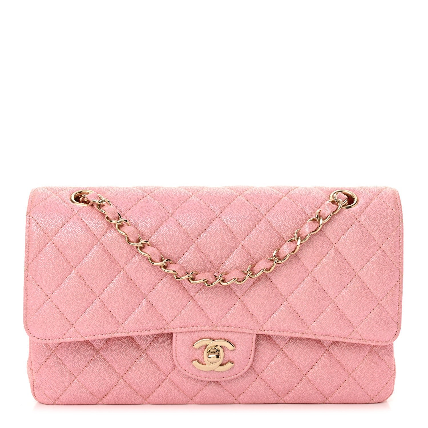 This is an authentic CHANEL Iridescent Caviar Quilted Medium Double Flap in Rose Pink. This stylish shoulder bag is crafted of luxuriously textured iridescent caviar leather with diamond quilting in rose pink. The bag features leather threaded light gold chainlink shoulder straps and a light gold Chanel CC turn lock on the front. This opens the flap to an interior flap secured with a snap and a matching smooth leather interior with patch pockets.