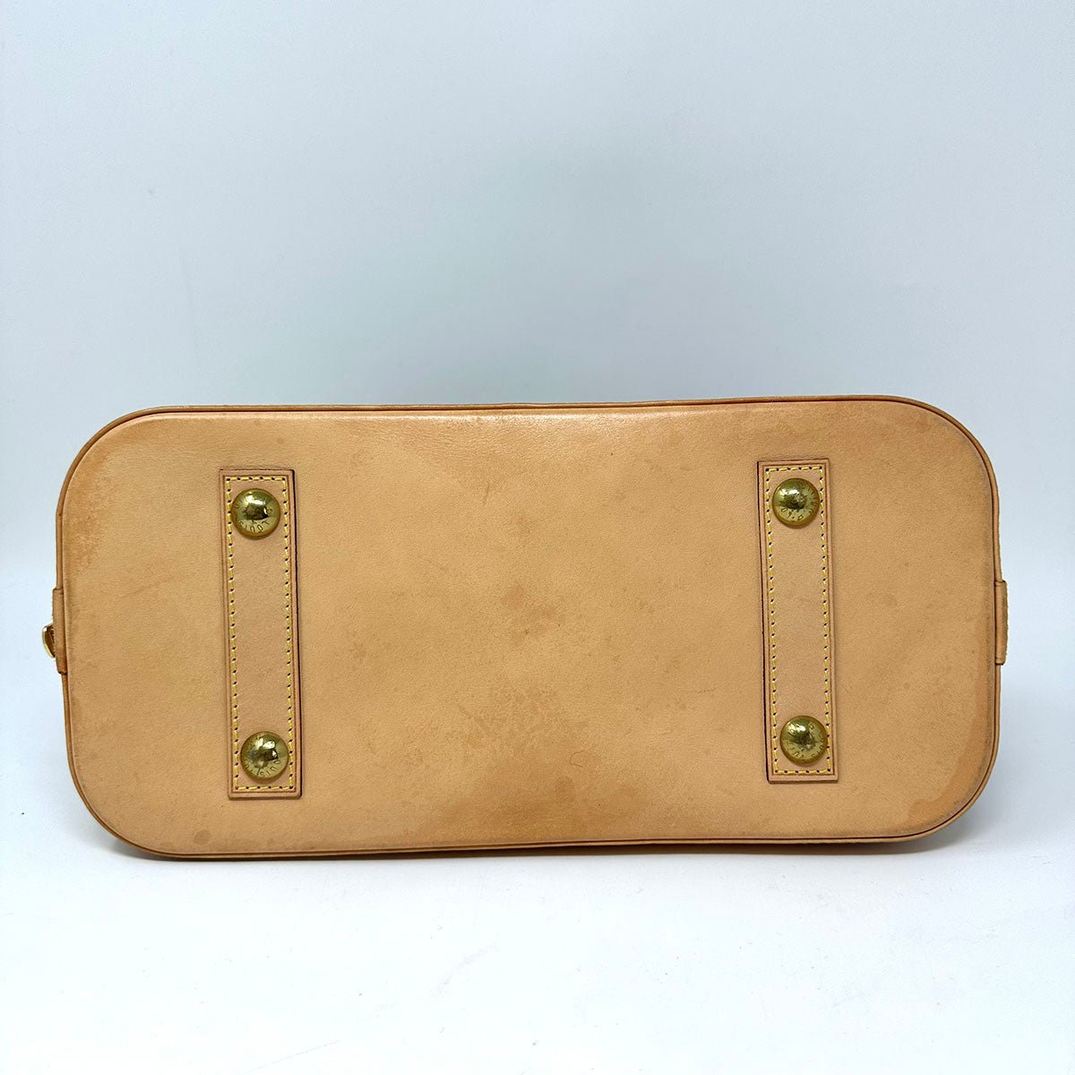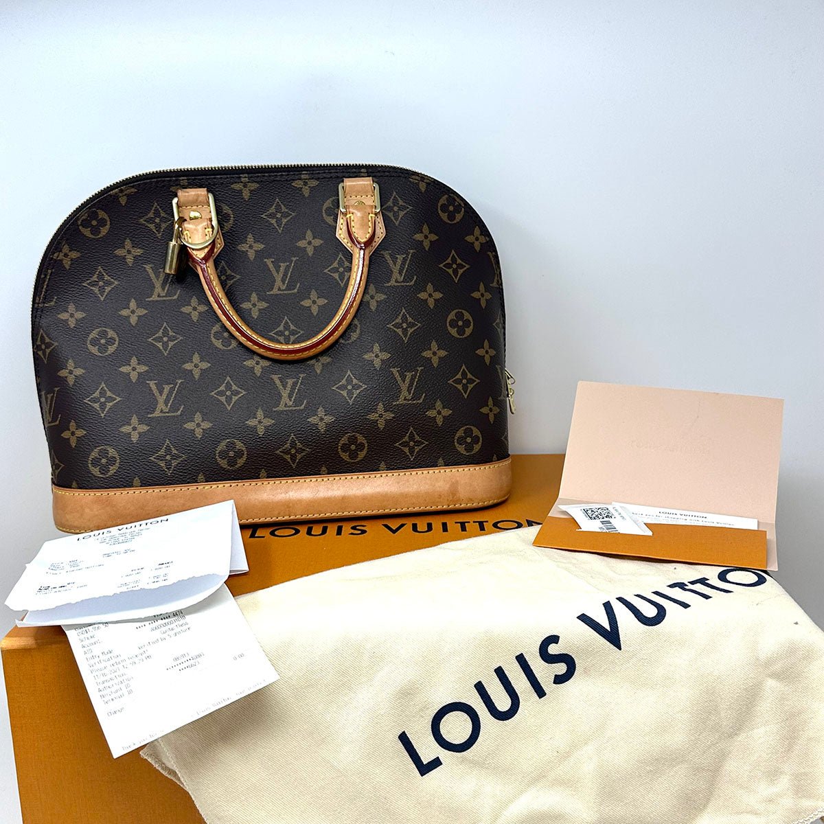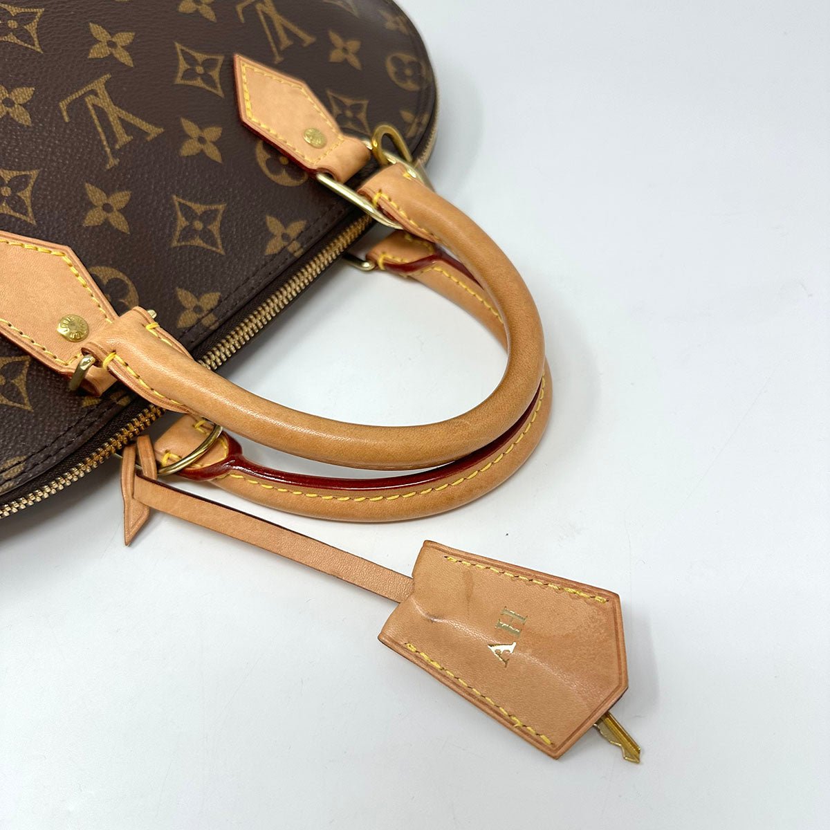Louis Vuitton Alma PM Handle Bag with Brass Hardware.Leather Trim.Key/Lock.Dual Zip Top Closure.(Initials on the Key Carrier.Strap Not Included.Some Water Staining on Bottom Trim)(Receipt.Micro Chip.Box and Cards Included )